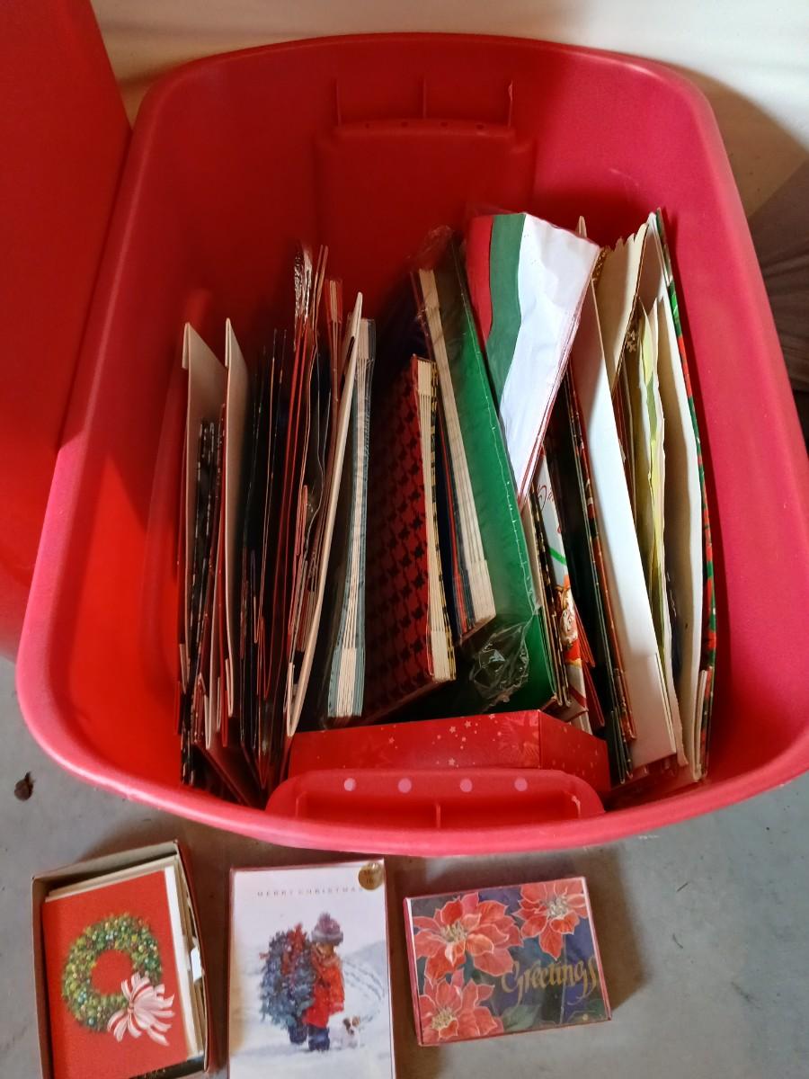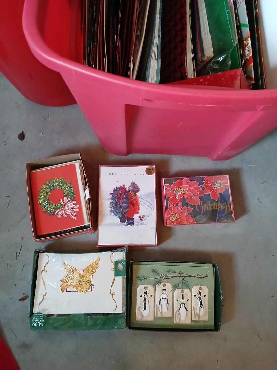One standard tote loaded with a variety of greeting cards, gift bags, tissue paper, gift tags, and boxed card sets (several new/unused)