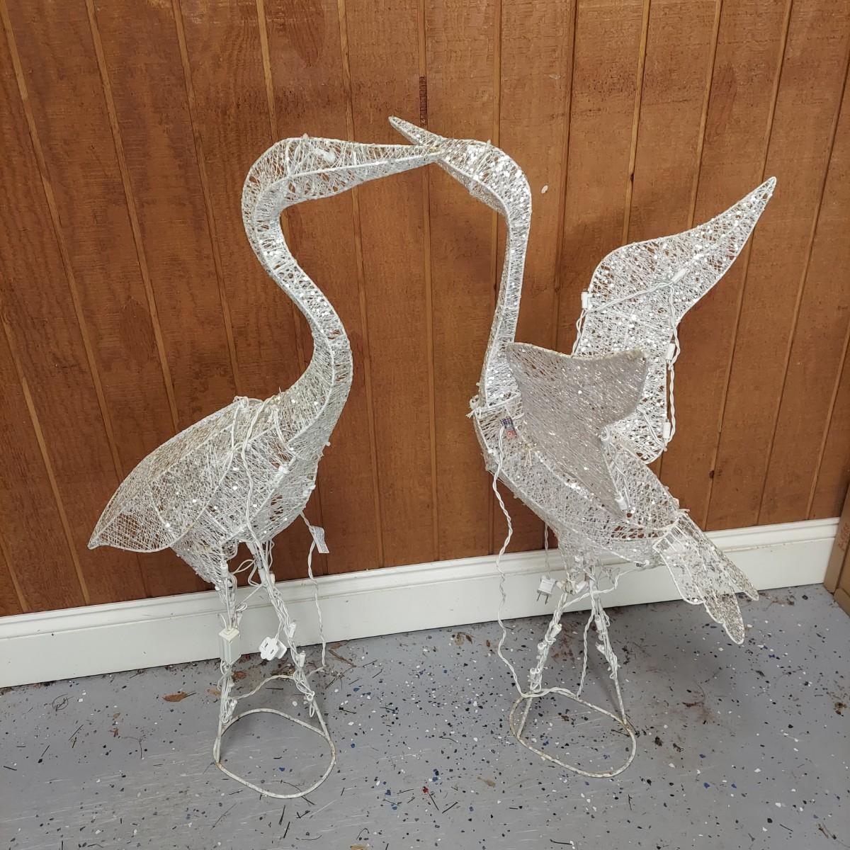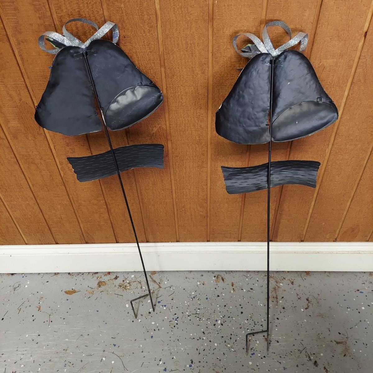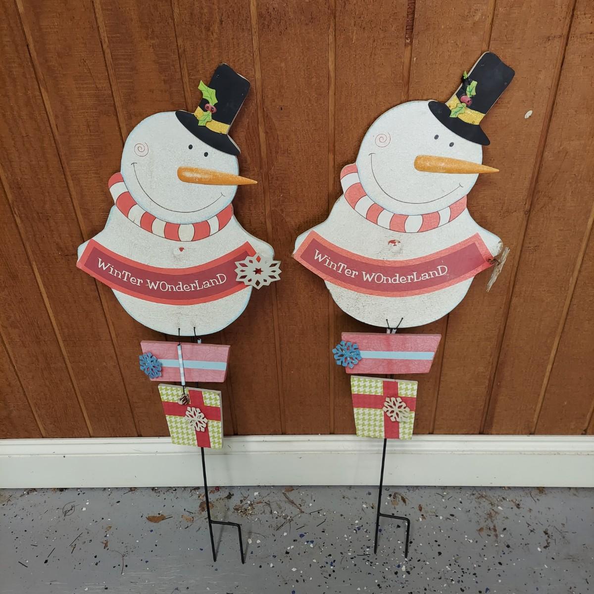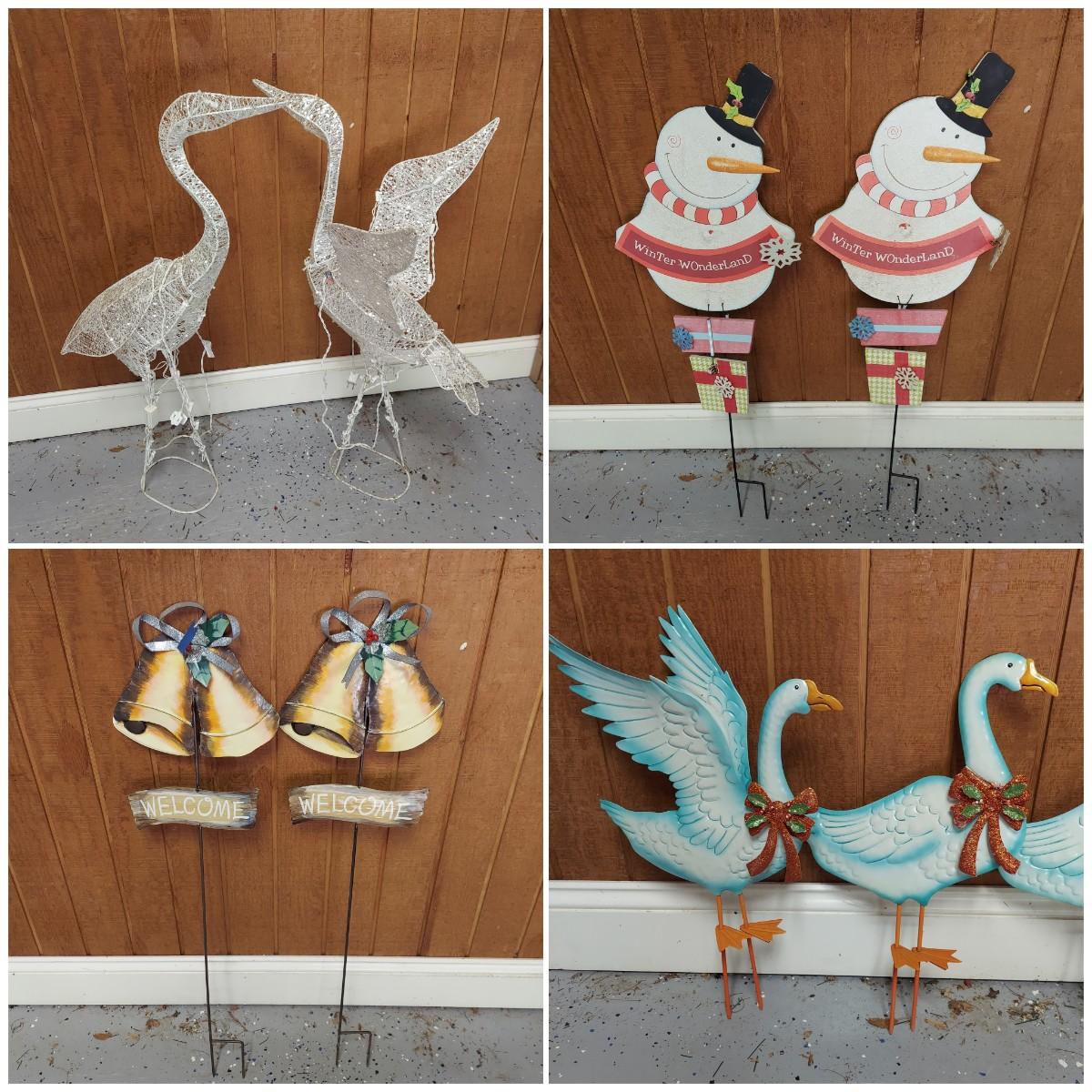 Lot includes several outdoor holiday decor items. These are approximately 37"H. There are two white glittery birds that light up. Plus two metal bells and two snowmen on stakes. Also six metal birds that can be removed from their stakes. The birds were plugged in and powered on. Local Pickup Only