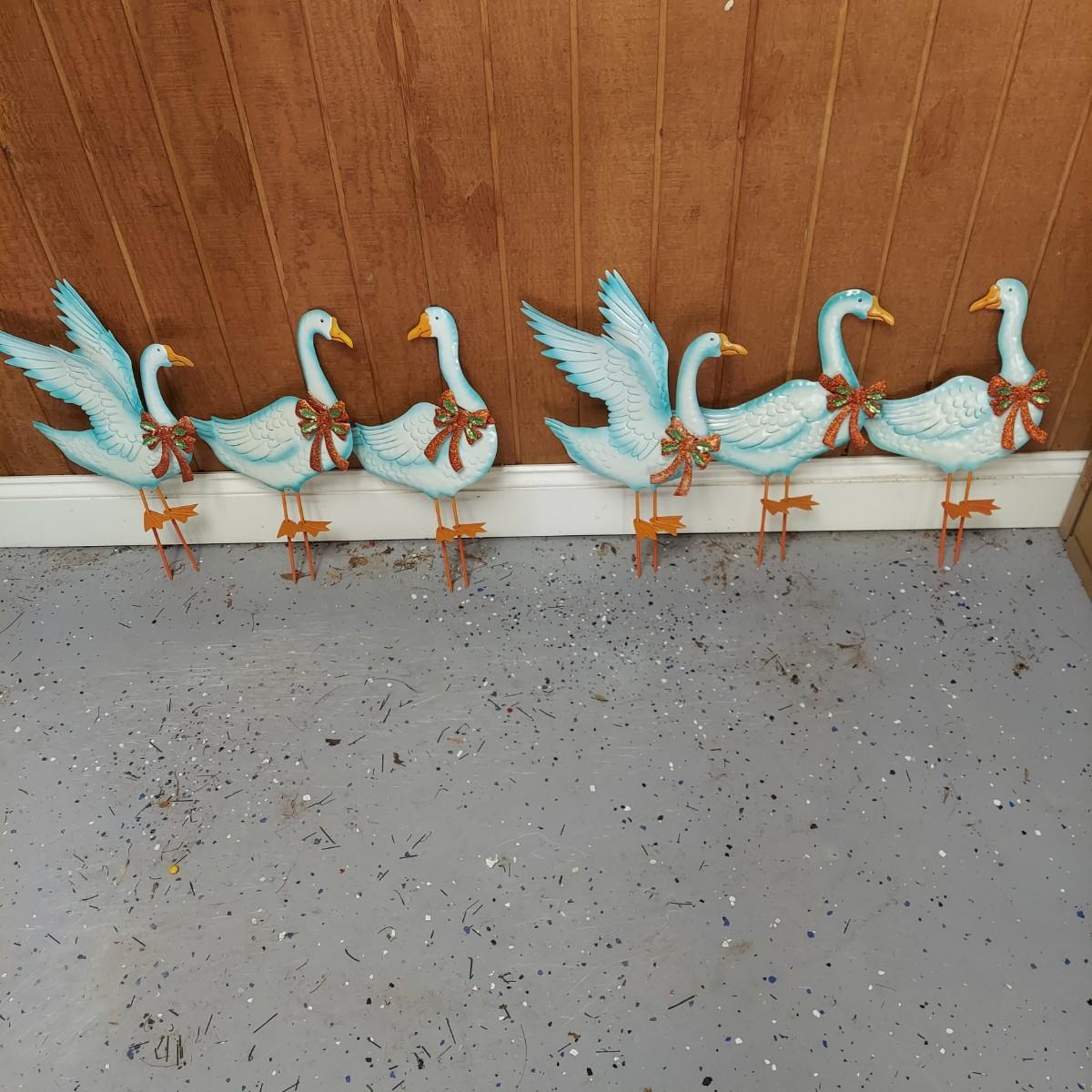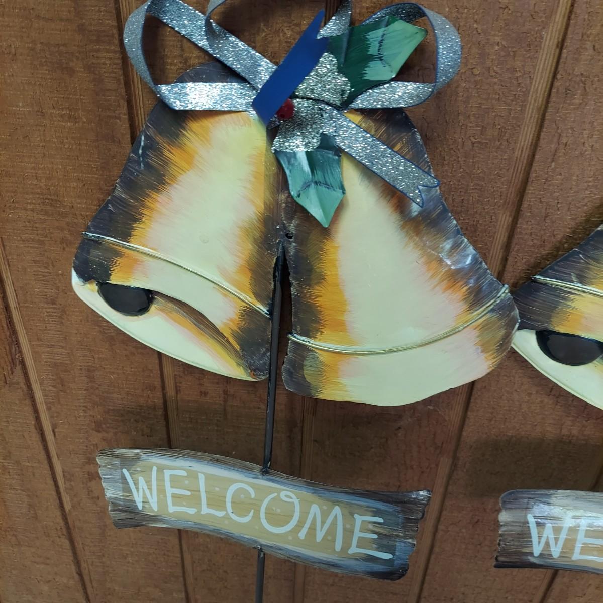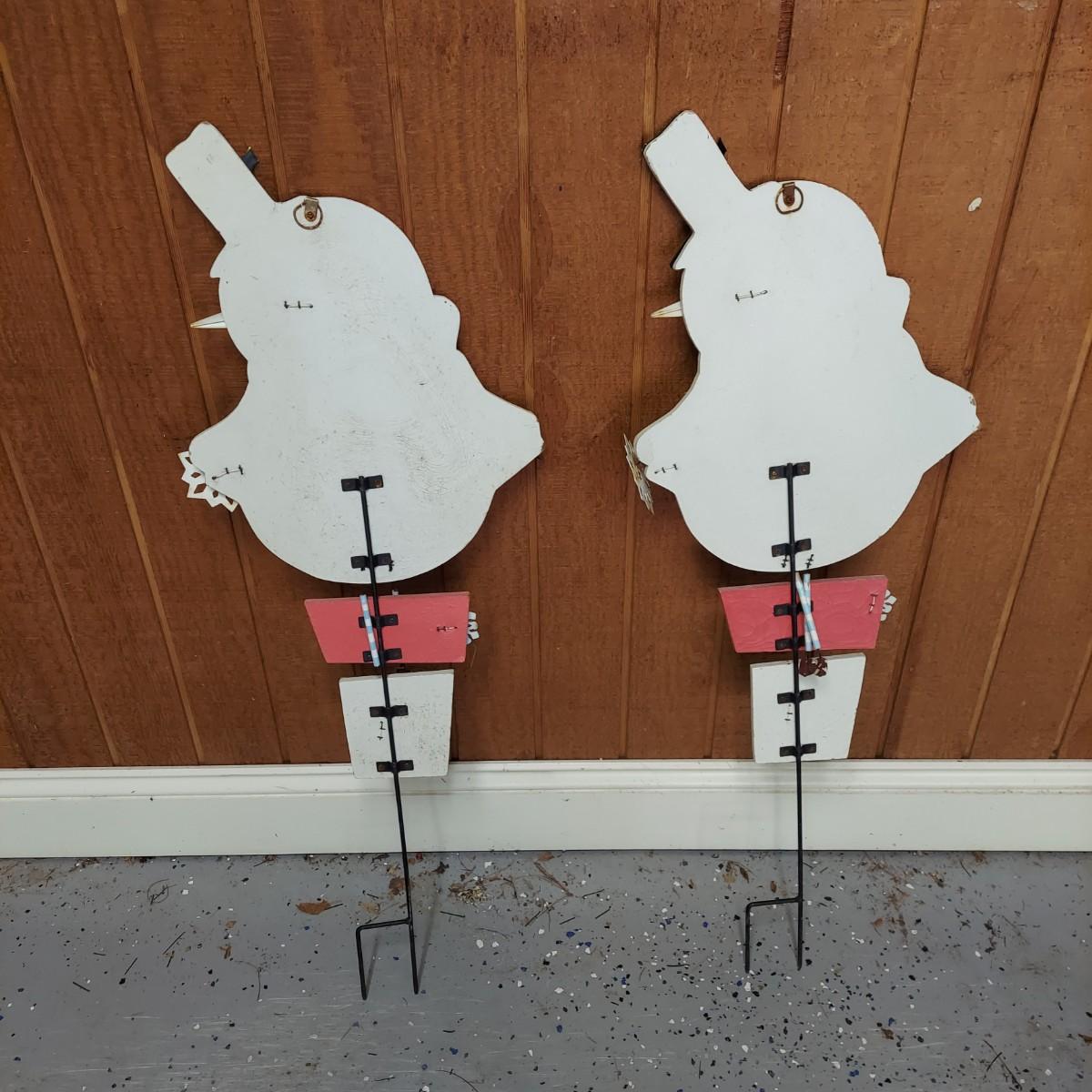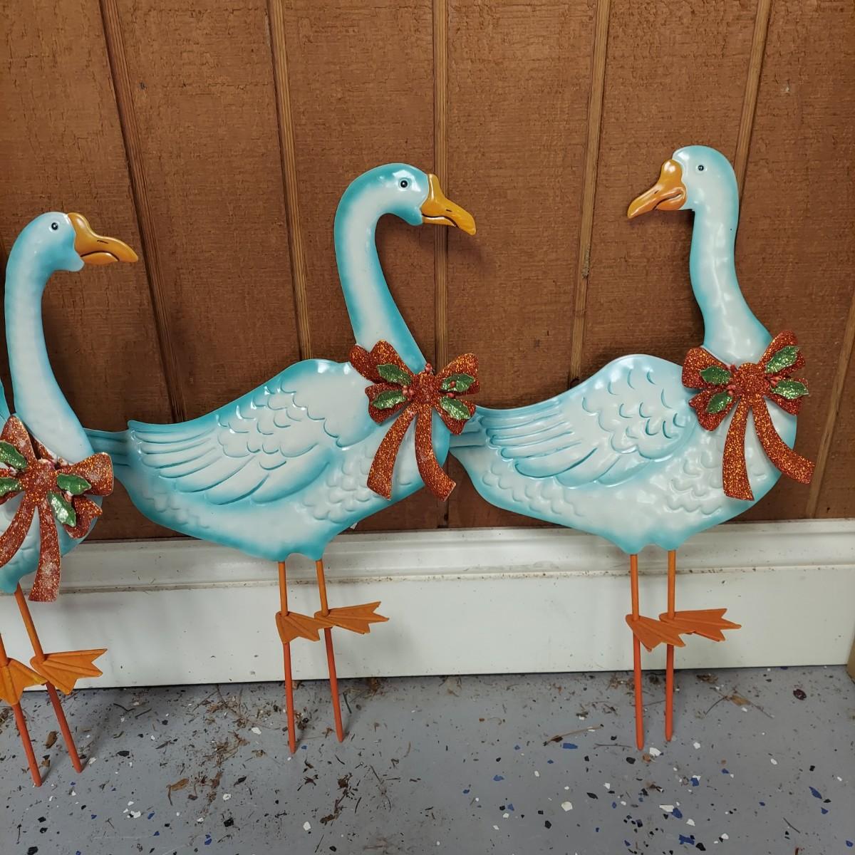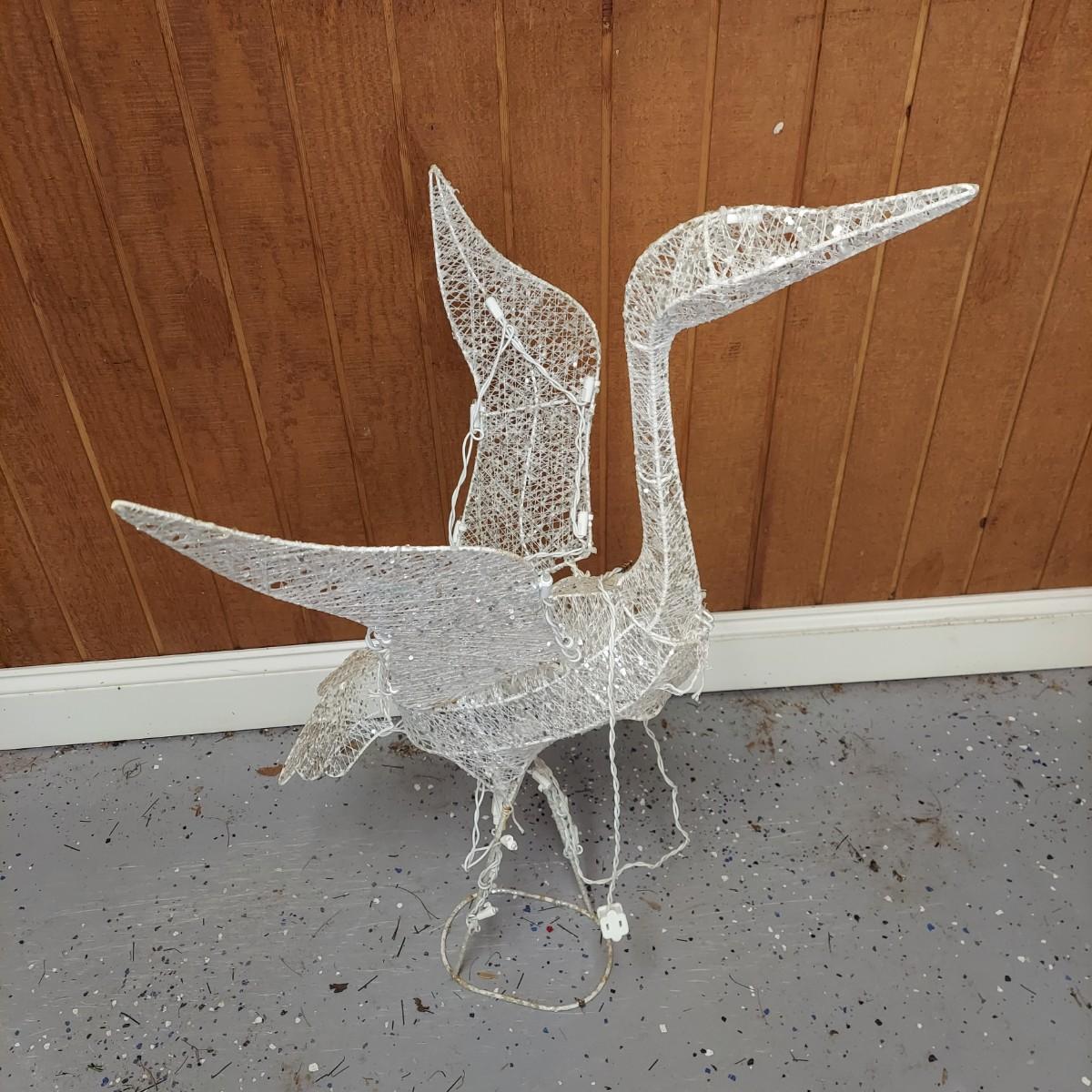 Lot includes several outdoor holiday decor items. These are approximately 37"H. There are two white glittery birds that light up. Plus two metal bells and two snowmen on stakes. Also six metal birds that can be removed from their stakes. The birds were plugged in and powered on. Local Pickup Only