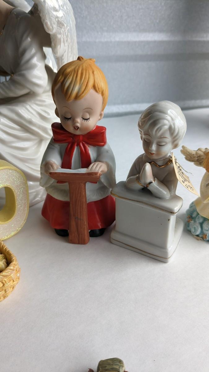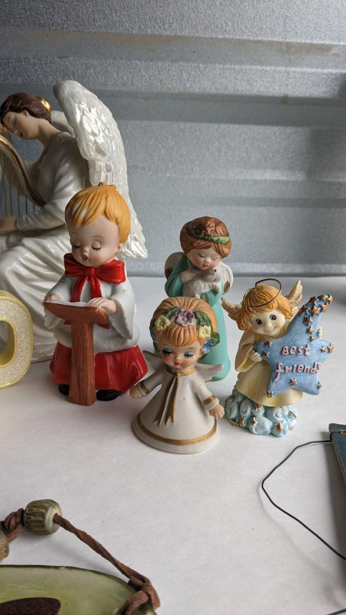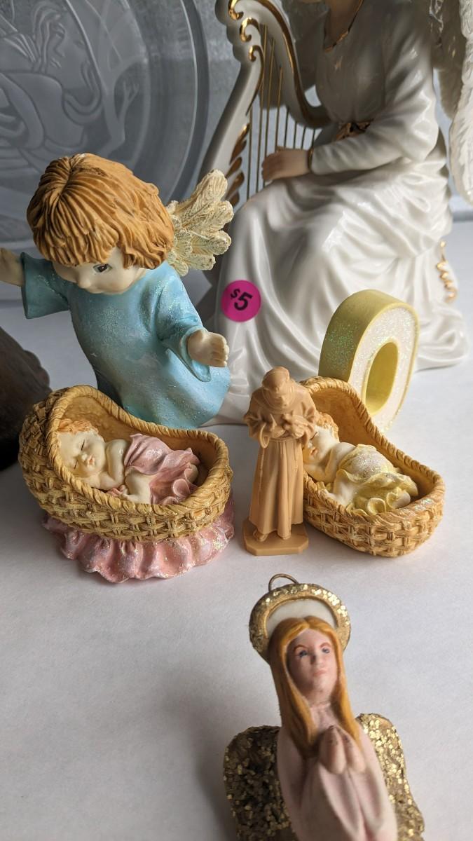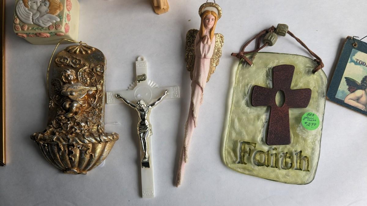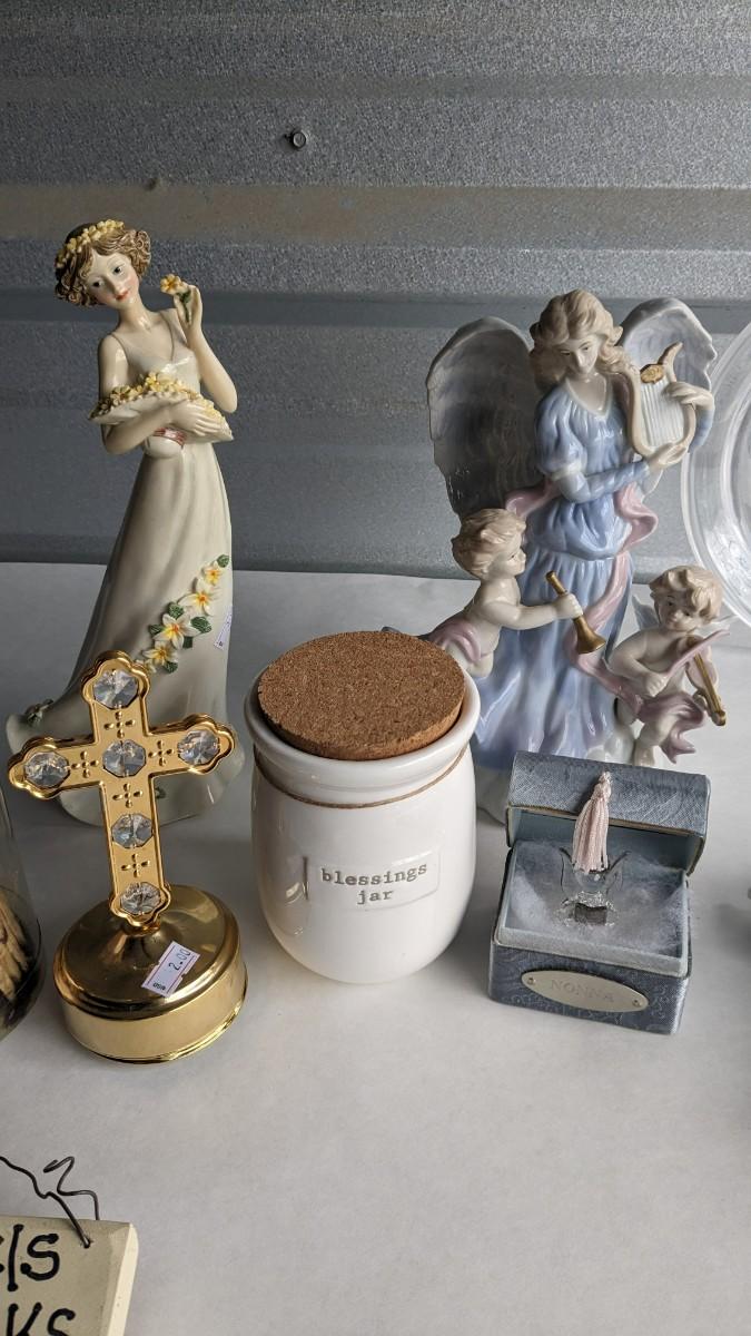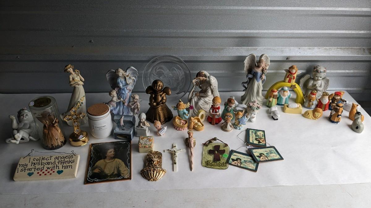 angels, crosses, and some religious images round out this great little lot of faith based items. Please note damage on Lladro style ceramic, easily fixed. Also includes kids wood nativity set by SFC. No shipping. 2616