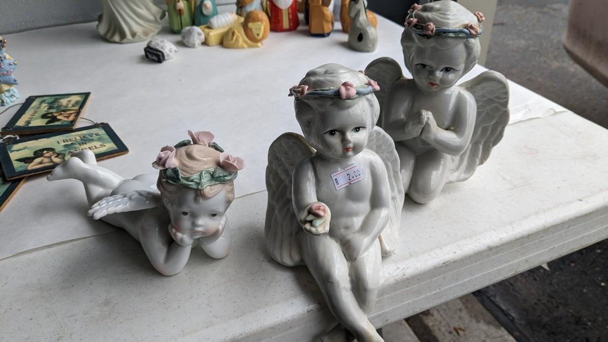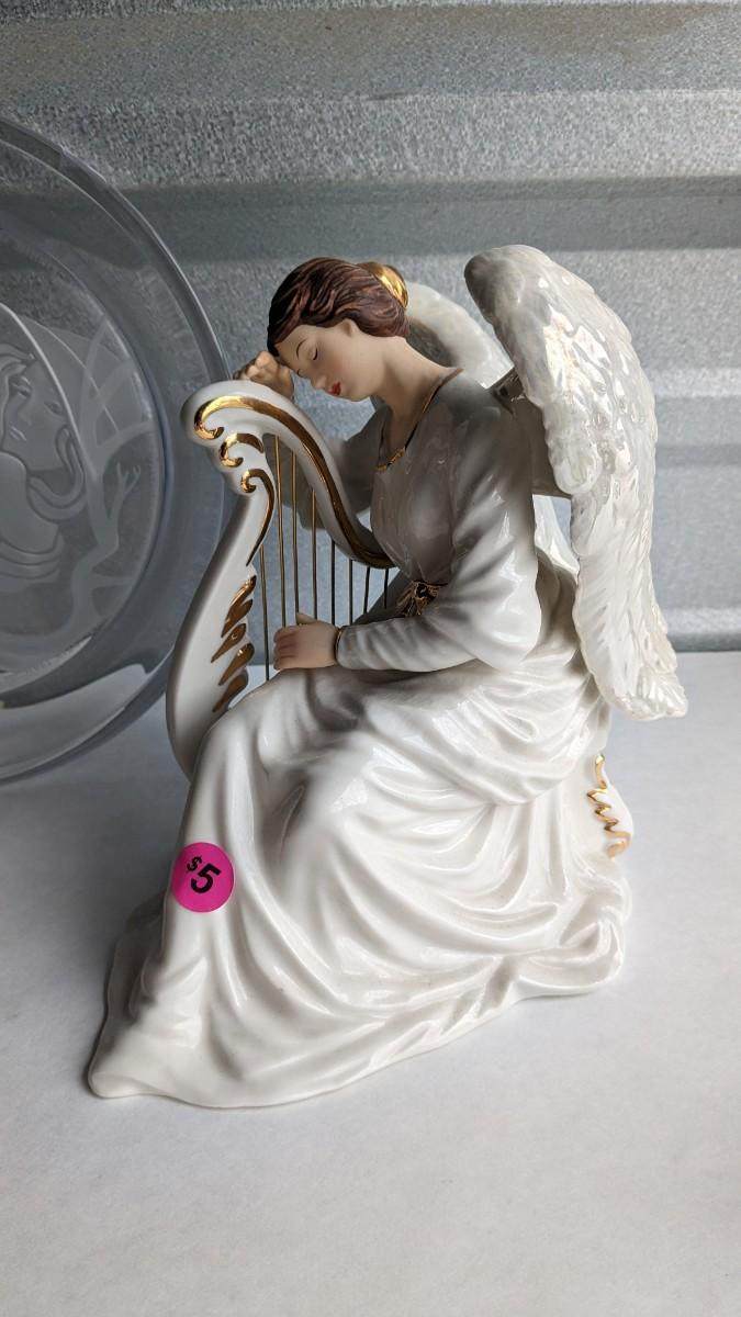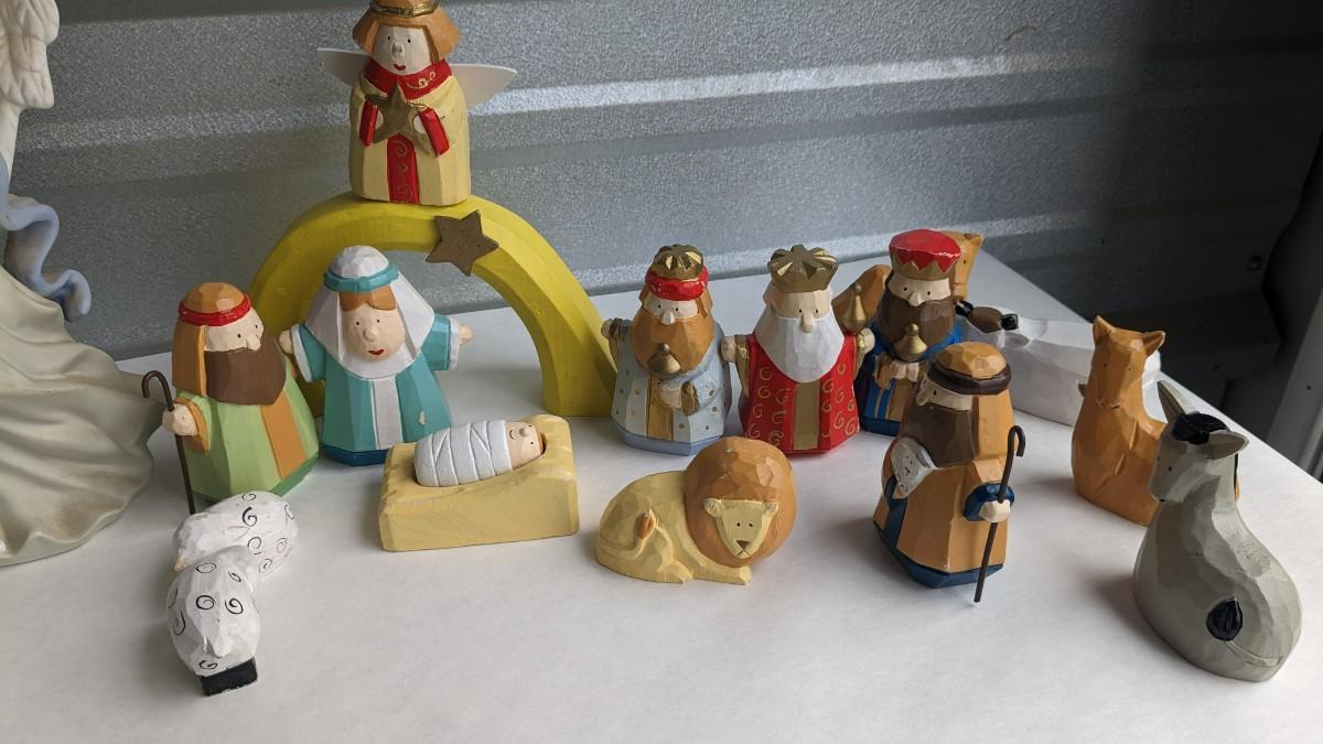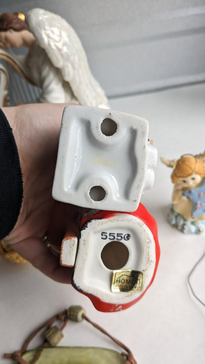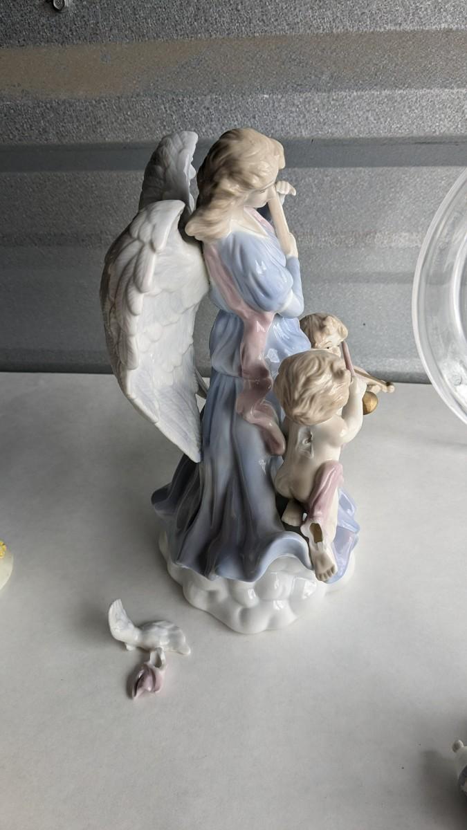 angels, crosses, and some religious images round out this great little lot of faith based items. Please note damage on Lladro style ceramic, easily fixed. Also includes kids wood nativity set by SFC. No shipping. 2616