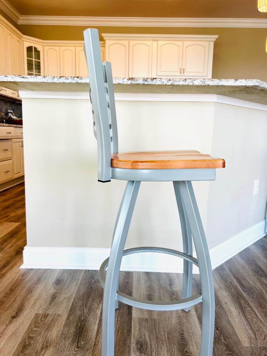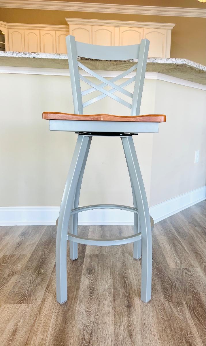 Like New, HOLLAND BARSTOOL CO. Set of 3 Barstools that swivel. Color is grey metal and natural wood seats. Measure 44 inches tall, seat measures 16 inches wide and 18 inches deep. Floor to seat measures 30 inches. LOT B