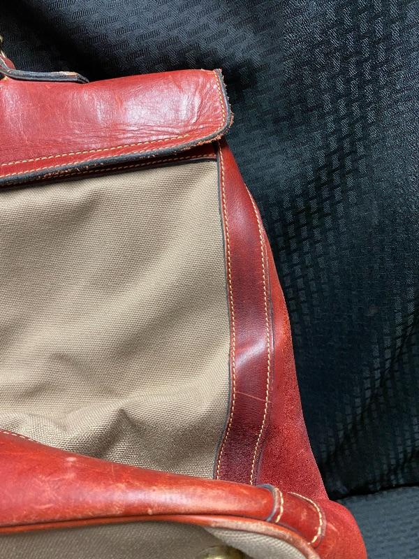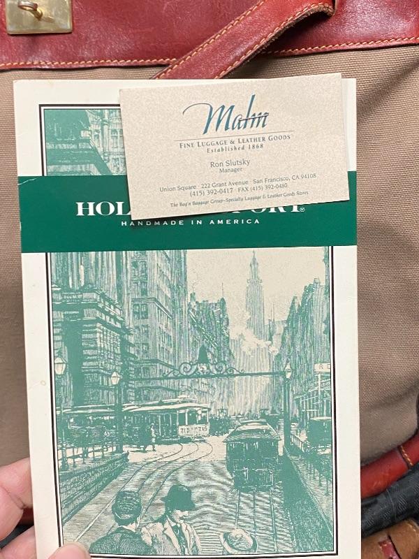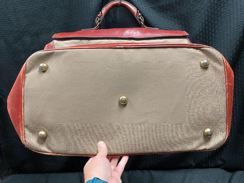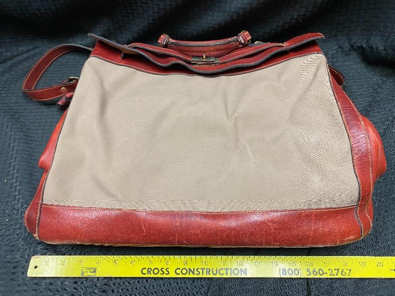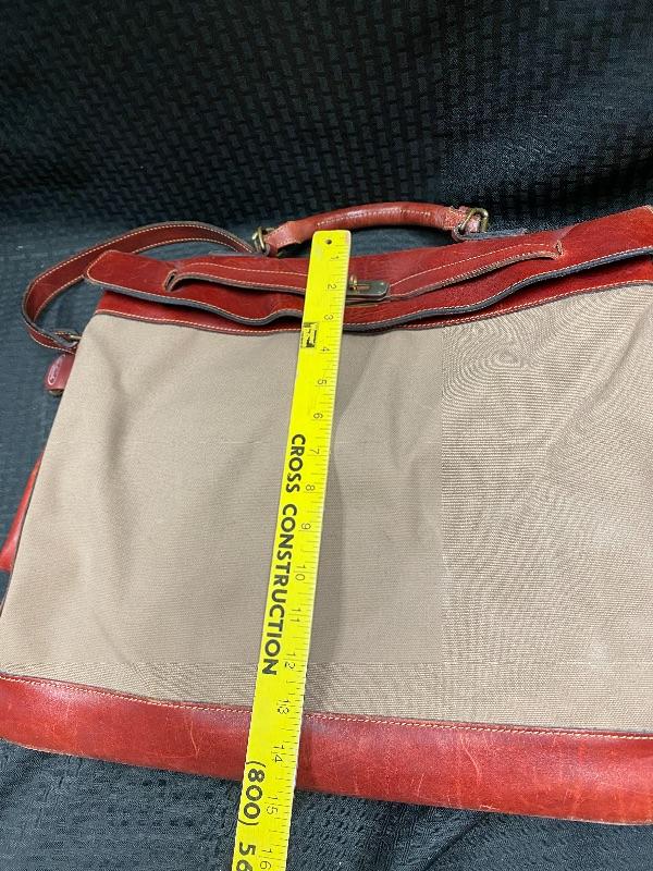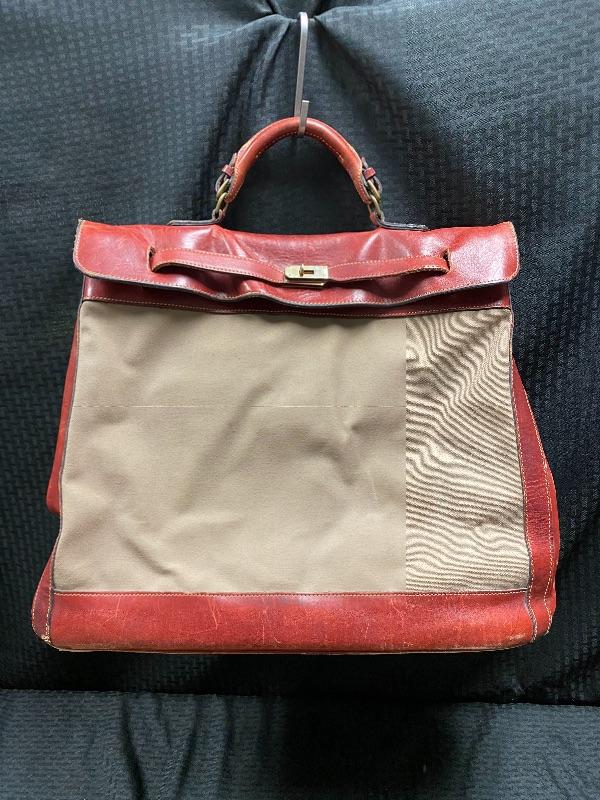 Large Holland Sport tote bag. Model AL314 Polo Bag in tan canvas and red leather. Large size about 19" wide and 15" tall. Has a single handle for carrying or a detachable shoulder strap. Good used condition. There are some scuffs at the bottom from use. Comes with lock and keys.