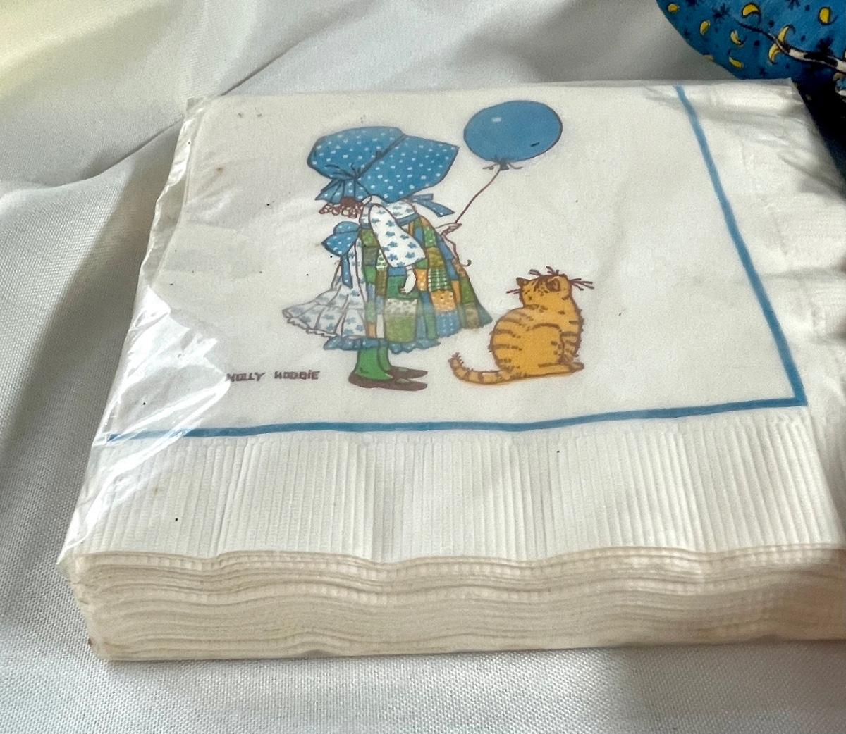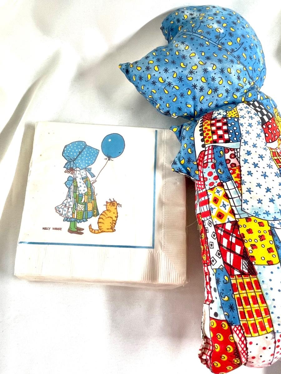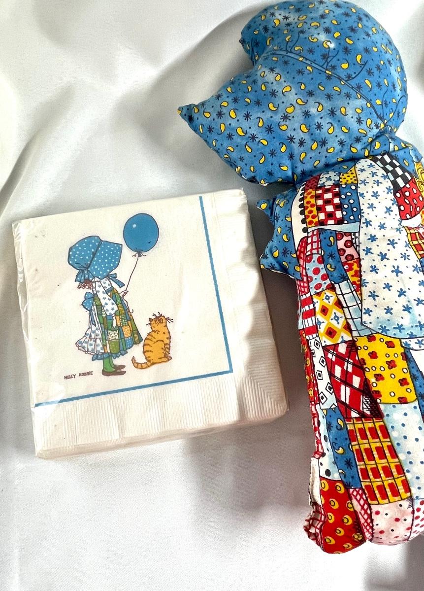 I know there are collectors of this childhood favorite! Sweet doll and oddly enough a package of napkins, so I decided they should both go to the Holly Hobbie lover! If you know that person. Make sure they see this doll. They will want it.