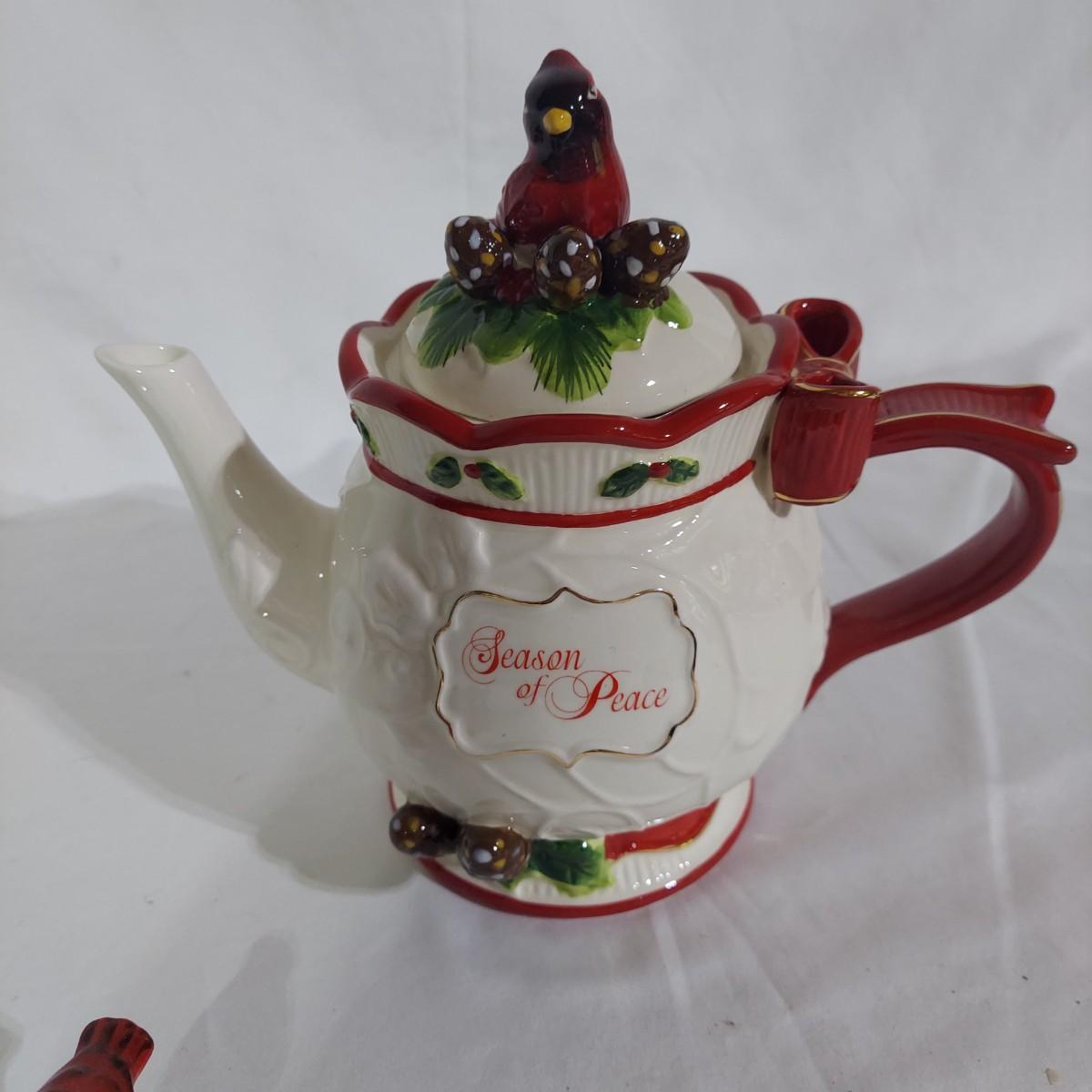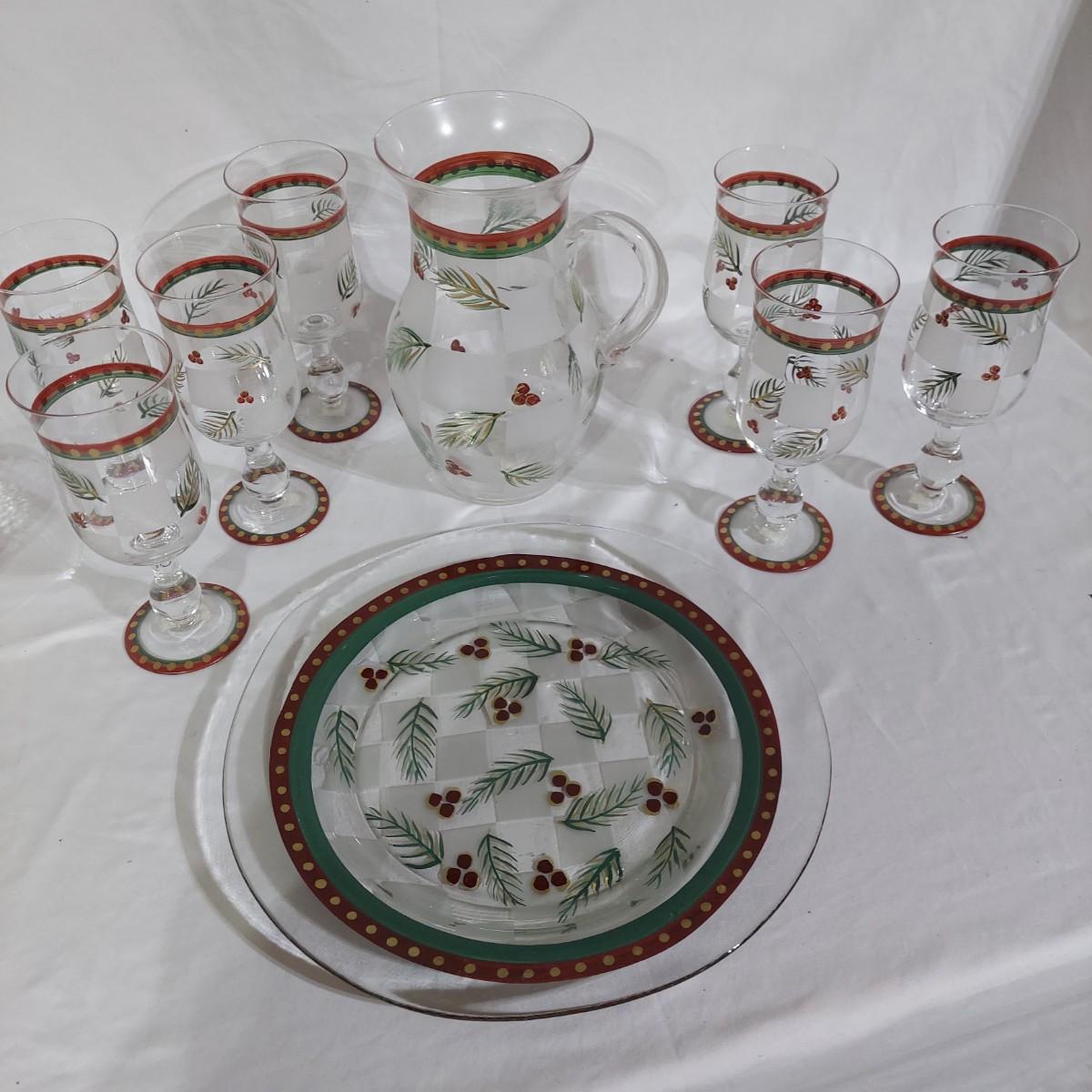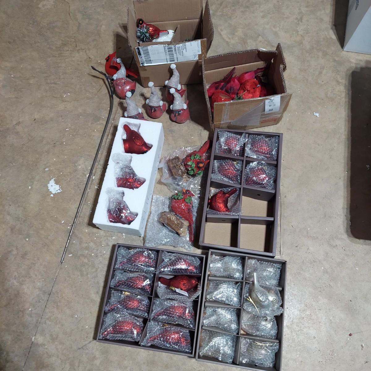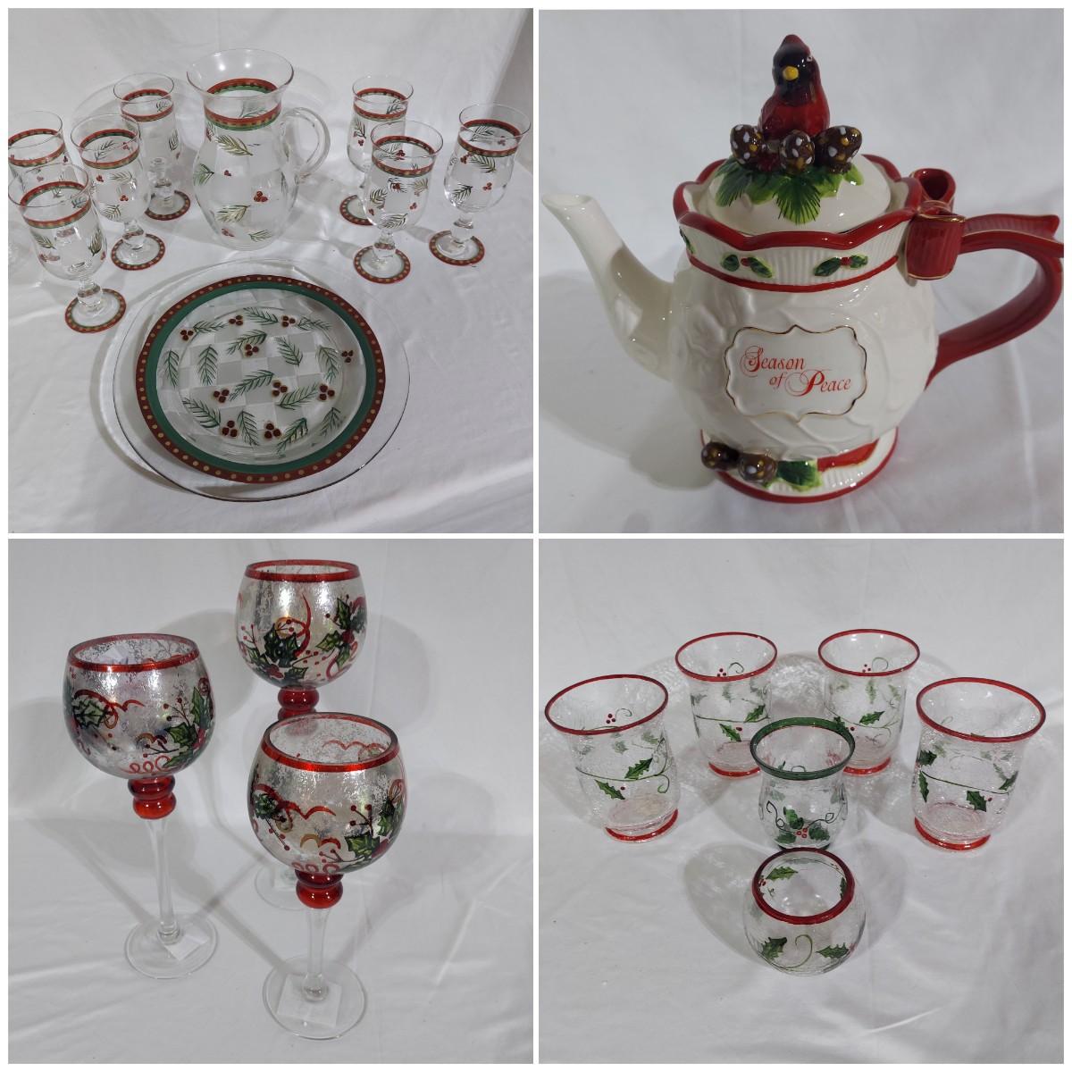 Lot includes dishes and decor with holly print as well as several pieces of cardinal decor. The pitcher is 9.5"H and the serving platter is 13"D across. Please see photos for details. Local Pickup Only