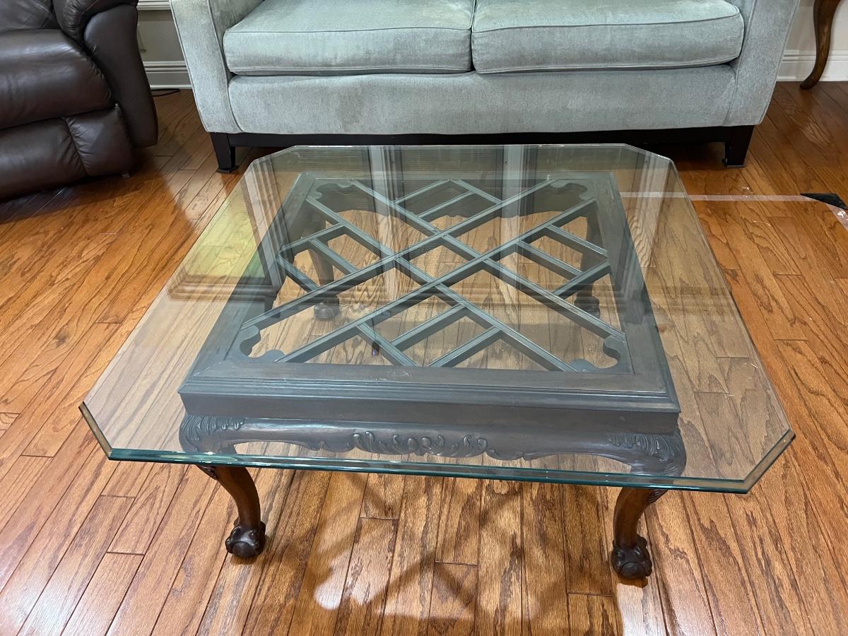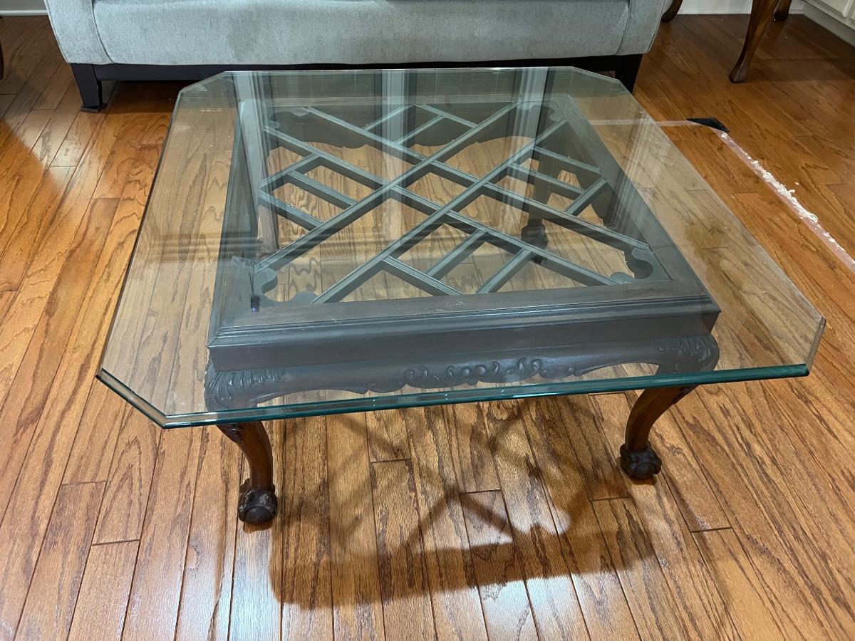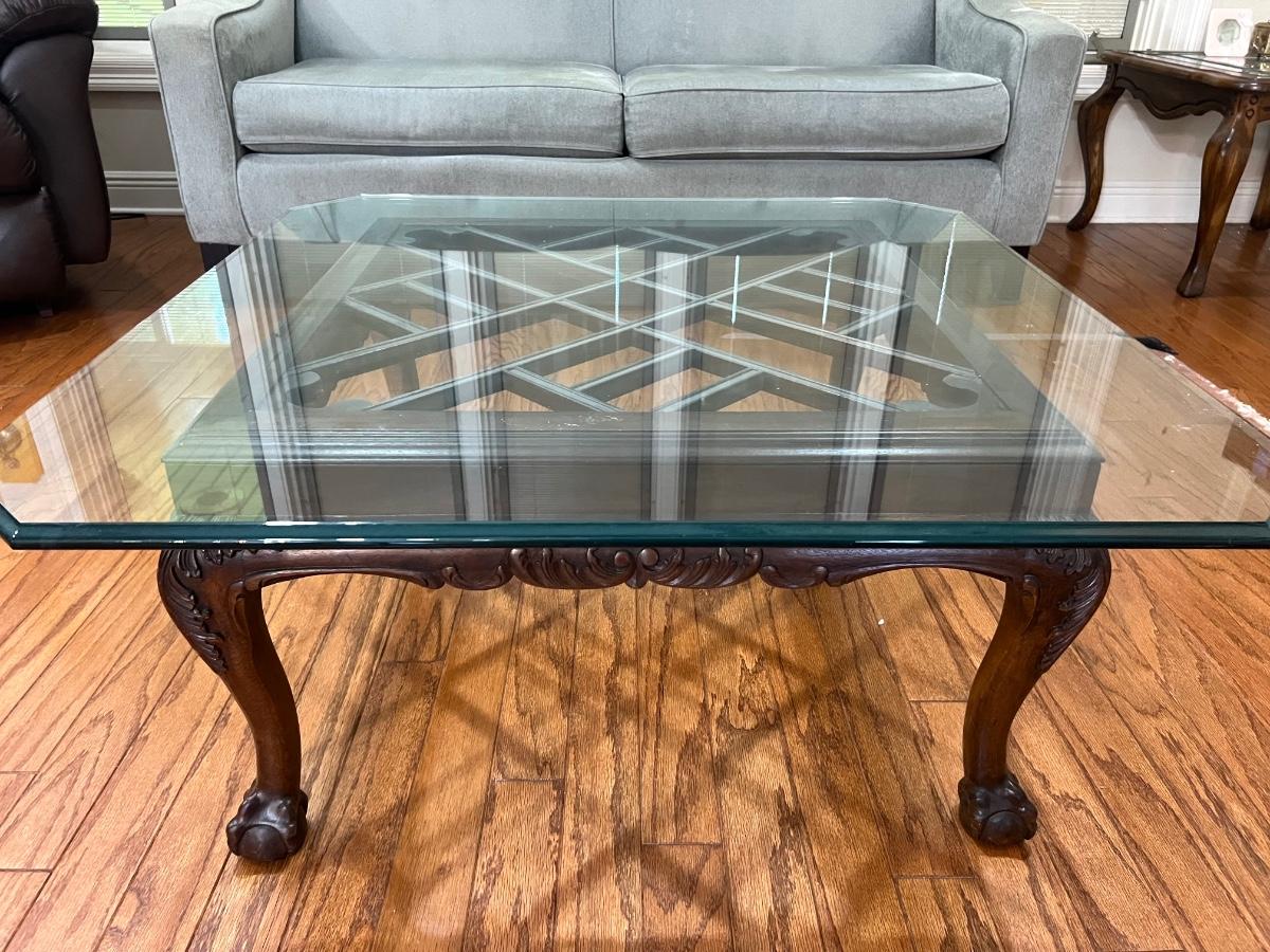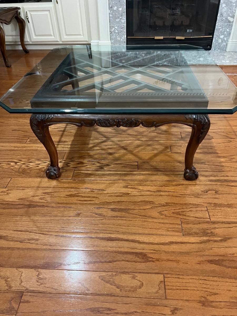 This piece is HEAVY! Hollywood Regency Lattice Motif Style Mahogany Wood Glass Top Coffee Table. Glass top measures at 38 x 38 and 17 inches tall.