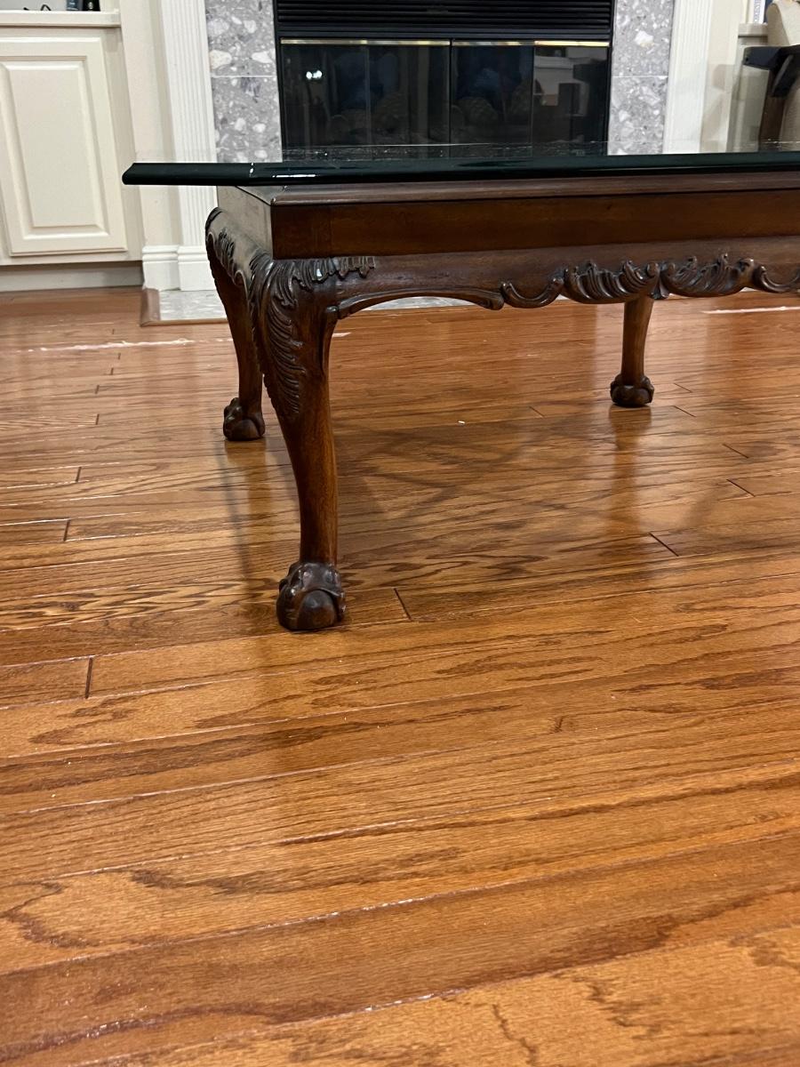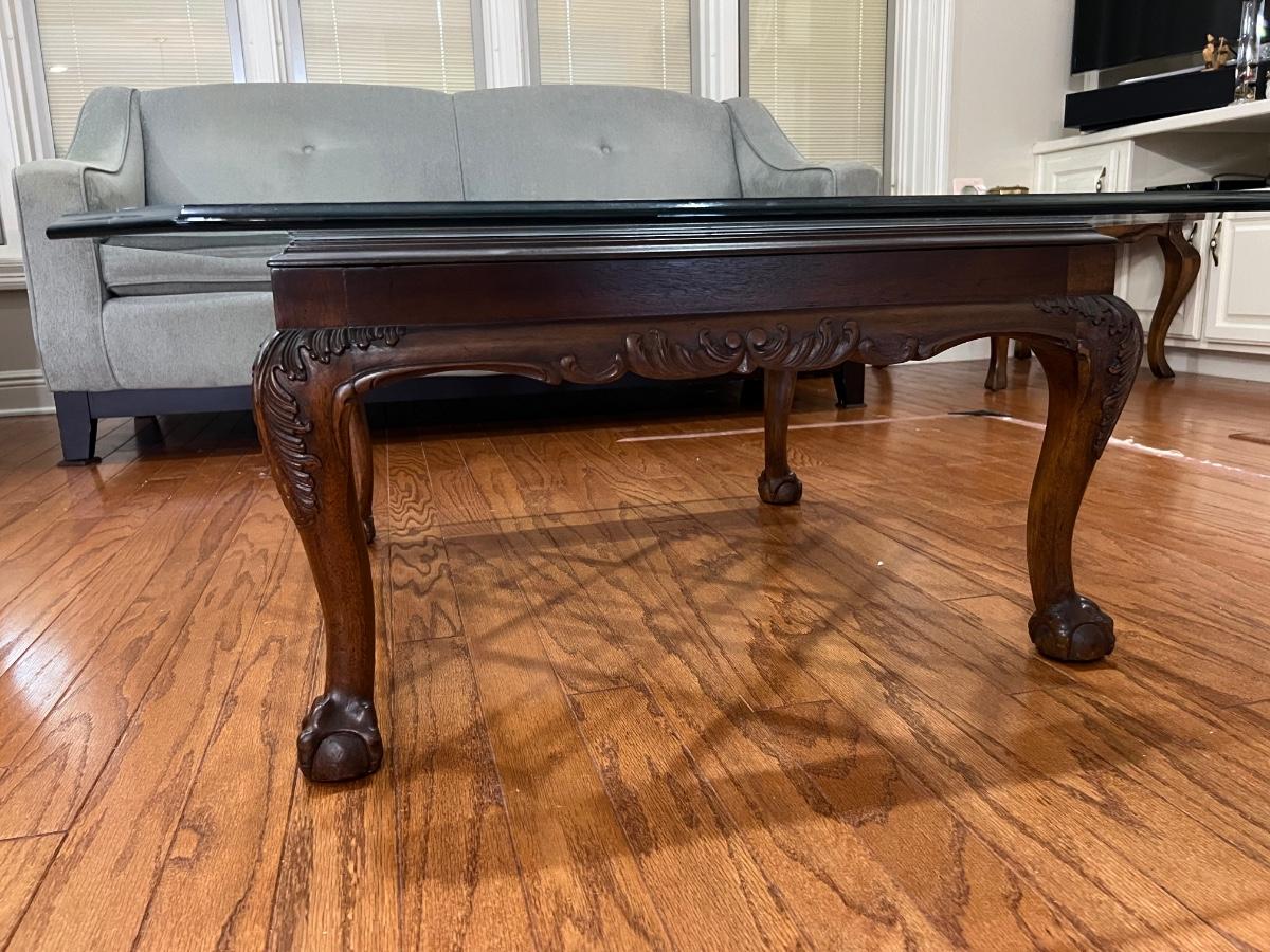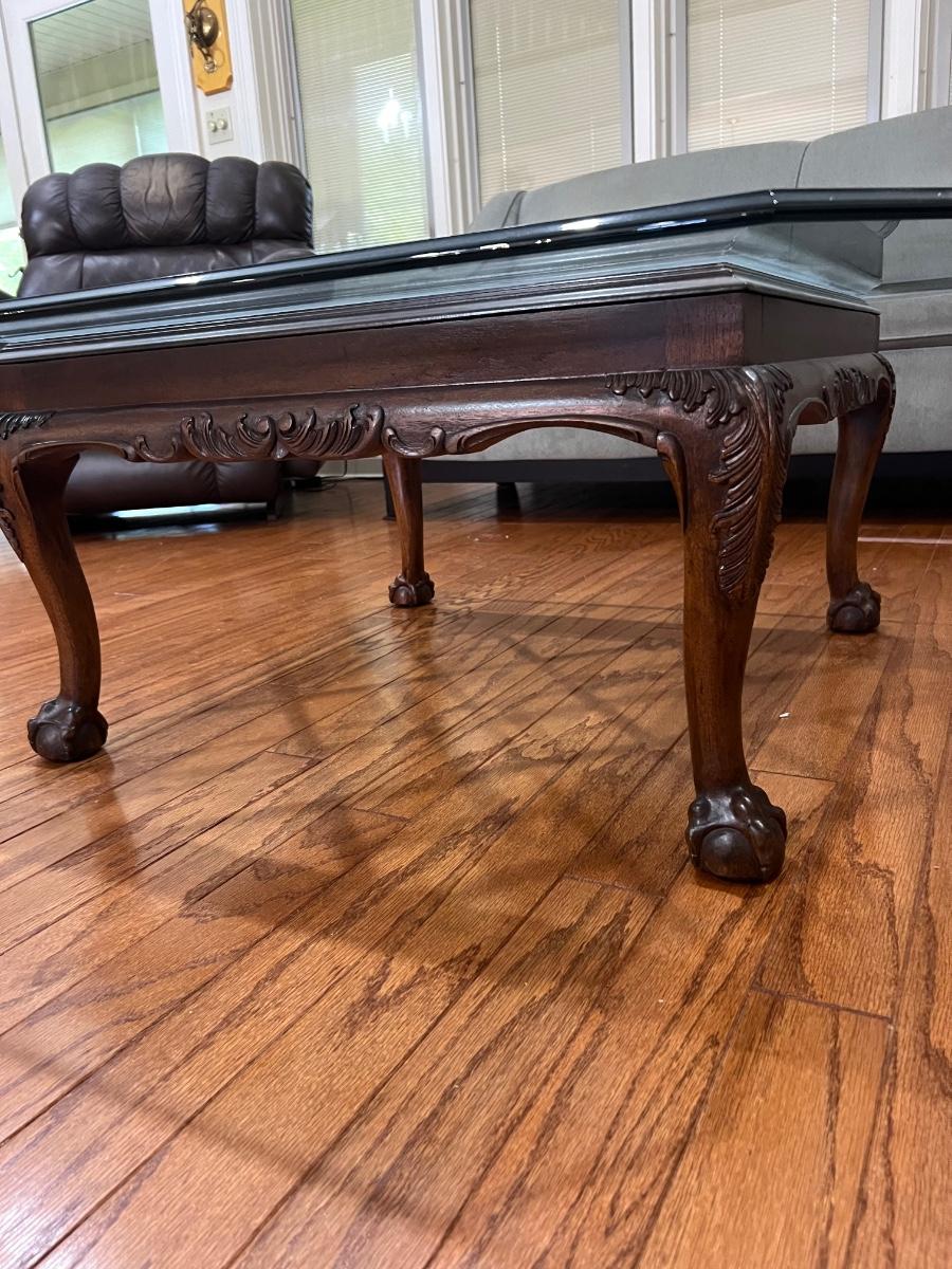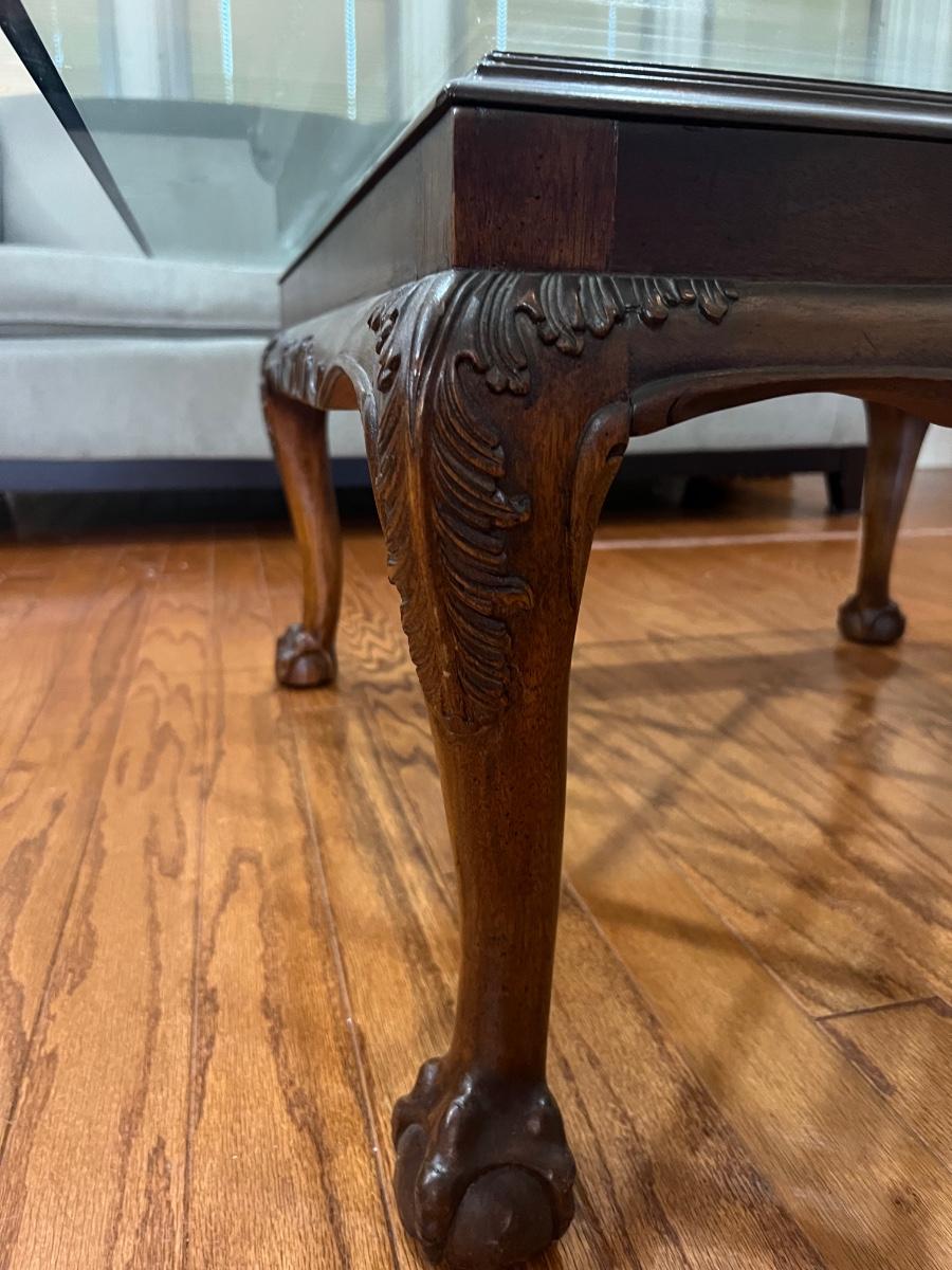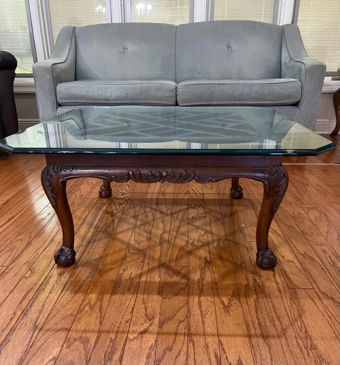 This piece is HEAVY! Hollywood Regency Lattice Motif Style Mahogany Wood Glass Top Coffee Table. Glass top measures at 38 x 38 and 17 inches tall.