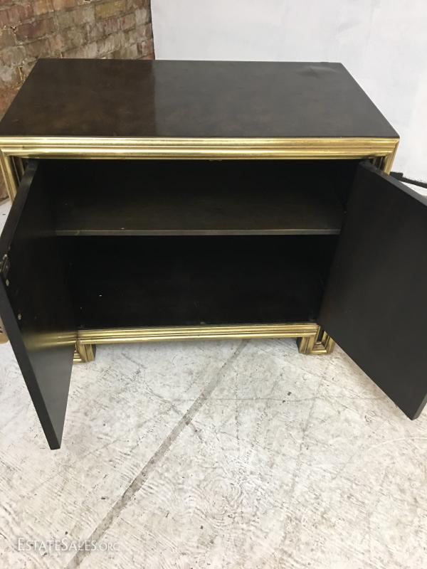 Small wood credenza or cabinet with brass edges. Possibly a Robsjohn design. Measures 32" by 19", 24" tall. Missing the magnet on one of the door closers .