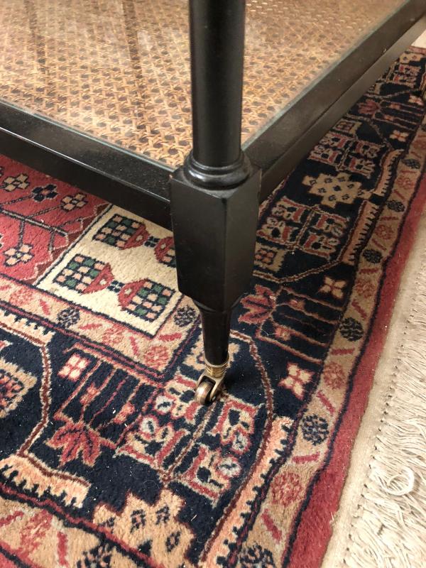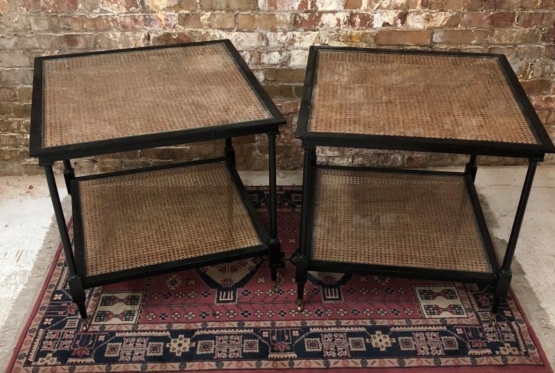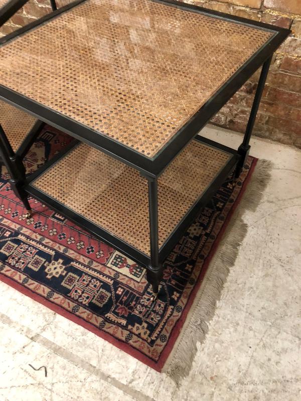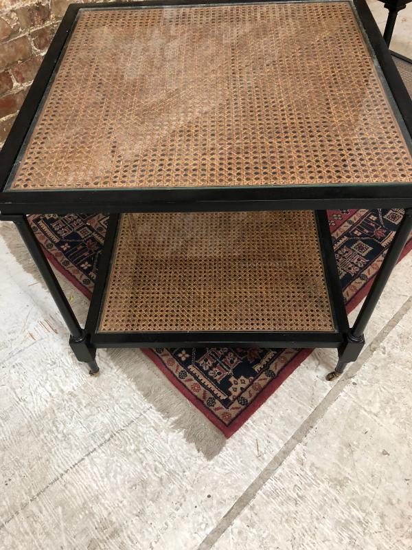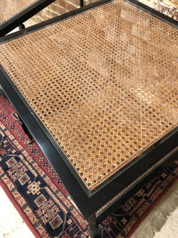 Tables are in good condition, slight wobble but sturdy. Rattan is good no tears, fitted glass tops. Measure 26" square and 25" tall.