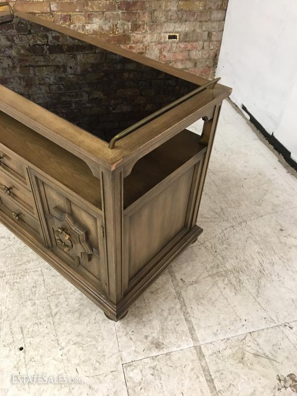 Server with black glass top, on casters. Two cabinets with 3 drawers. measures 43"x20" and is 30" tall