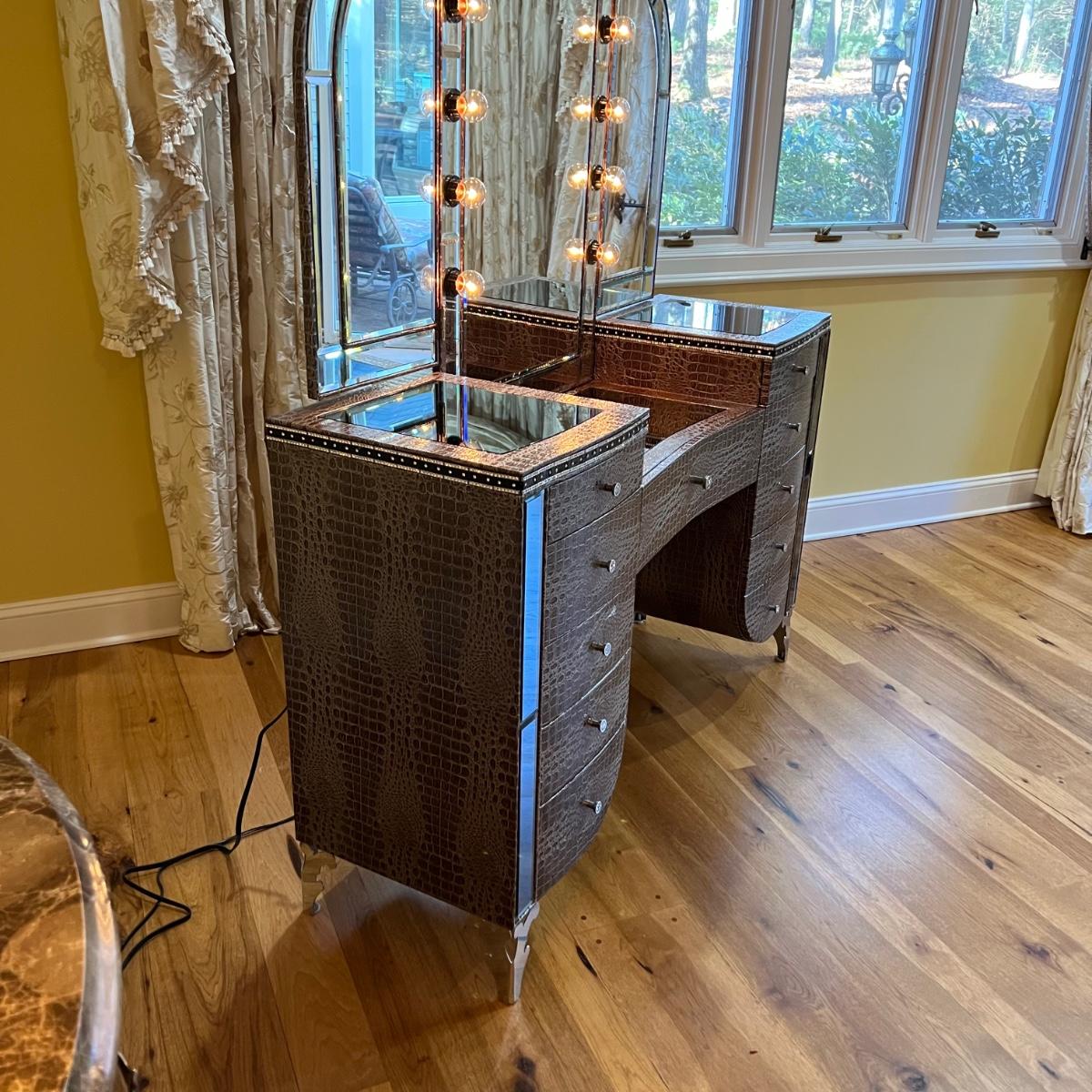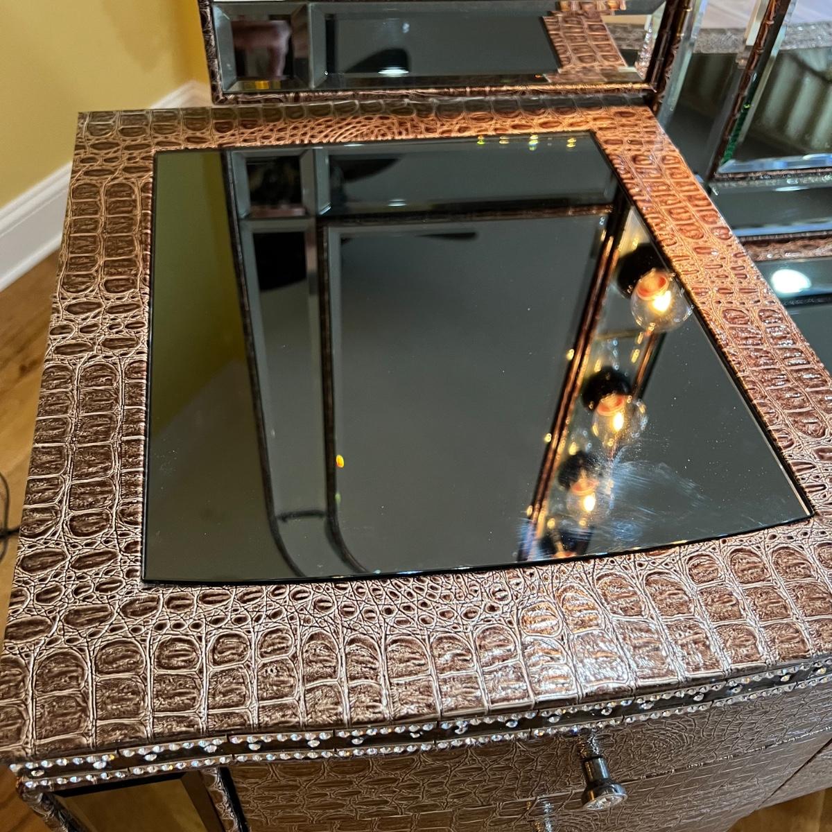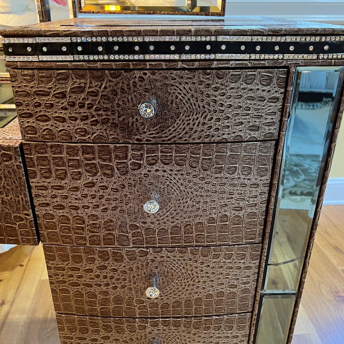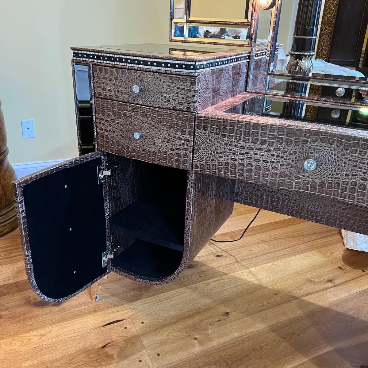 Beautiful vanity and lighted mirror top design by Michael Amini and Jane Seymour. Five storage drawers, mirrored top and edges, crystal knobs, bejeweled trim, two doors and chrome accents. Mirror and vanity covered in alligator leatherette and the soft close drawers are lined in velvet. Vanity measures 56” x 17” x 36"H and mirror measures 47” x 3.5” x 49"H.