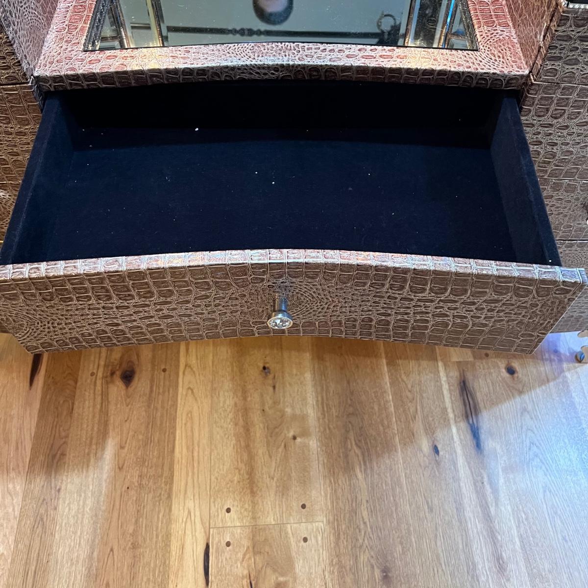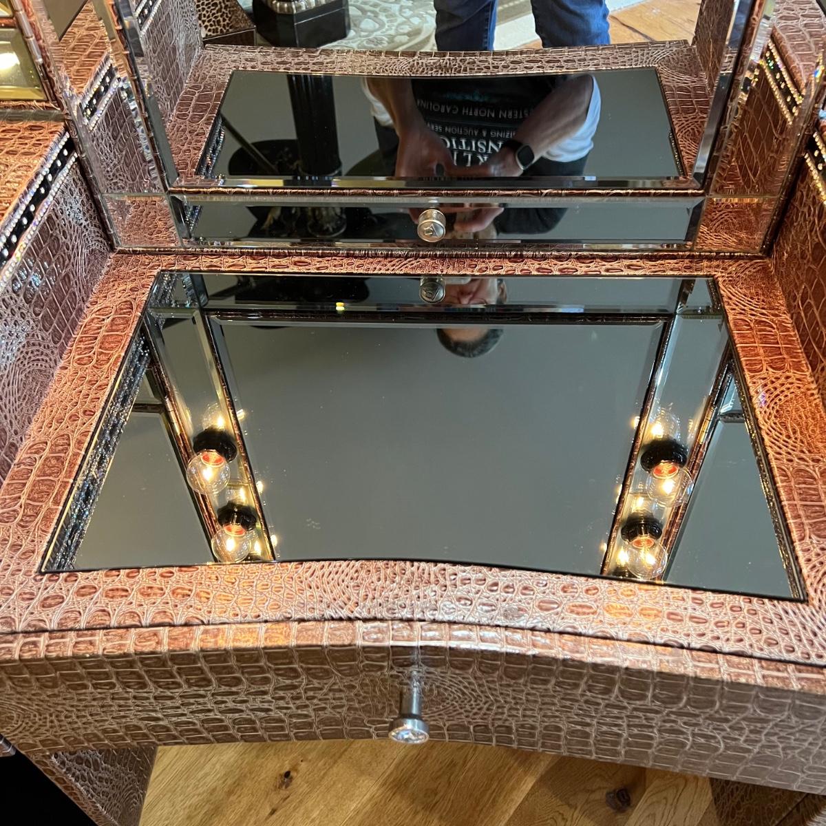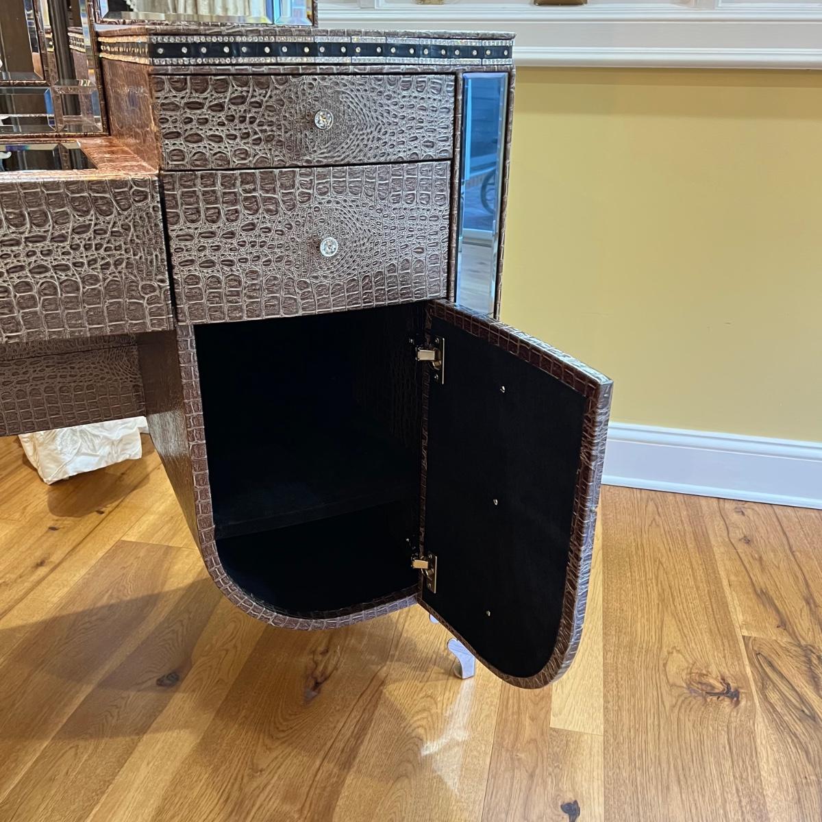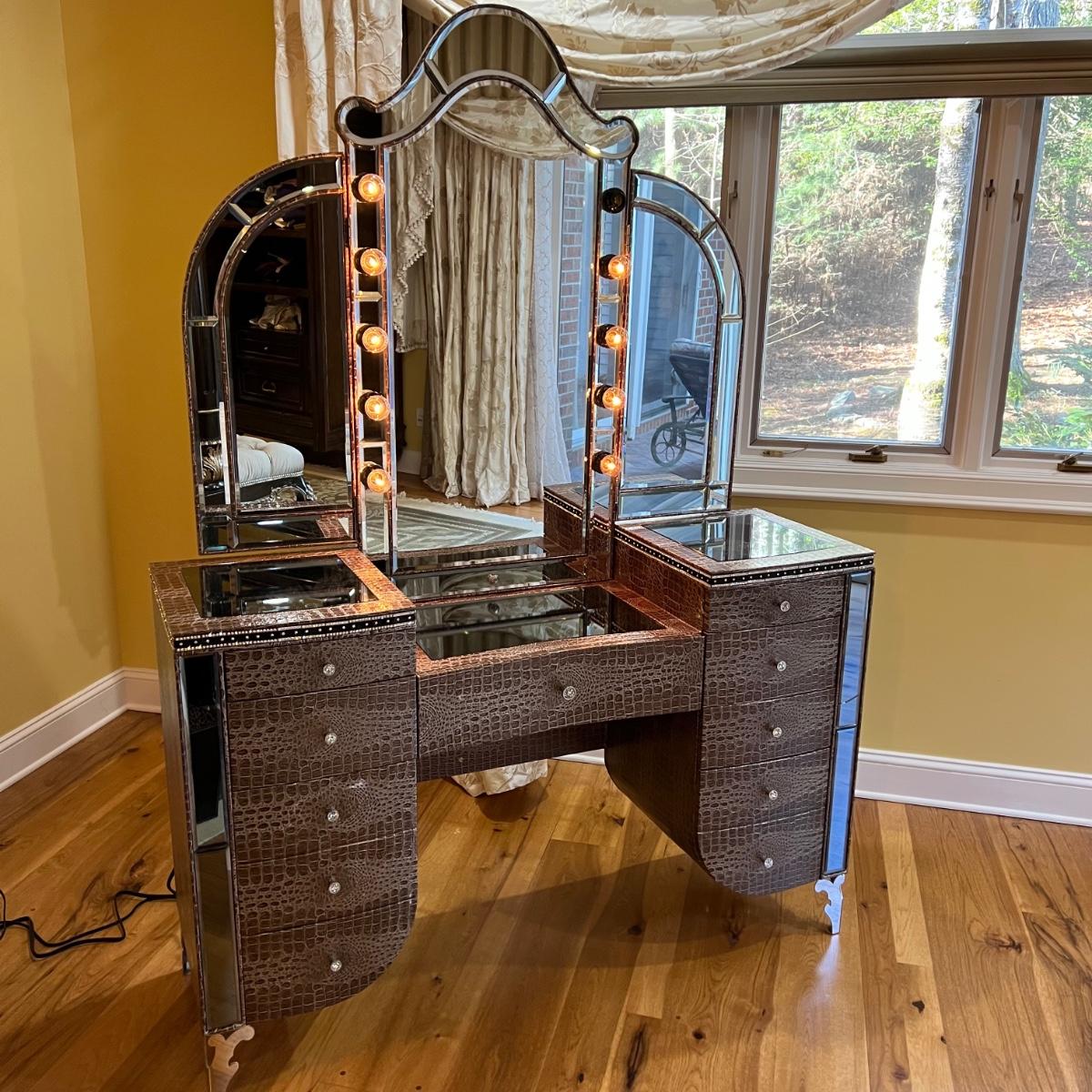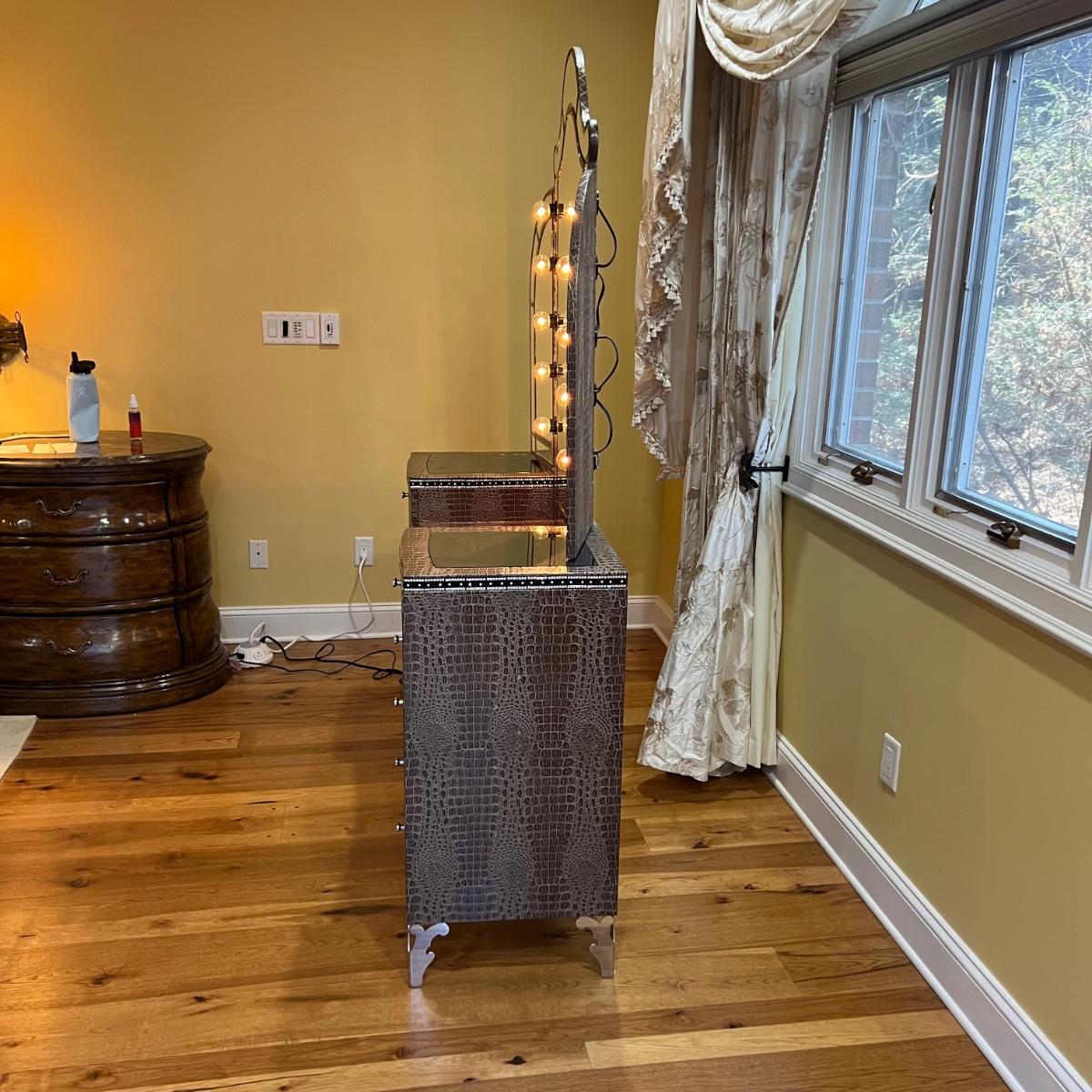 Beautiful vanity and lighted mirror top design by Michael Amini and Jane Seymour. Five storage drawers, mirrored top and edges, crystal knobs, bejeweled trim, two doors and chrome accents. Mirror and vanity covered in alligator leatherette and the soft close drawers are lined in velvet. Vanity measures 56” x 17” x 36"H and mirror measures 47” x 3.5” x 49"H.
