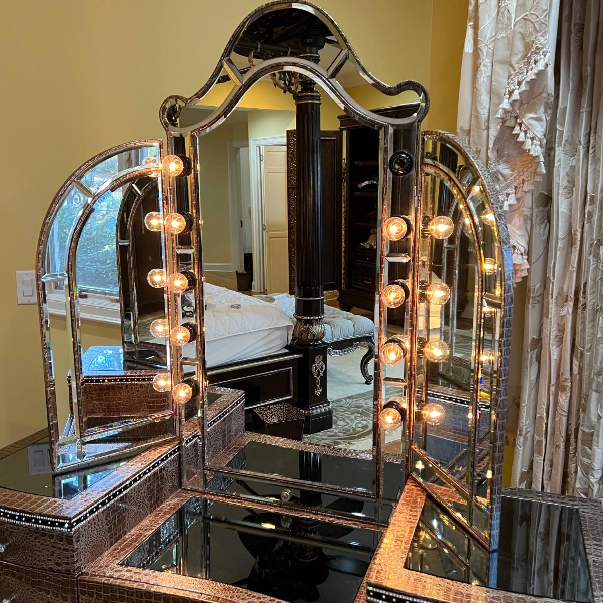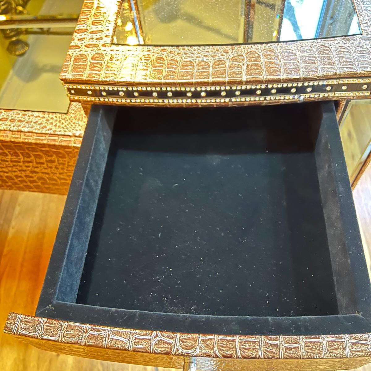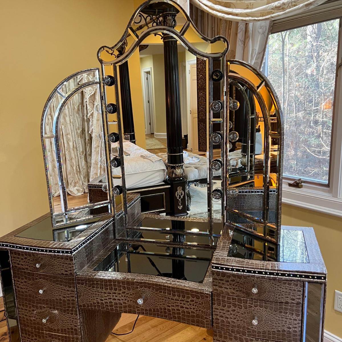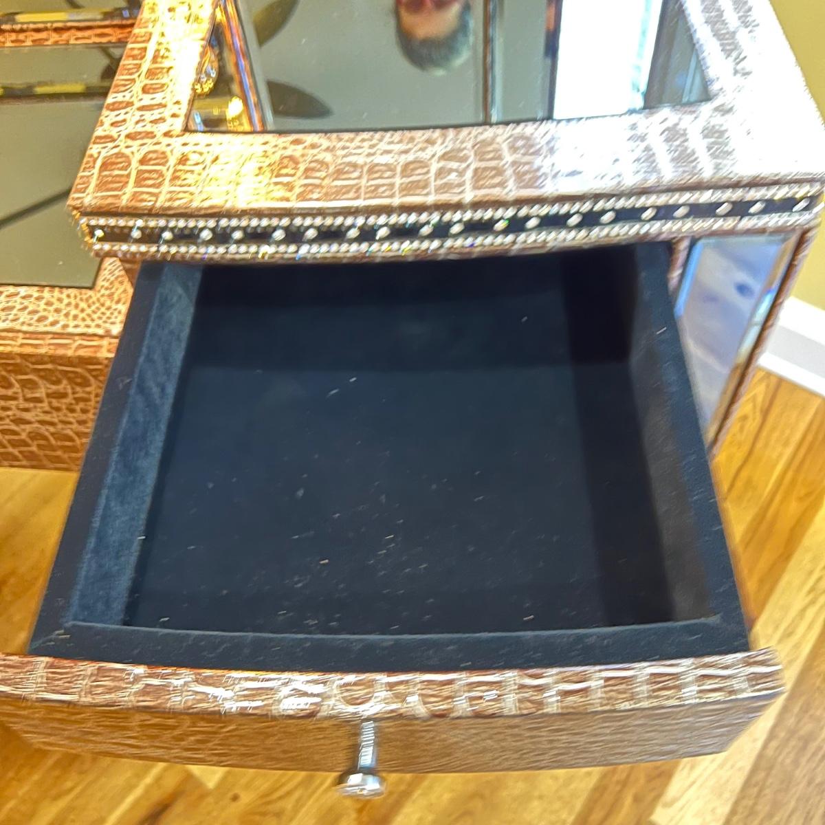 Beautiful vanity and lighted mirror top design by Michael Amini and Jane Seymour. Five storage drawers, mirrored top and edges, crystal knobs, bejeweled trim, two doors and chrome accents. Mirror and vanity covered in alligator leatherette and the soft close drawers are lined in velvet. Vanity measures 56” x 17” x 36"H and mirror measures 47” x 3.5” x 49"H.