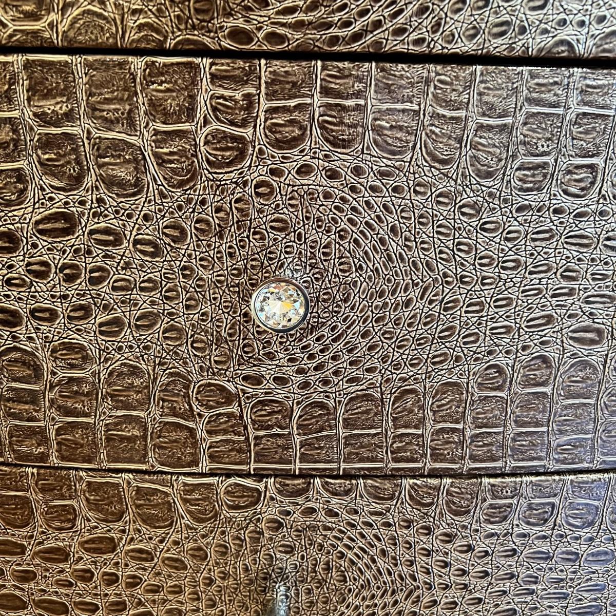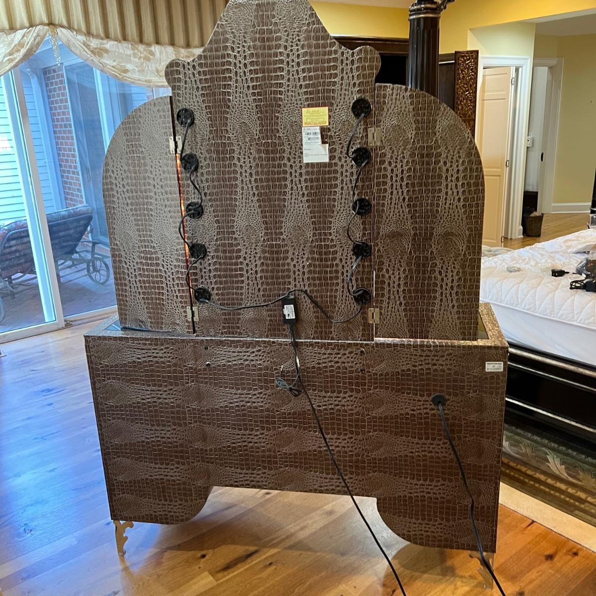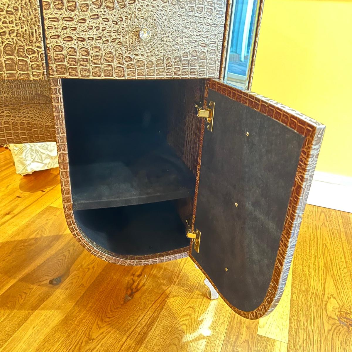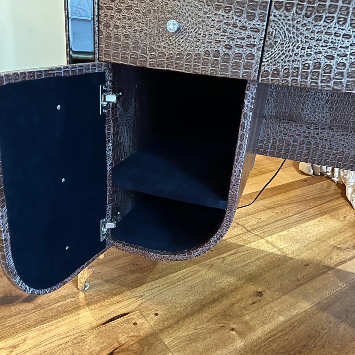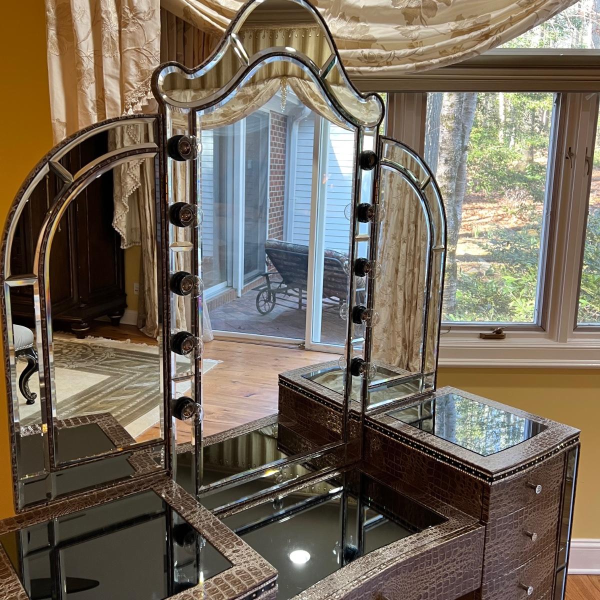 Beautiful vanity and lighted mirror top design by Michael Amini and Jane Seymour. Five storage drawers, mirrored top and edges, crystal knobs, bejeweled trim, two doors and chrome accents. Mirror and vanity covered in alligator leatherette and the soft close drawers are lined in velvet. Vanity measures 56” x 17” x 36"H and mirror measures 47” x 3.5” x 49"H.