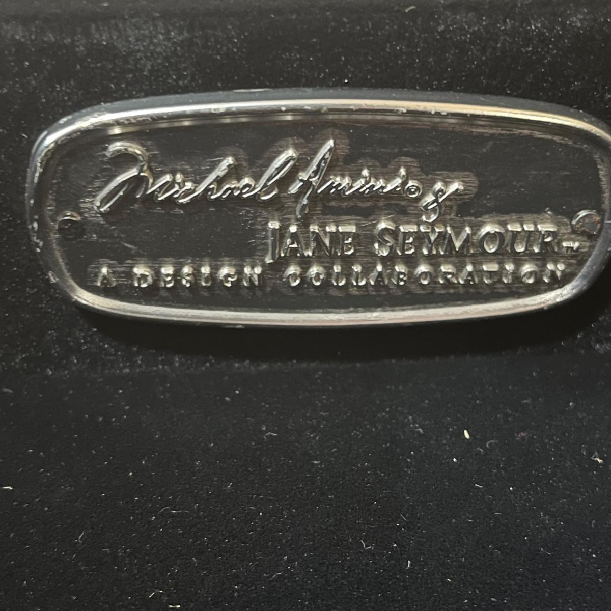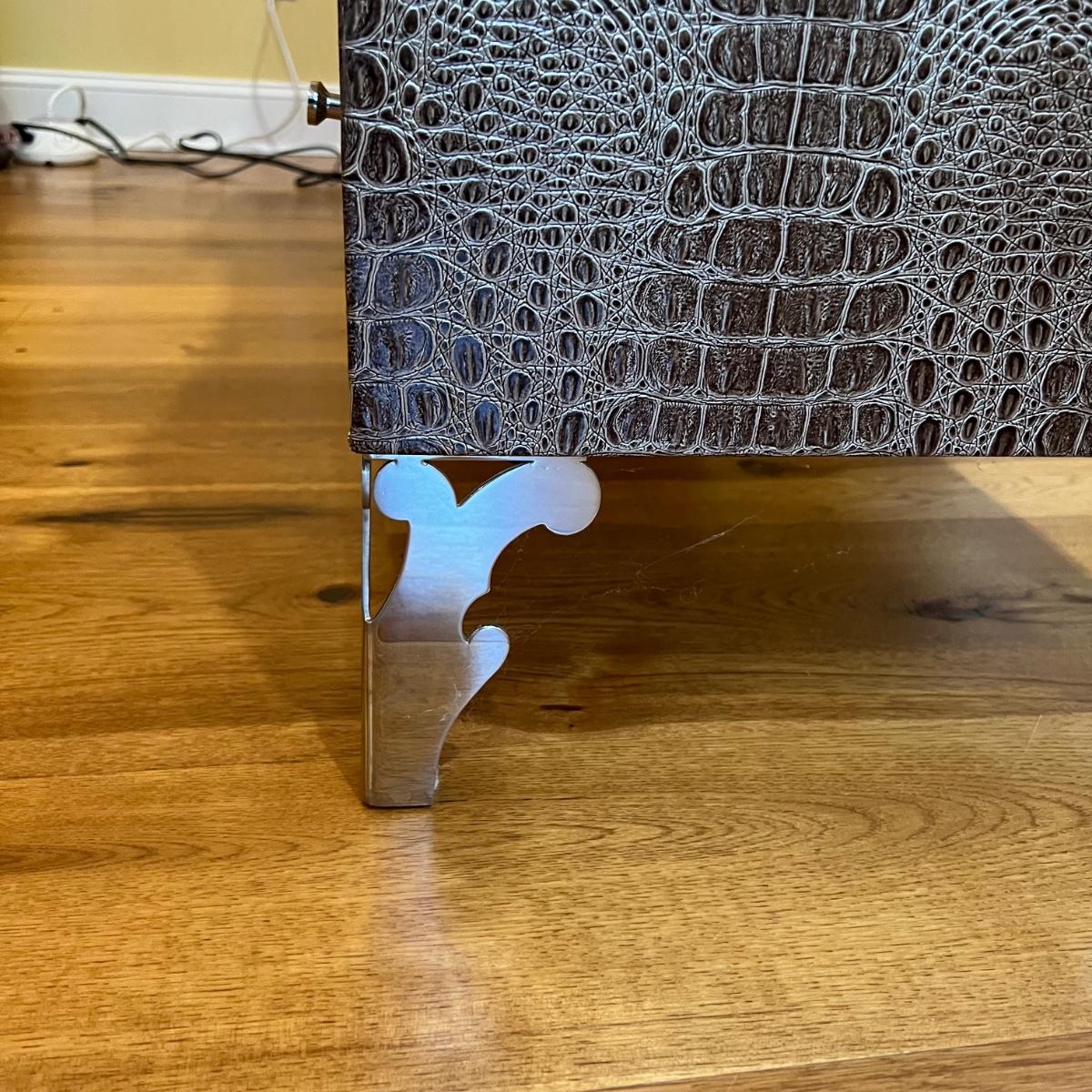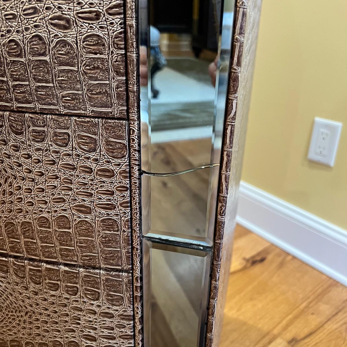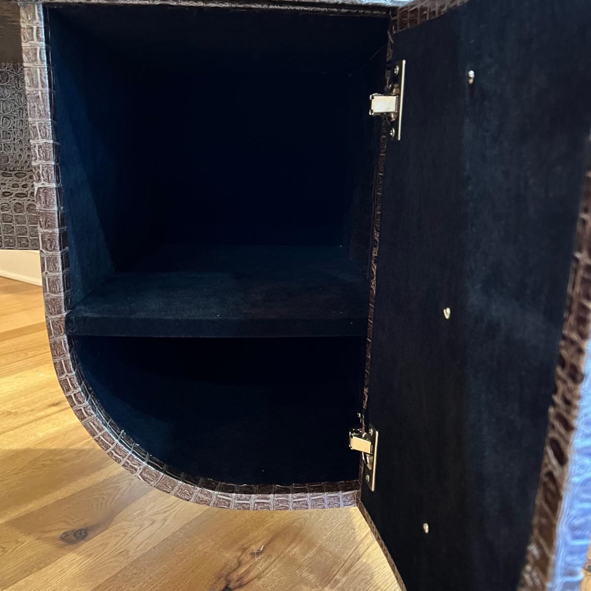 Beautiful vanity and lighted mirror top design by Michael Amini and Jane Seymour. Five storage drawers, mirrored top and edges, crystal knobs, bejeweled trim, two doors and chrome accents. Mirror and vanity covered in alligator leatherette and the soft close drawers are lined in velvet. Vanity measures 56” x 17” x 36"H and mirror measures 47” x 3.5” x 49"H.