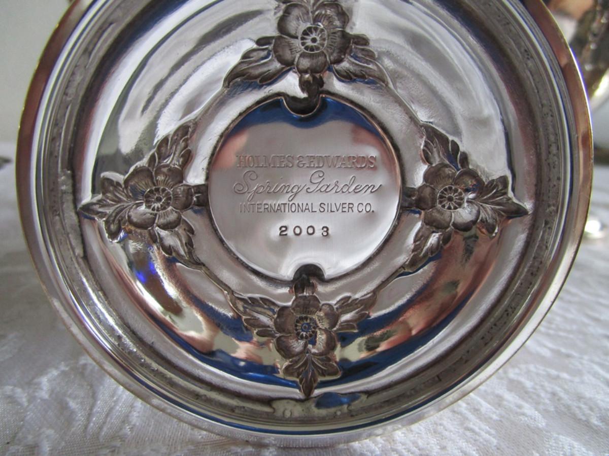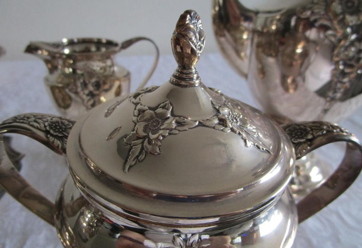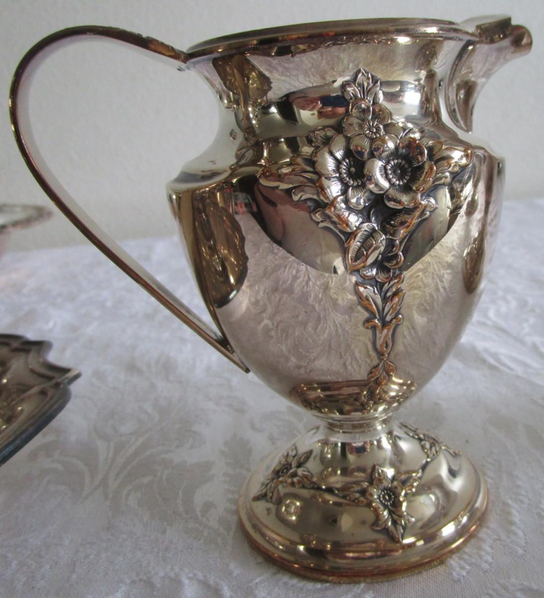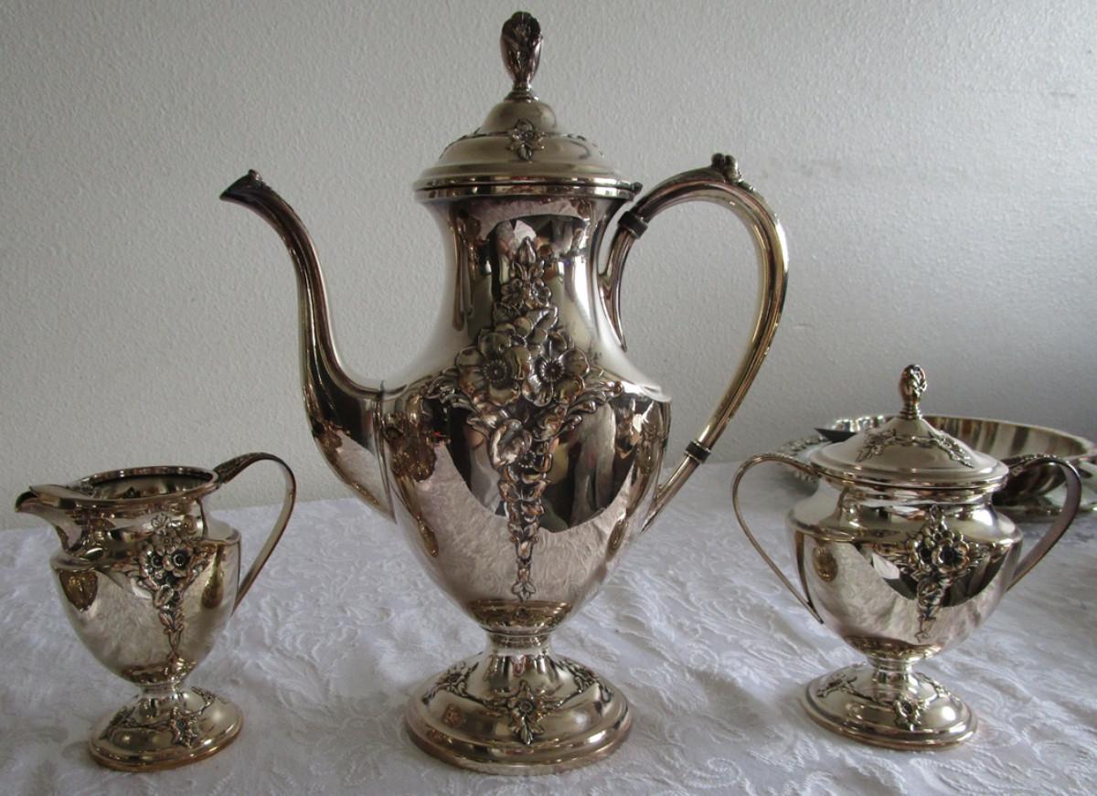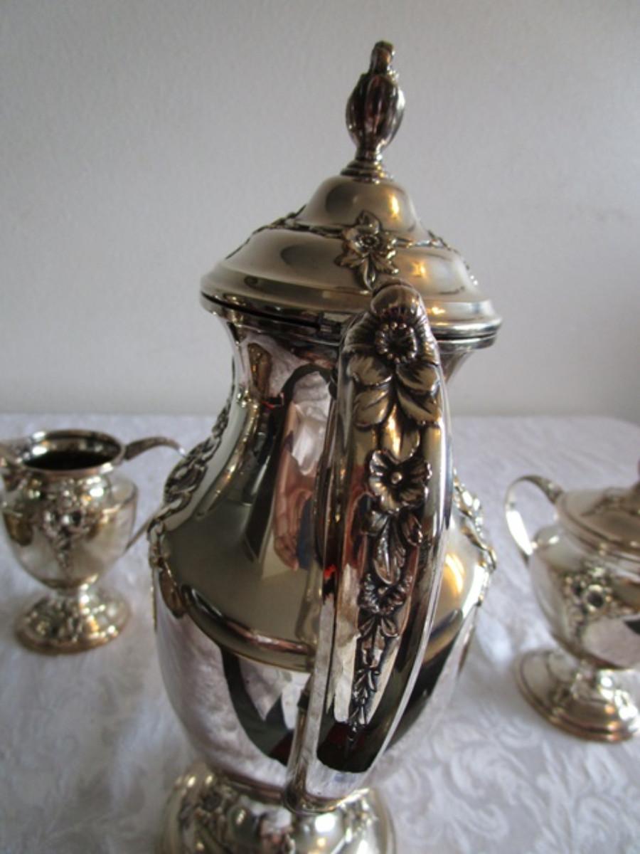 pattern is Spring Garden, Silver plated tea service (teapot with lid, creamer & sugar bowl with lid)