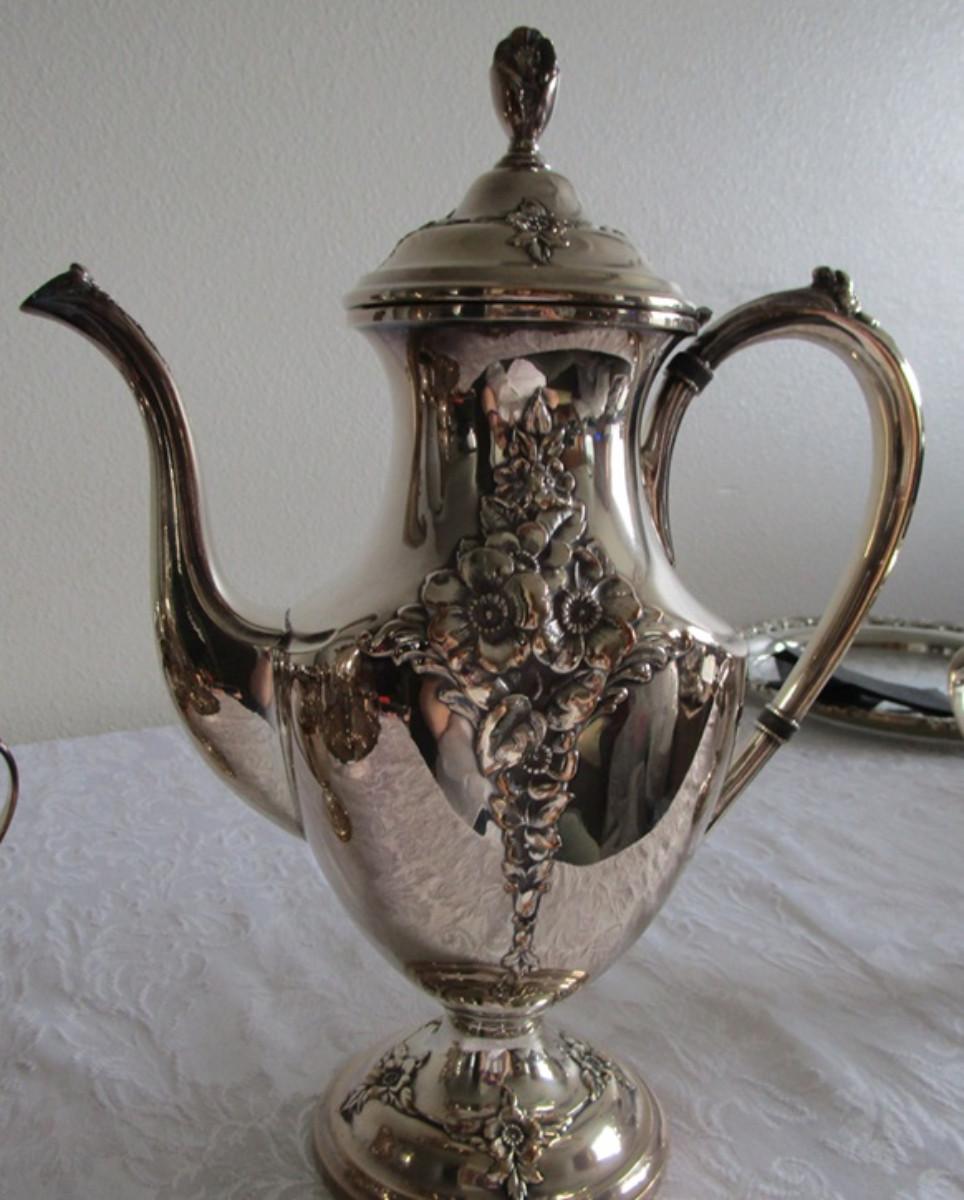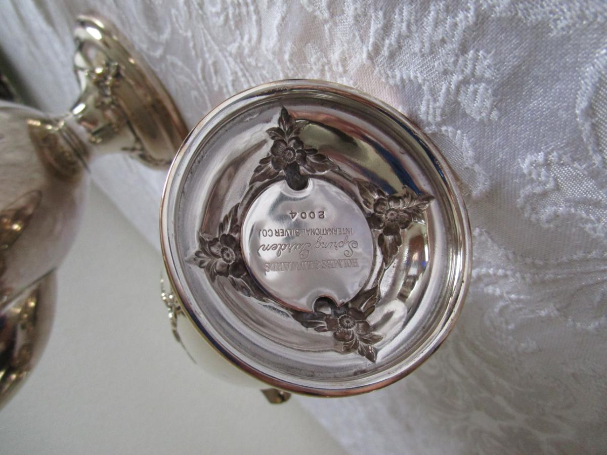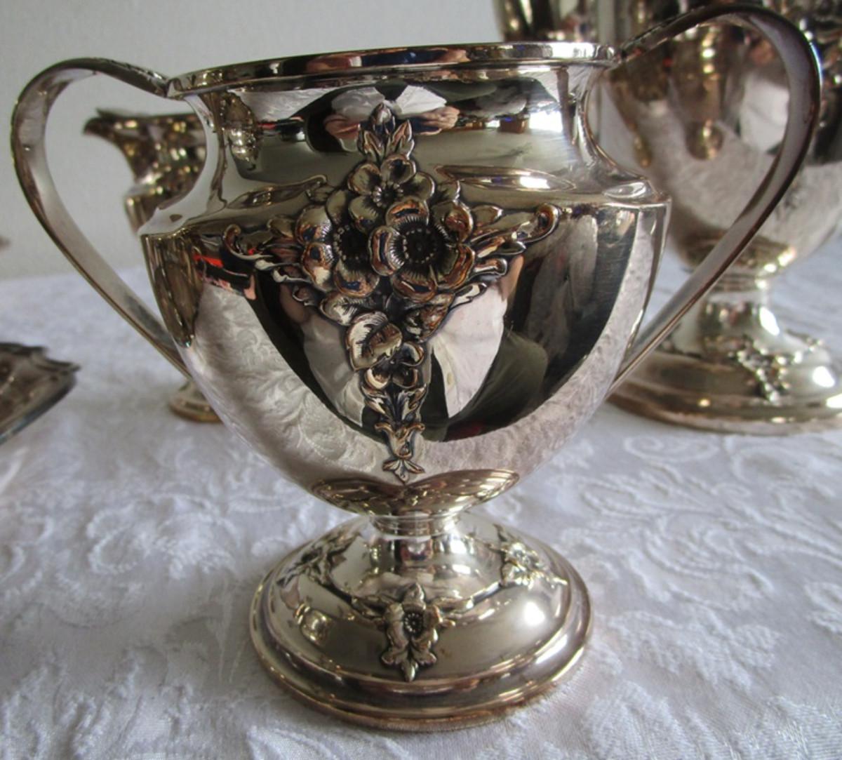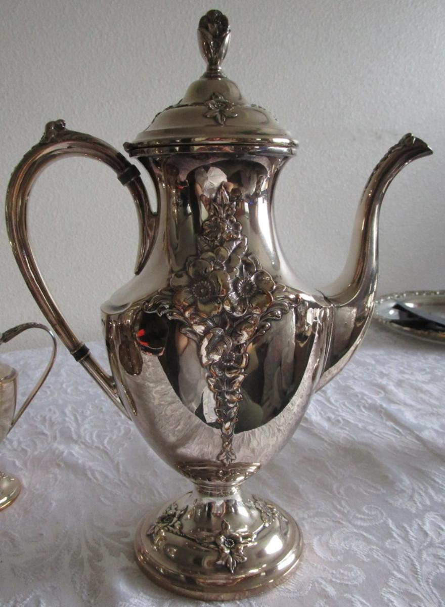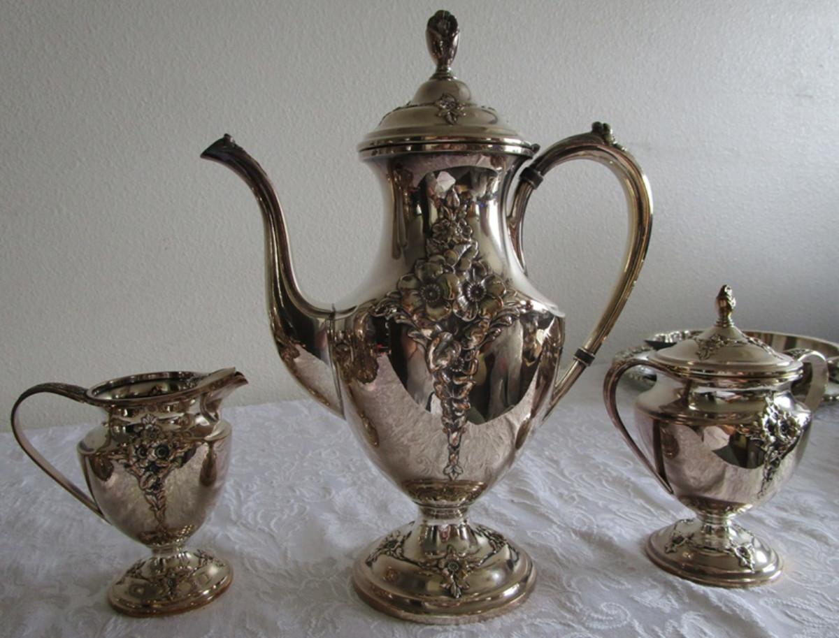 pattern is Spring Garden, Silver plated tea service (teapot with lid, creamer & sugar bowl with lid)