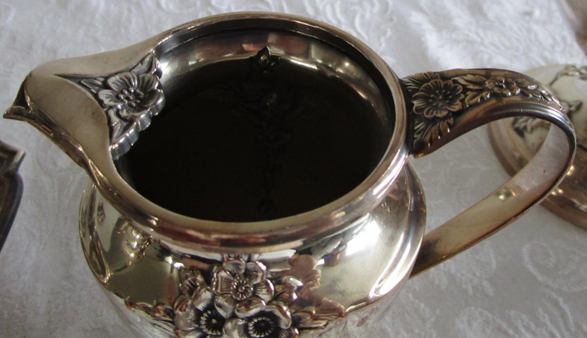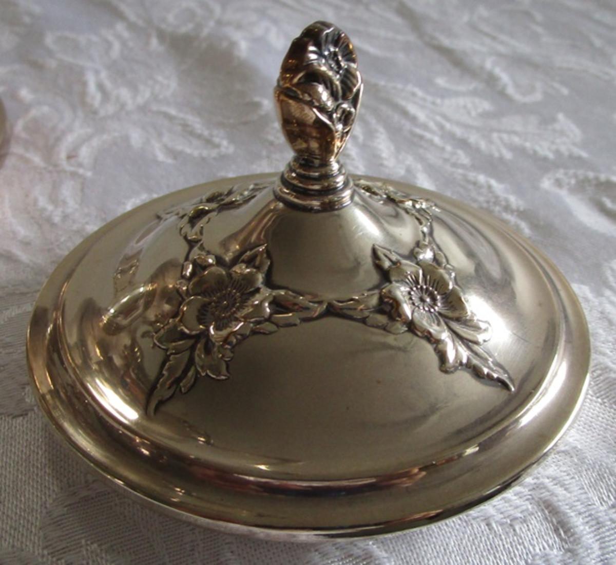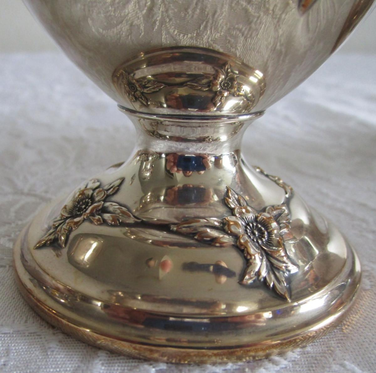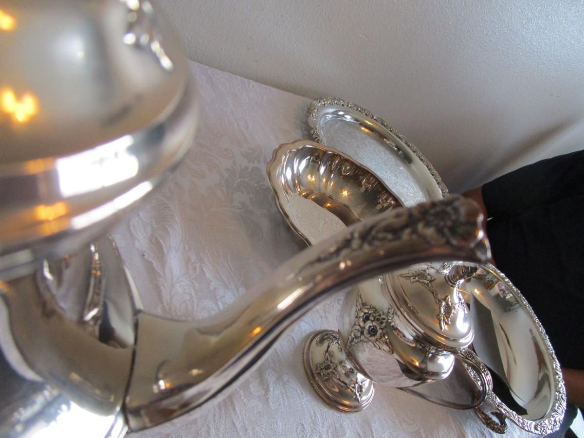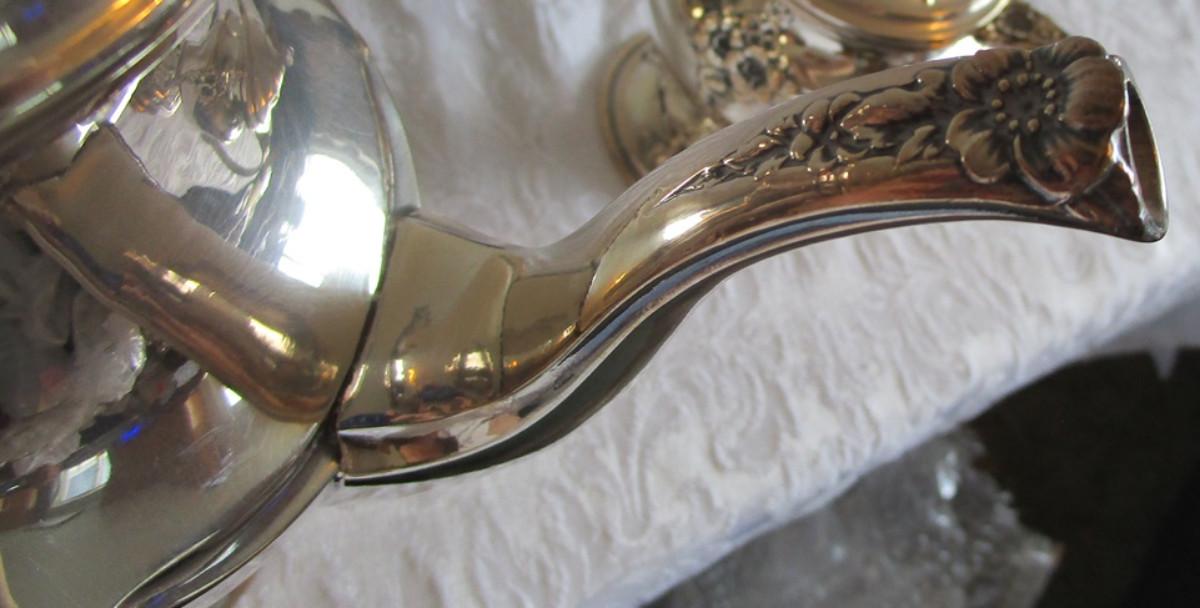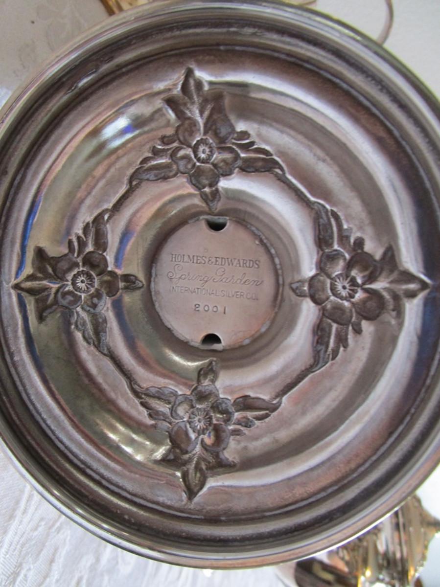 pattern is Spring Garden, Silver plated tea service (teapot with lid, creamer & sugar bowl with lid)