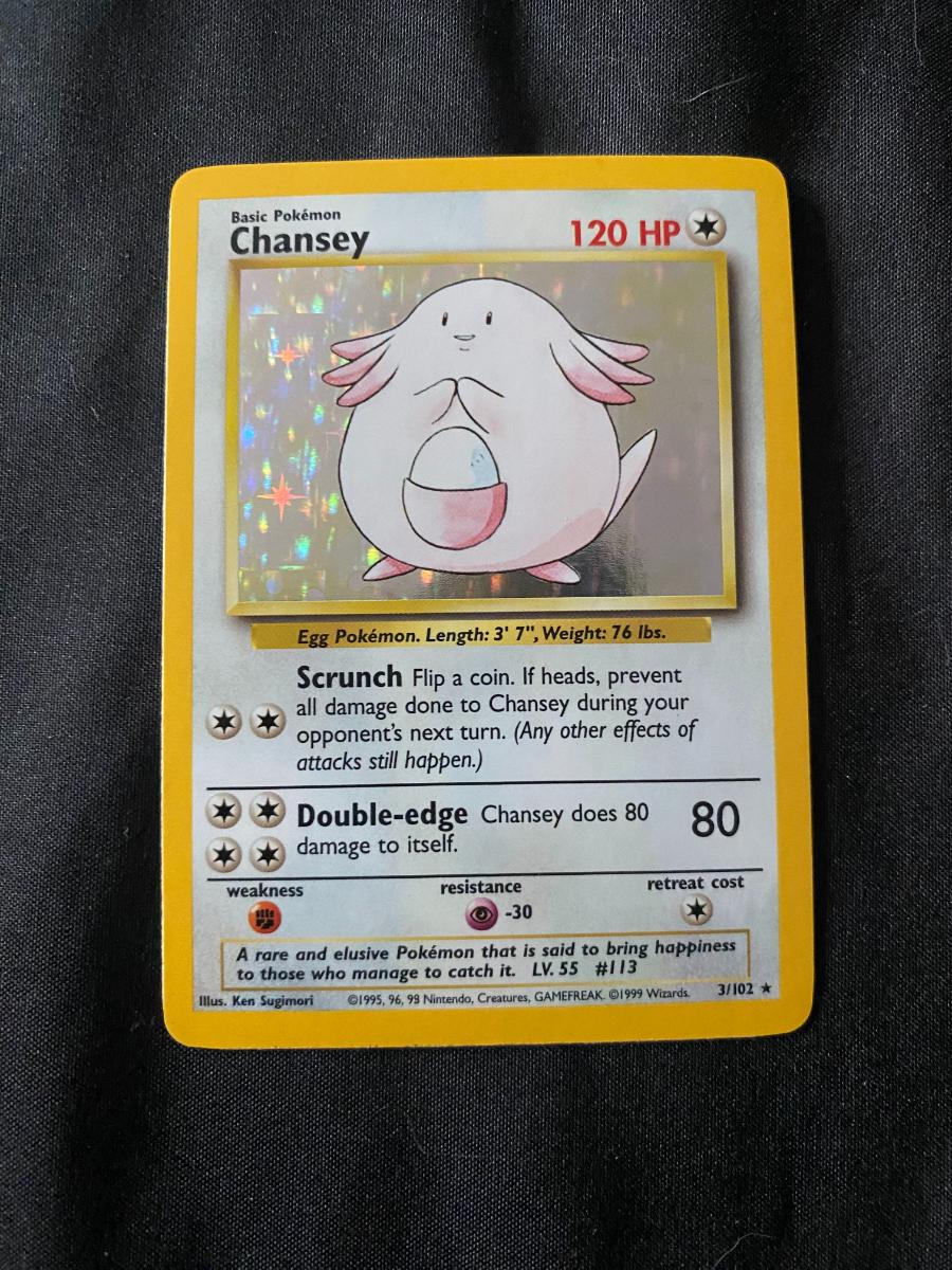 Holographic Chansey card from the Pokémon Base Set (1/102). Displays 120 HP and features the moves Scrunch and Double-edge. The card shows signs of light play, with slight edge wear visible on close inspection. Back of the card also displays minor surface wear. No creases or major damage noted.
