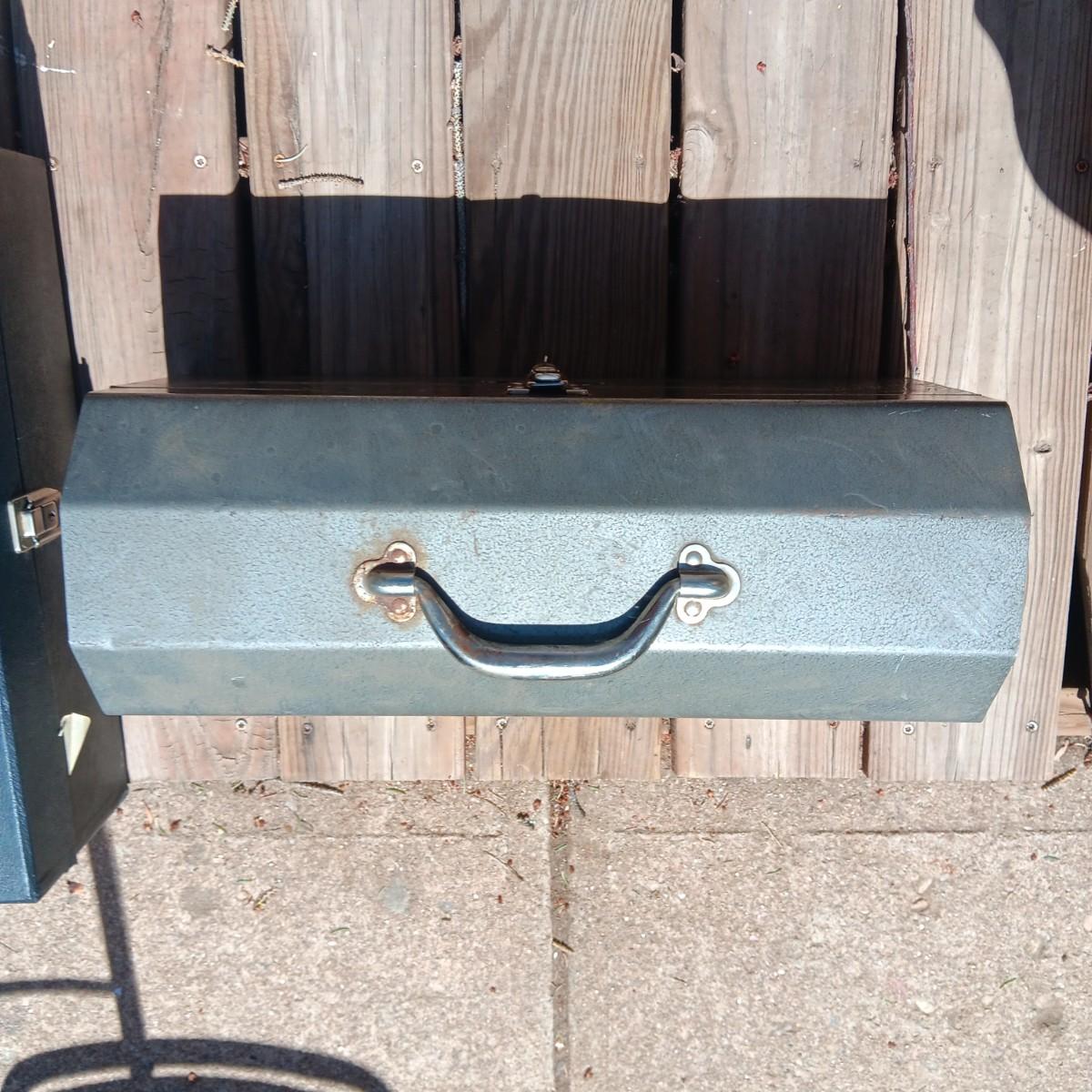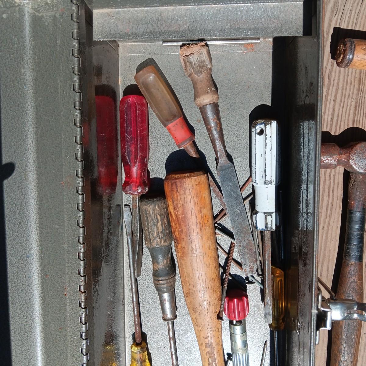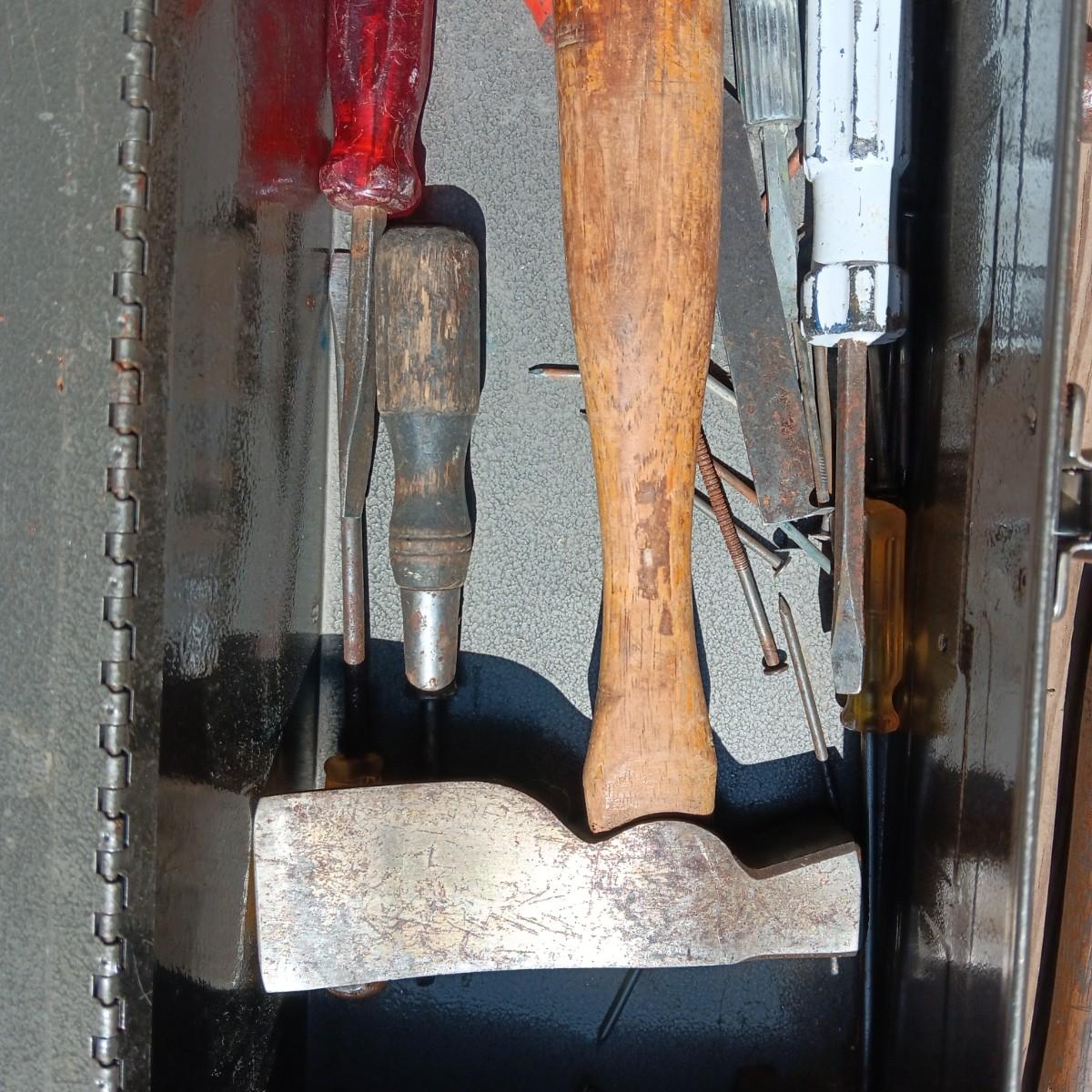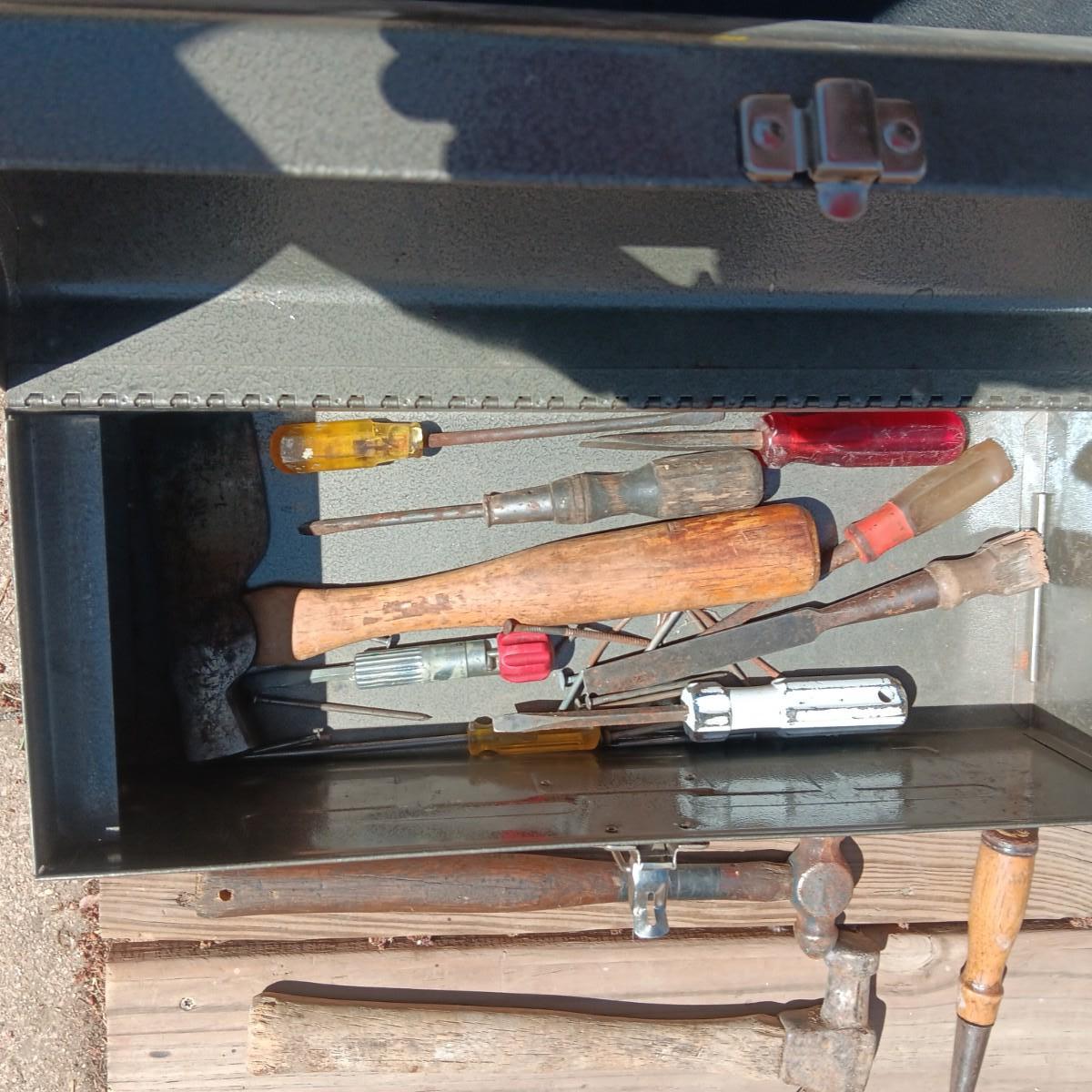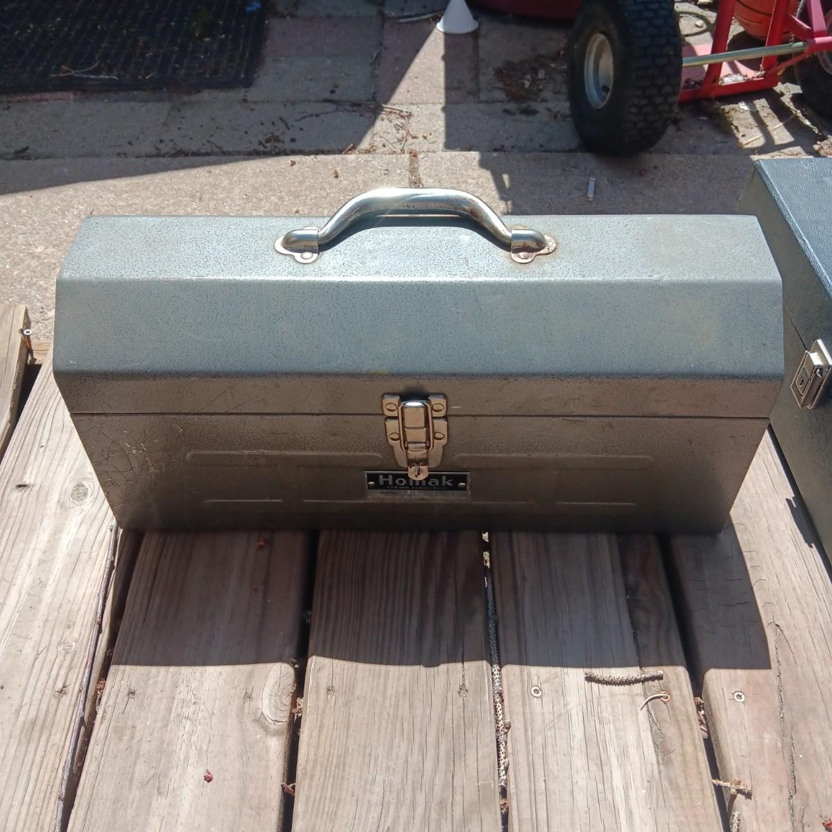 HOMAK METAL TOOL BOX WITH A VARIETY OF HAND TOOLS