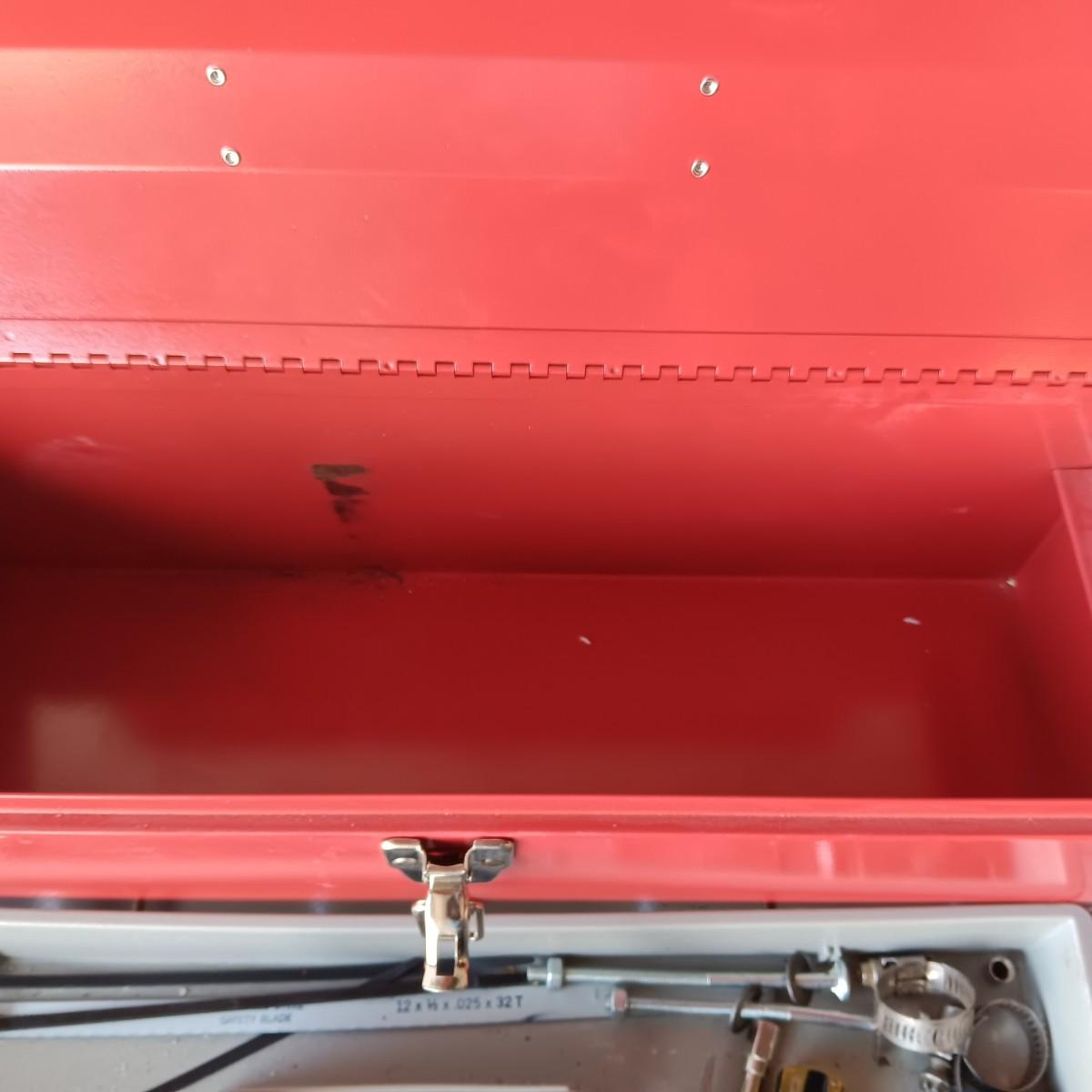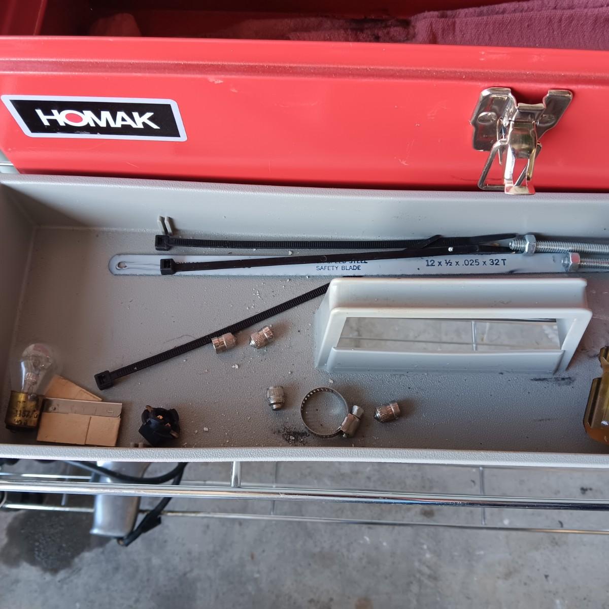 HOMAK METAL TOOL BOX WITH A SHELF AND A FEW TOOLS