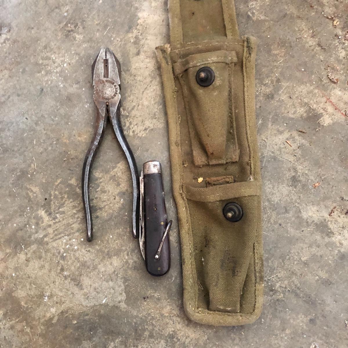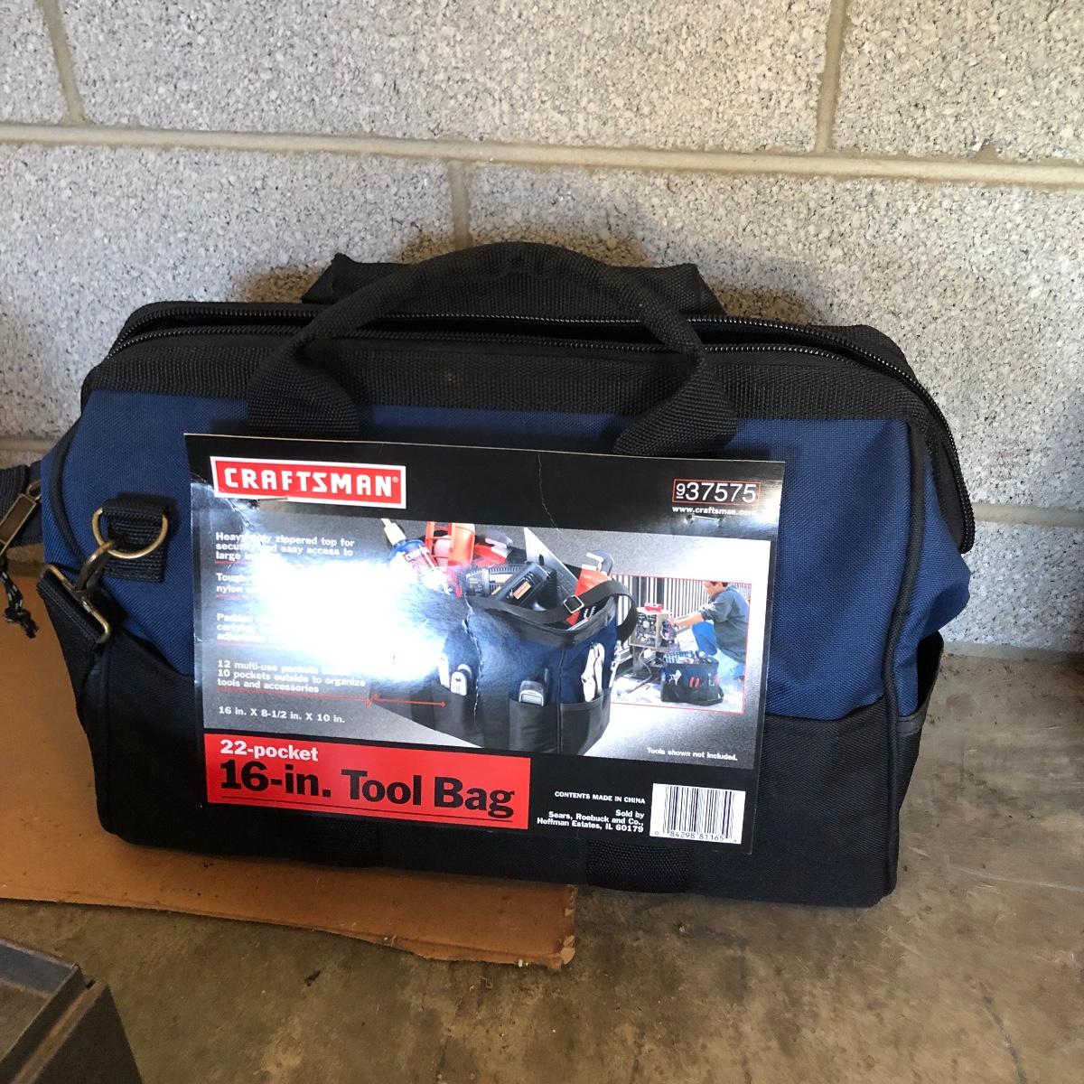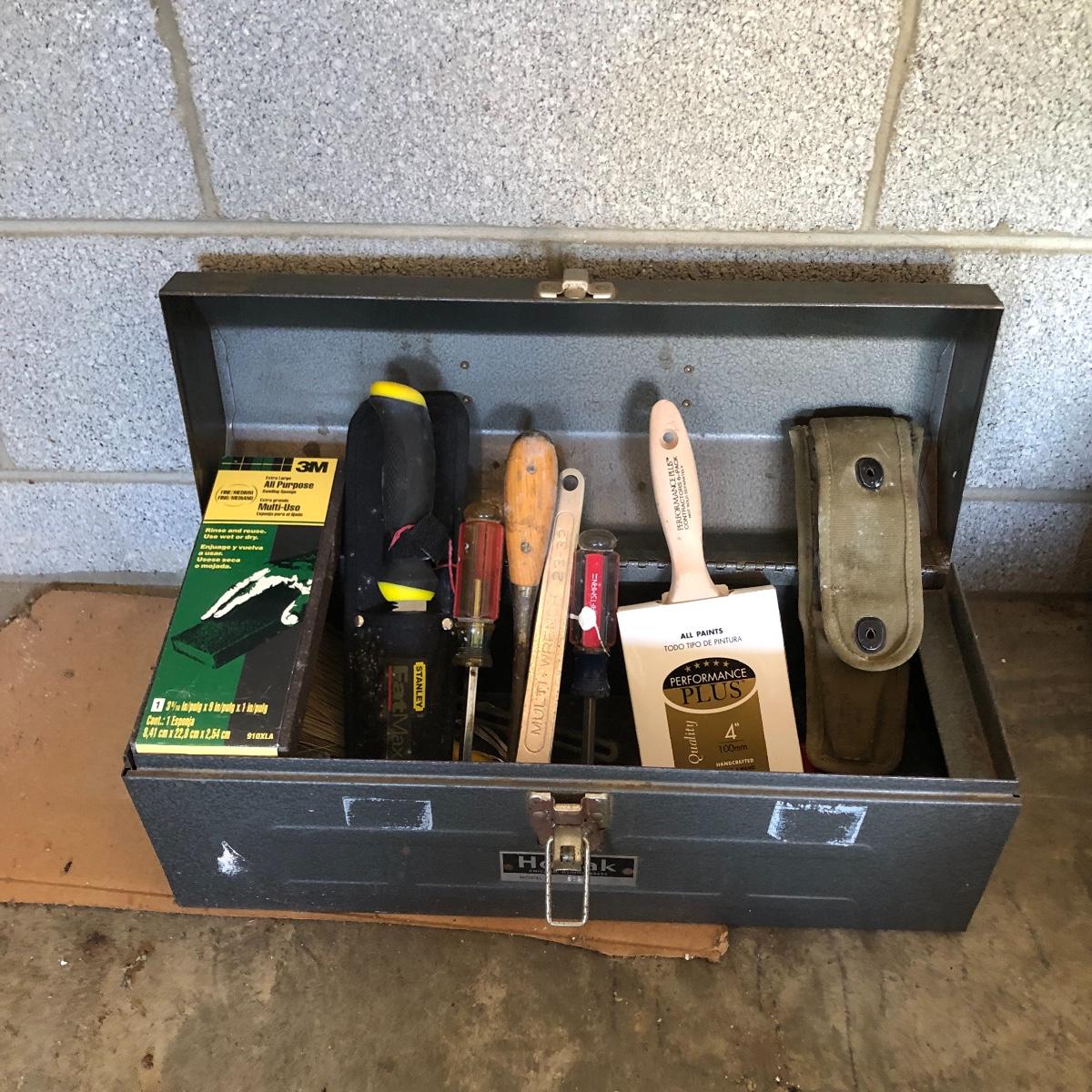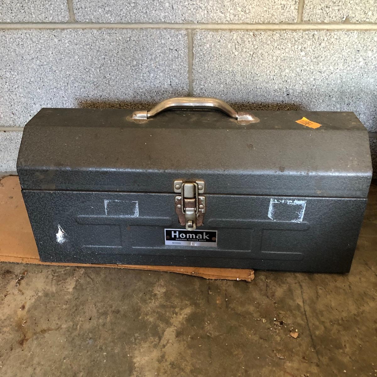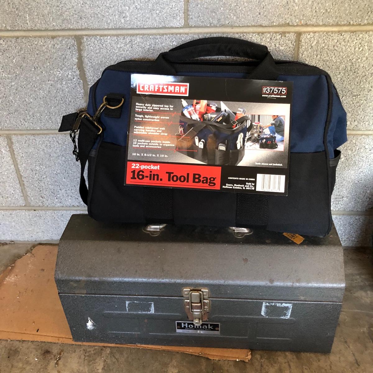 Lot includes Homak steel toolbox with contents that includes pocket knife, screwdrivers, paint brush and hand saw. Also includes Craftsman tool bag. Toolbox measures 7” x 19” x 9”.