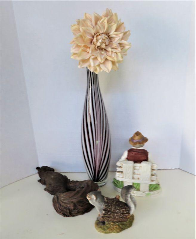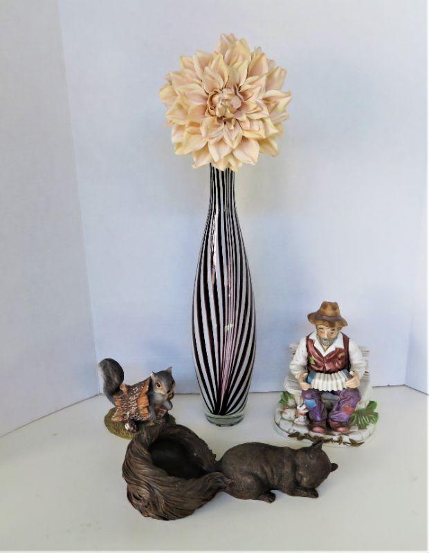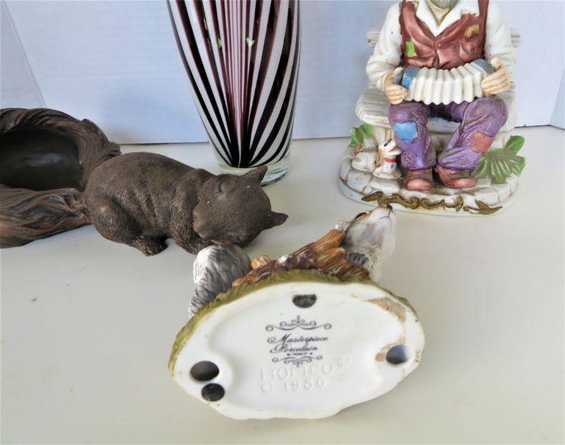 Vintage Resin Squirrel Yard decor, Homco porcelain Squirrel 1986, ceramic Old Man playing a Harmonica and Brown & White Striped Case Glass Vase LOT.