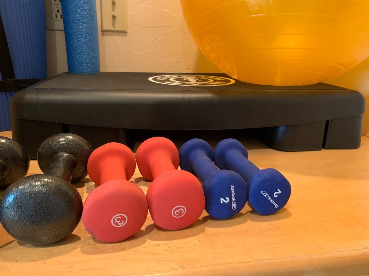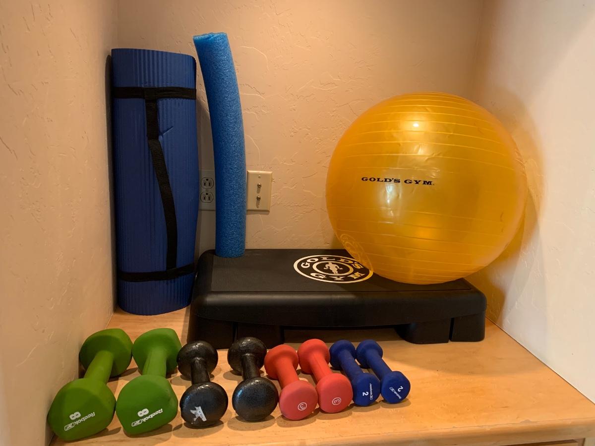 1 exercise ball, 1 stepper, 1 yoga mat, weights (1 set each) 8lbs, 5lbs, 3lbs and 2lbs