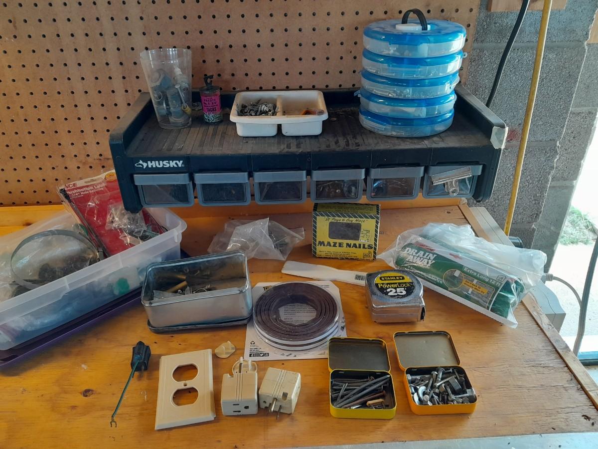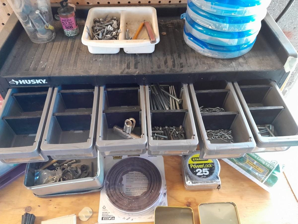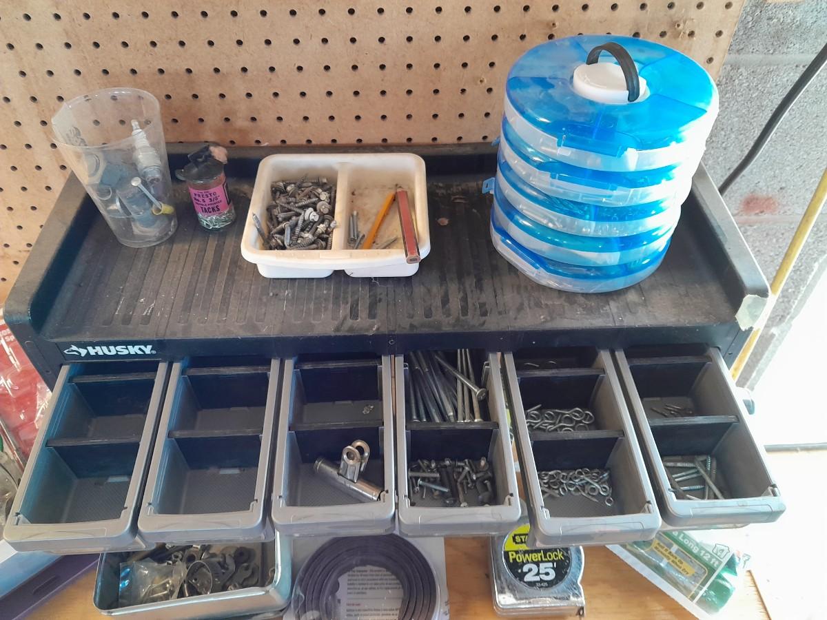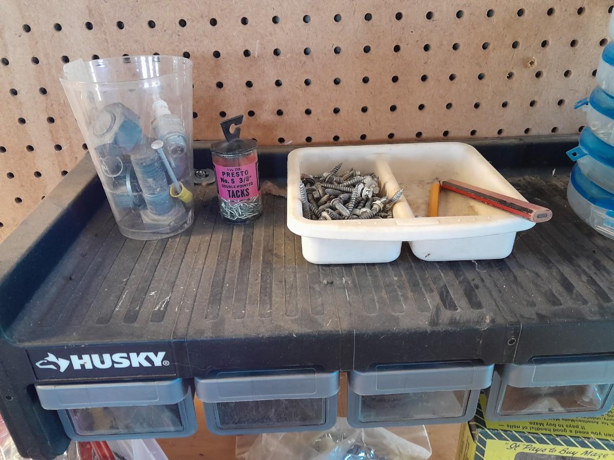 HOME AND FARM HARDWARE WITH HUSKY PEG MOUNT STORAGE BOX