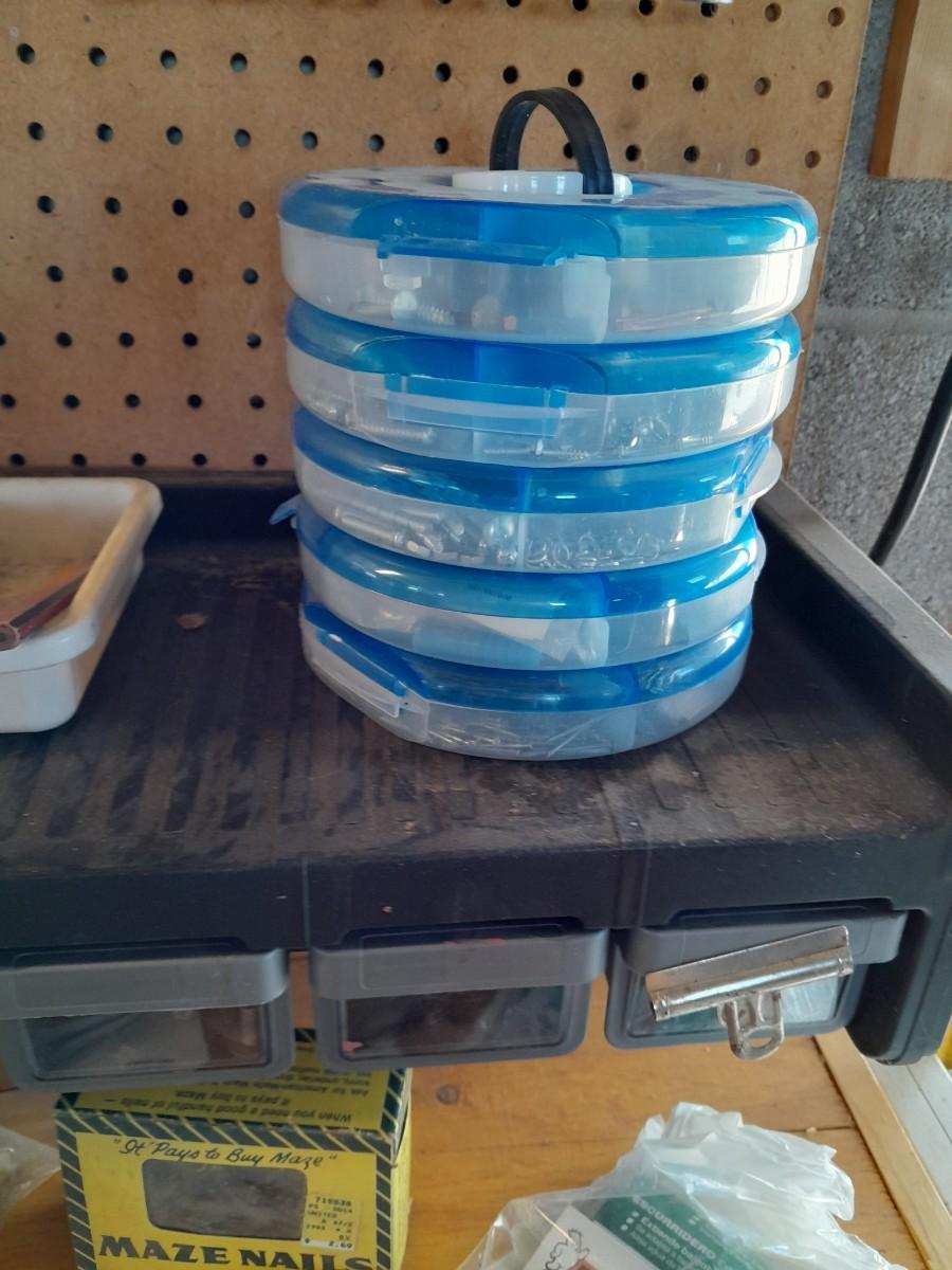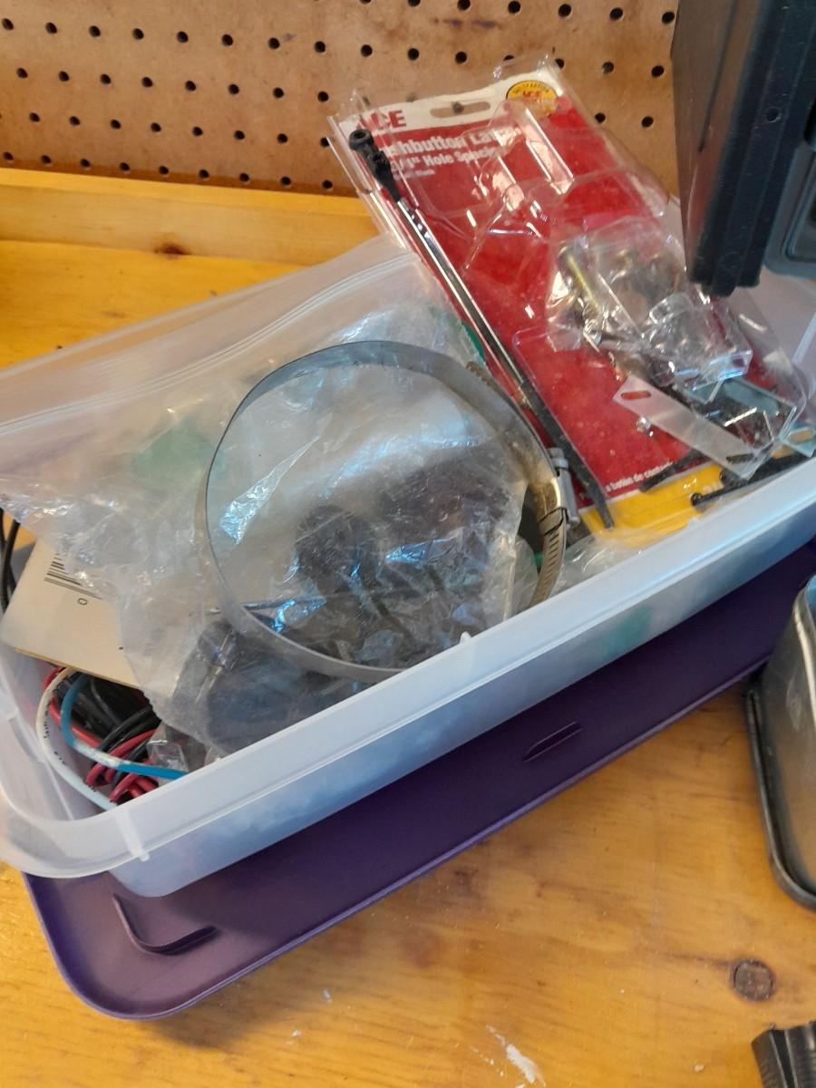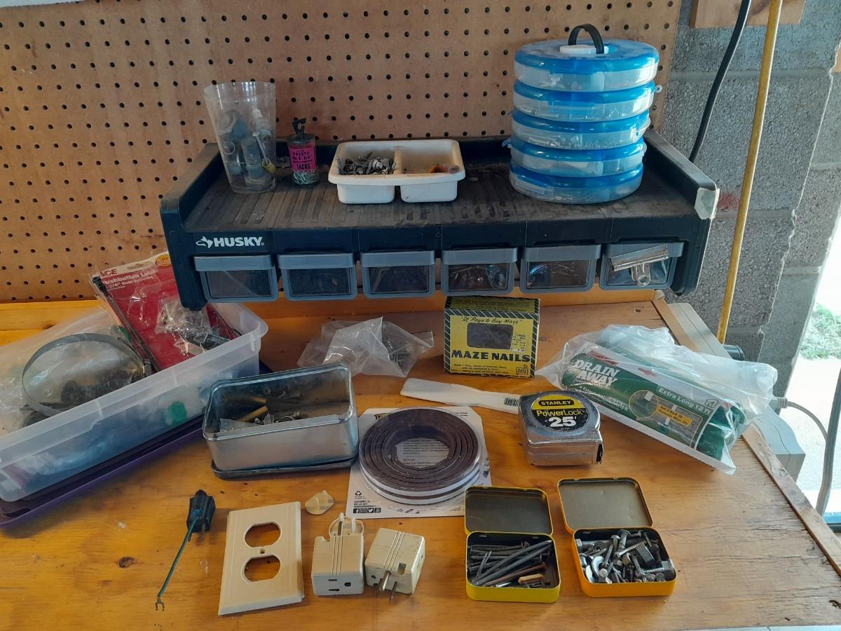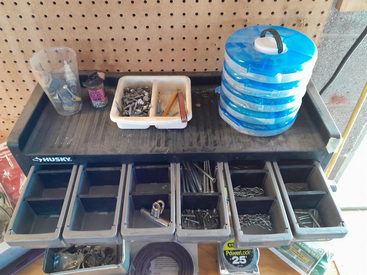 HOME AND FARM HARDWARE WITH HUSKY PEG MOUNT STORAGE BOX