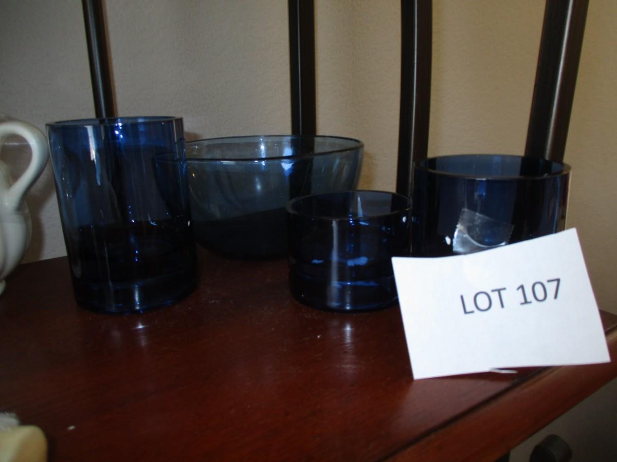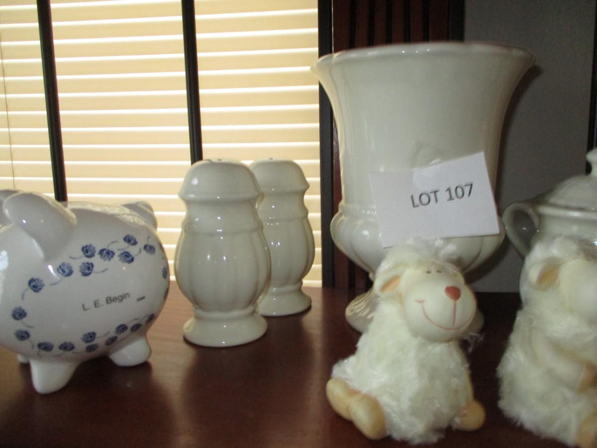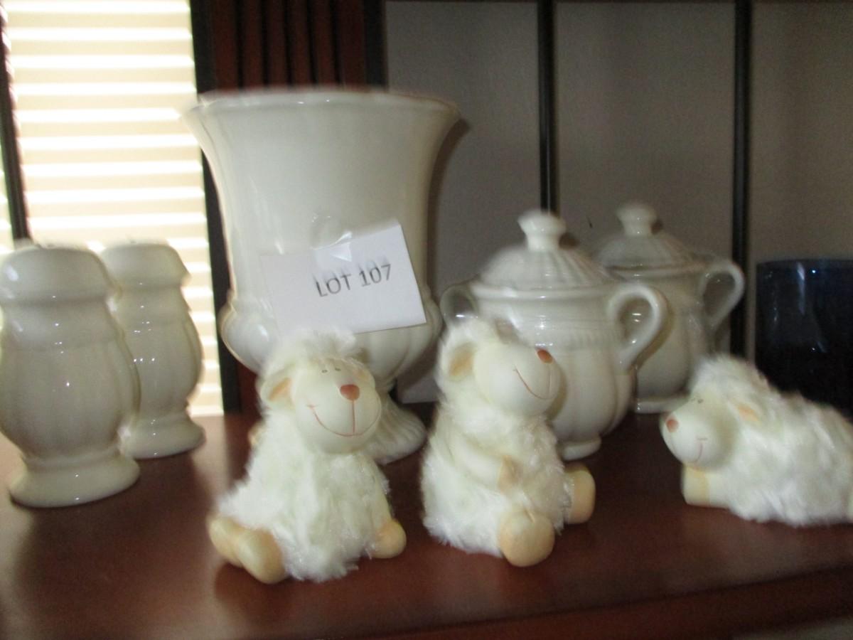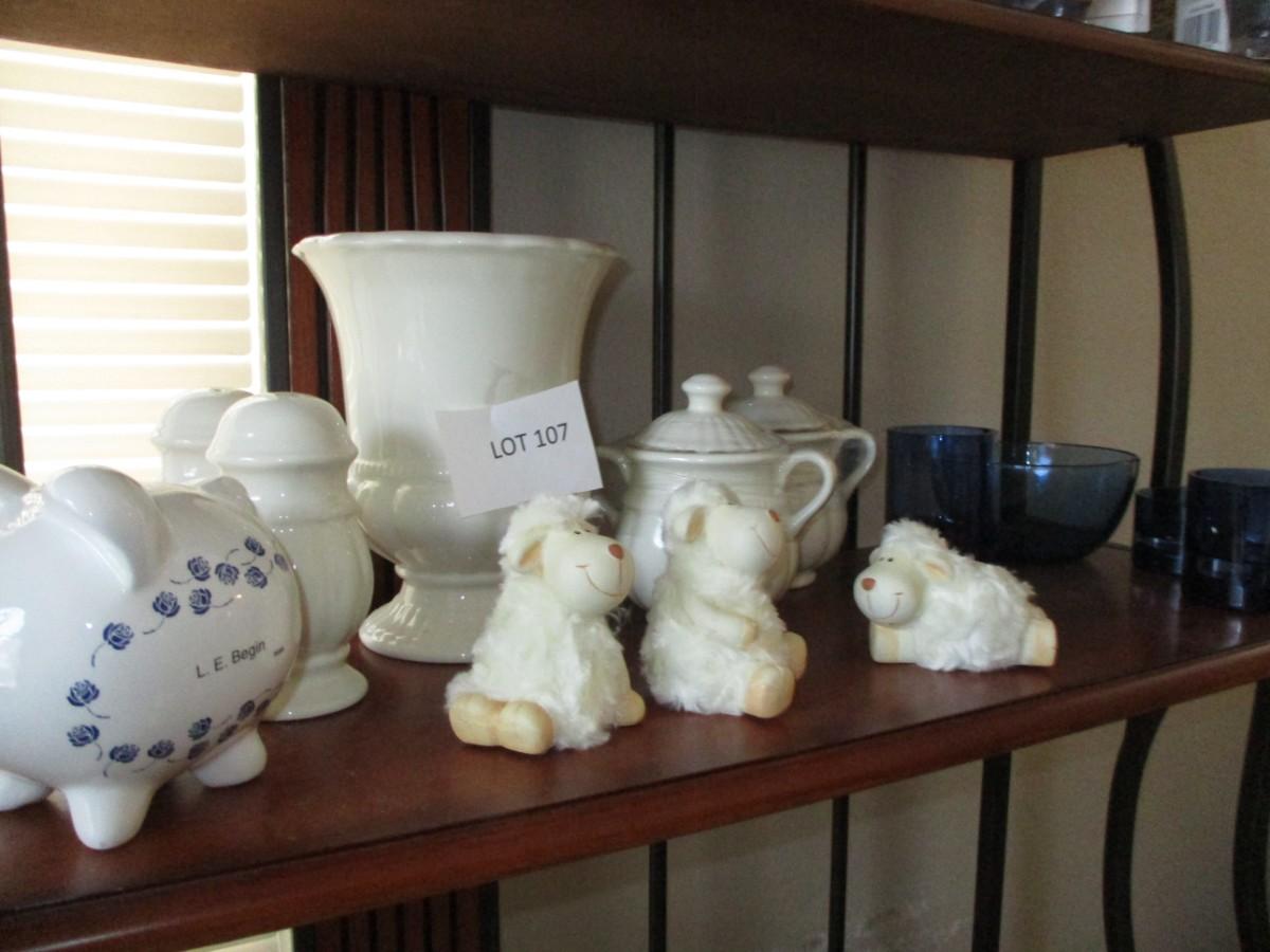 Sheep collectibles, blue Glass bowl and cups, Large vase