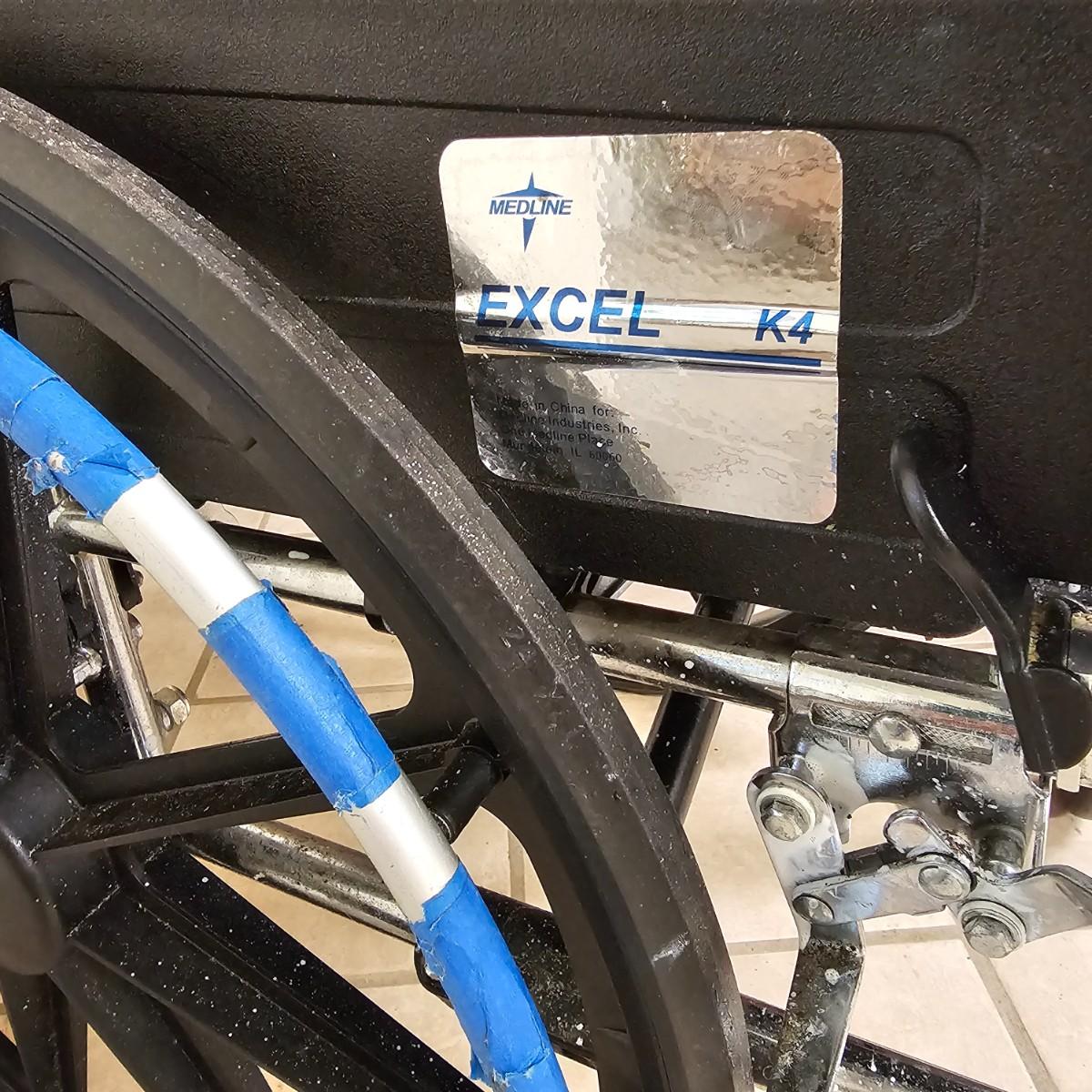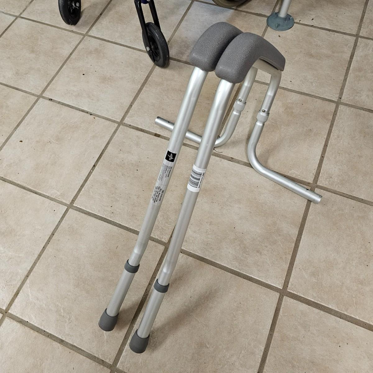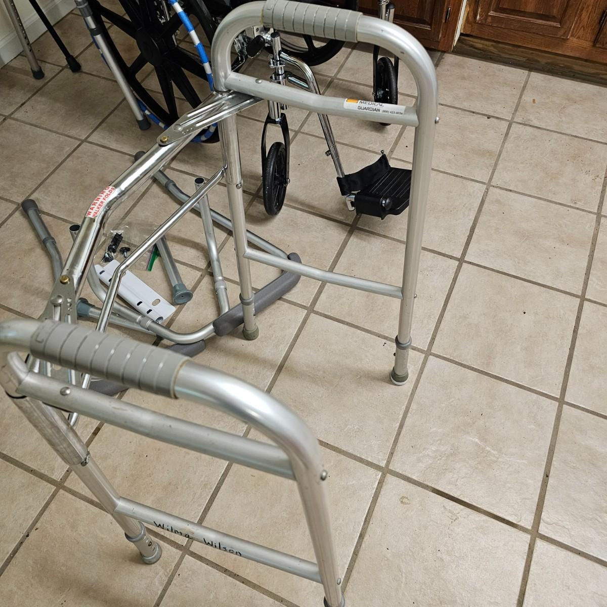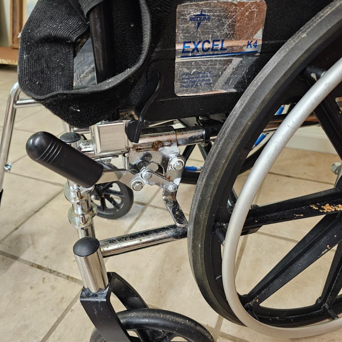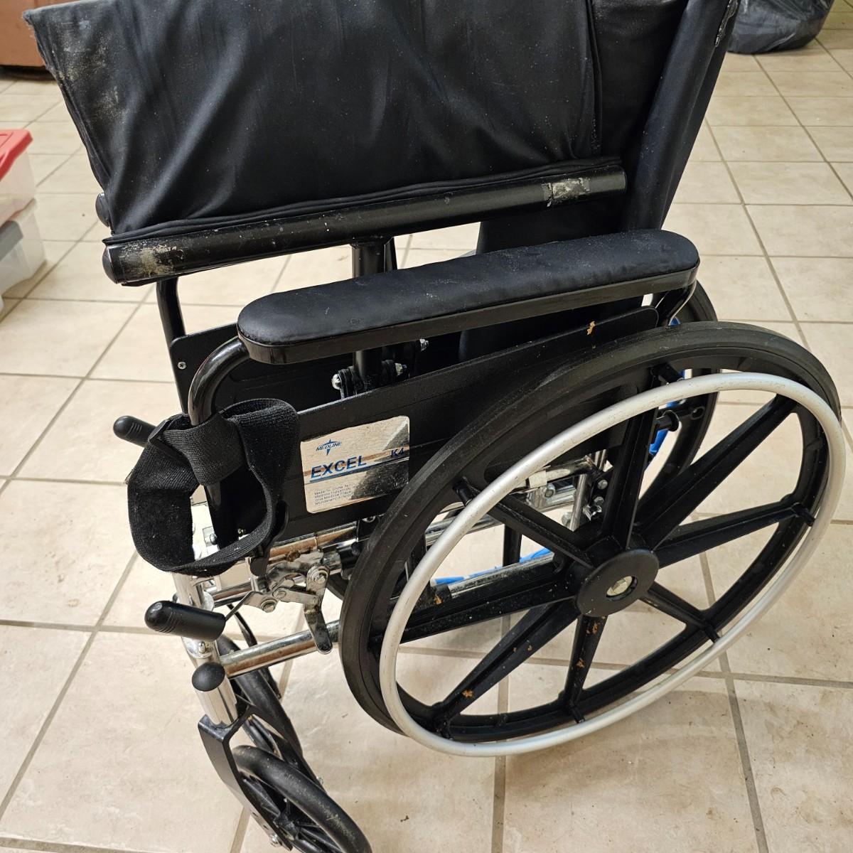 Several pieces of equipment for home care and mobility. Collapsible walker, large chair and a half shower seat with back and adjustable legs, 30" x 22" x 37"H. One aluminum crutch, one hand cane and a type of leg wrap/protector by Limbguard. Some additional rail pieces, usage unknown. Two foldup wheelchairs; one Quickie LXI chair with removable back and seat, 21" x 32" x 36"H. One Excel K4 chair with right side attachable foot rest, 25" x 33" x 36"H. Both chairs have hand operated brakes. See photos for details. Local pickup only.