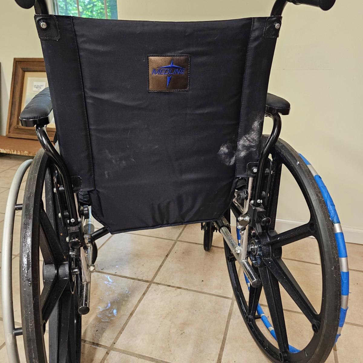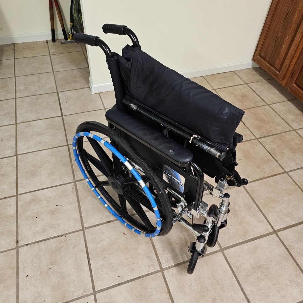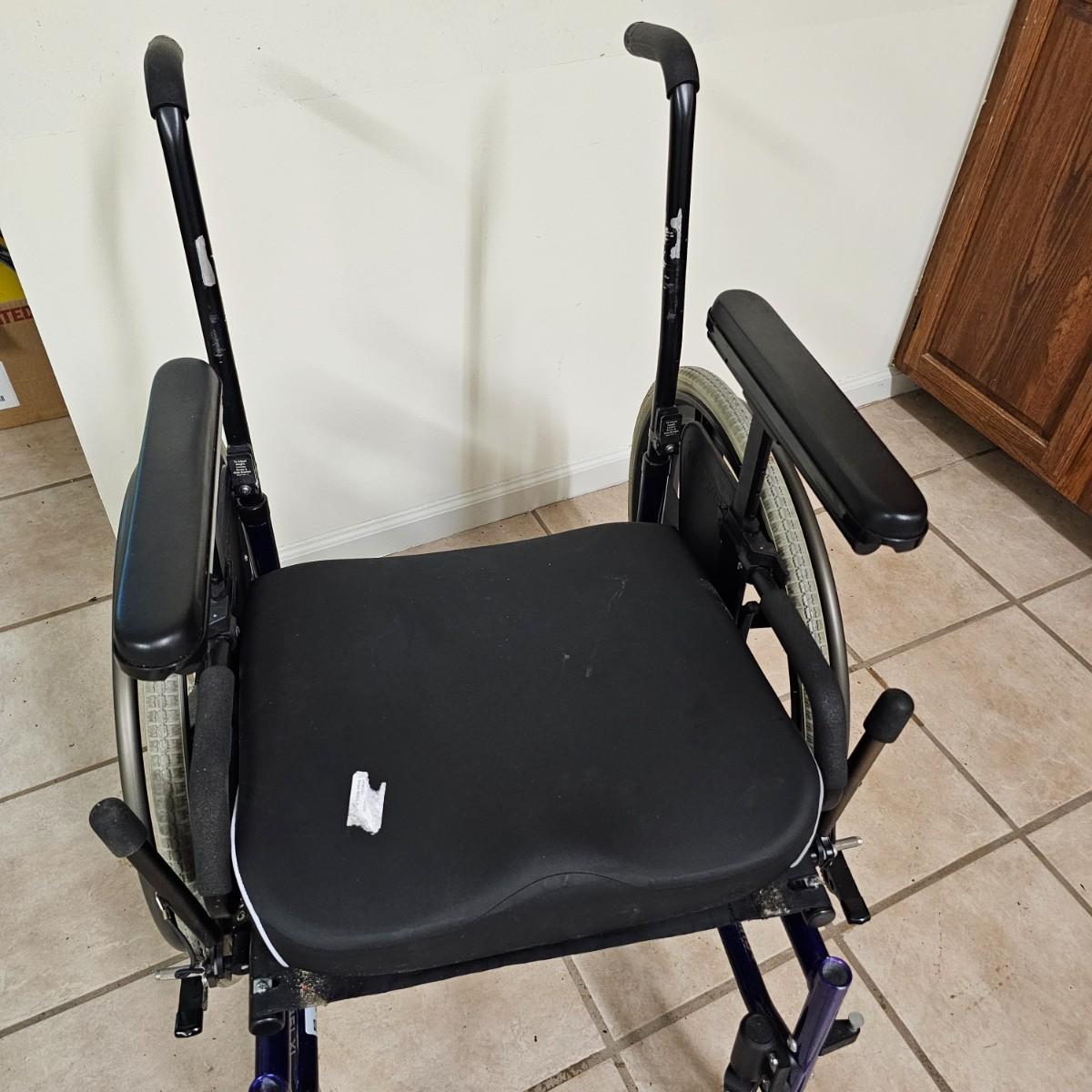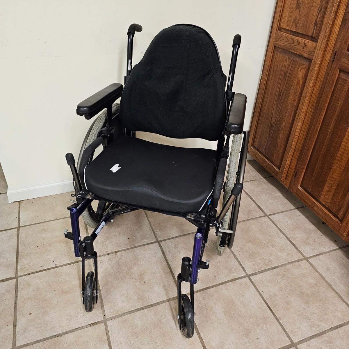 Several pieces of equipment for home care and mobility. Collapsible walker, large chair and a half shower seat with back and adjustable legs, 30" x 22" x 37"H. One aluminum crutch, one hand cane and a type of leg wrap/protector by Limbguard. Some additional rail pieces, usage unknown. Two foldup wheelchairs; one Quickie LXI chair with removable back and seat, 21" x 32" x 36"H. One Excel K4 chair with right side attachable foot rest, 25" x 33" x 36"H. Both chairs have hand operated brakes. See photos for details. Local pickup only.