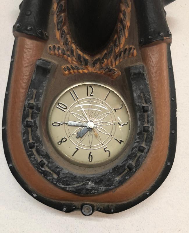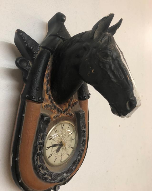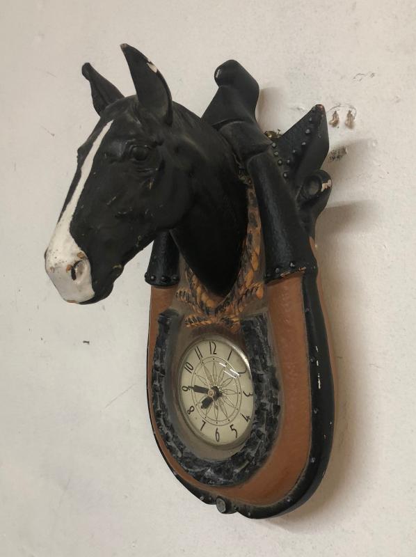 Here is a hand crafted ceramic figural Horse clock offered for repair..Non-working clock mechanism...14" high...