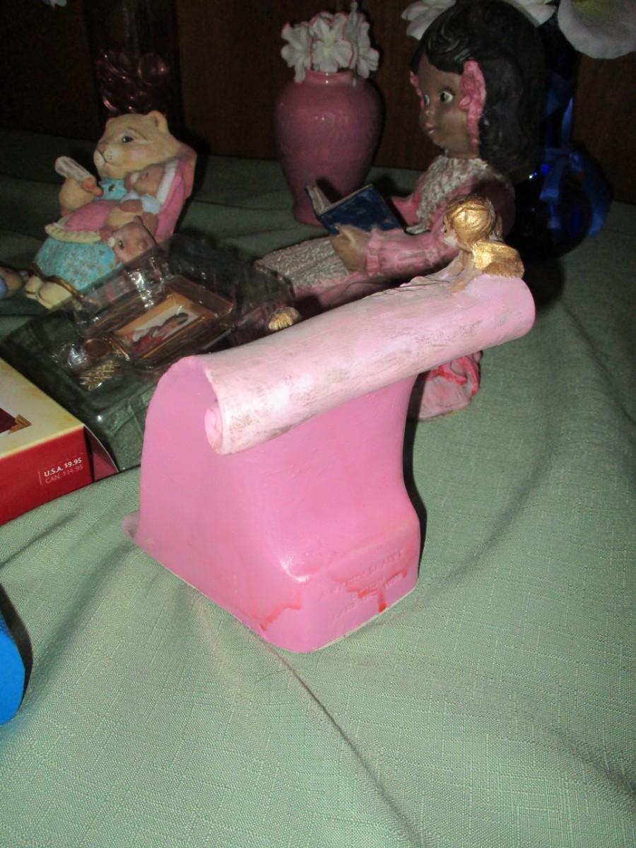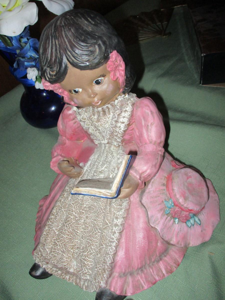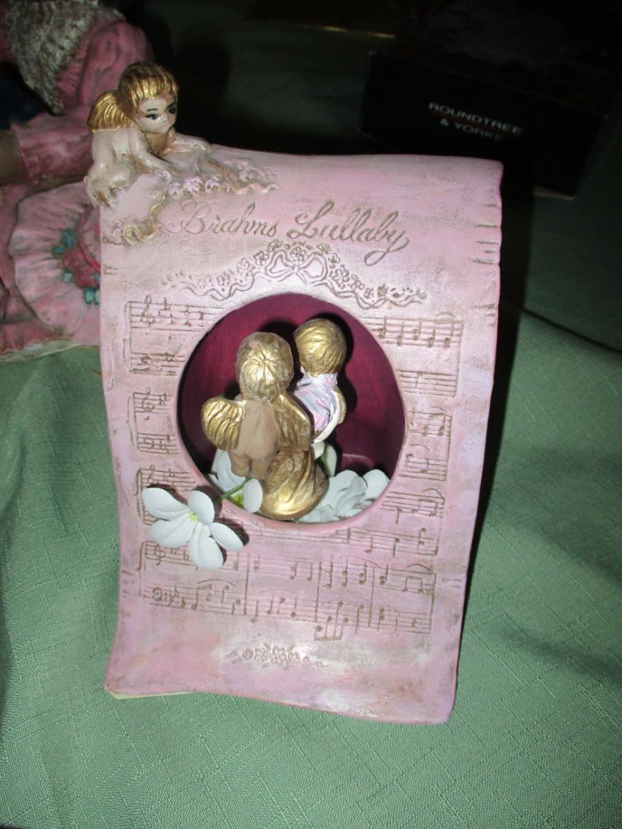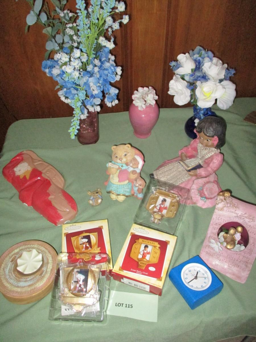 Various figurines girl w/book, Brahms lullaby, bear mother vases w/faux flowers,