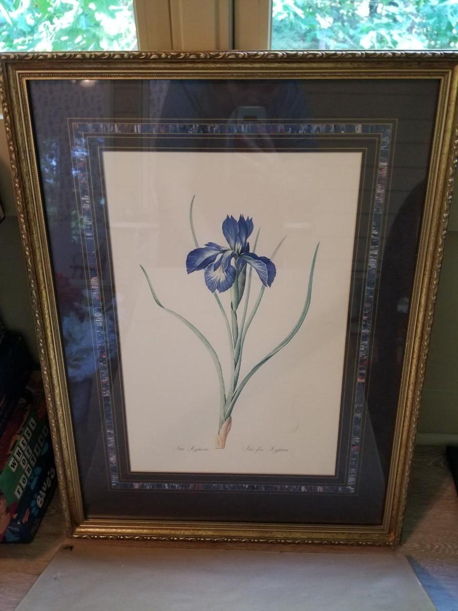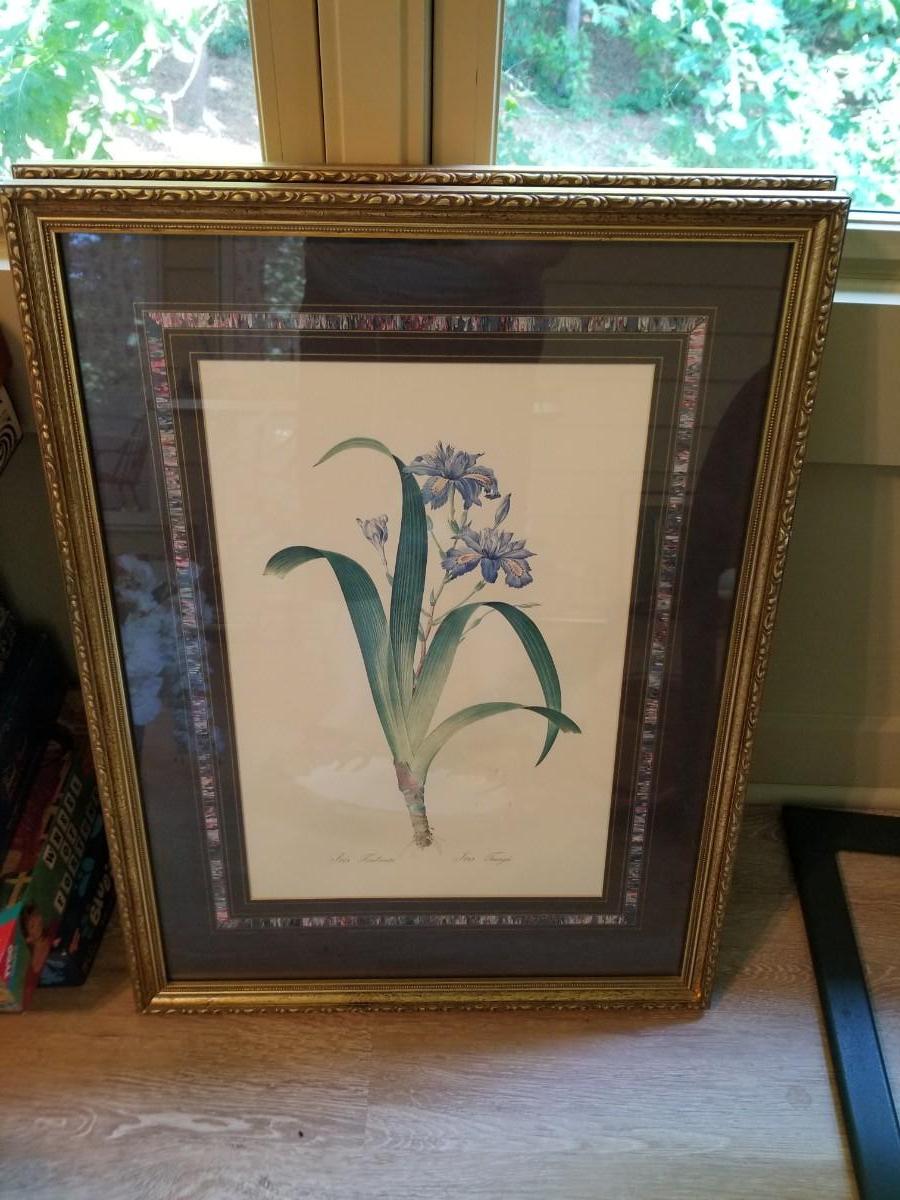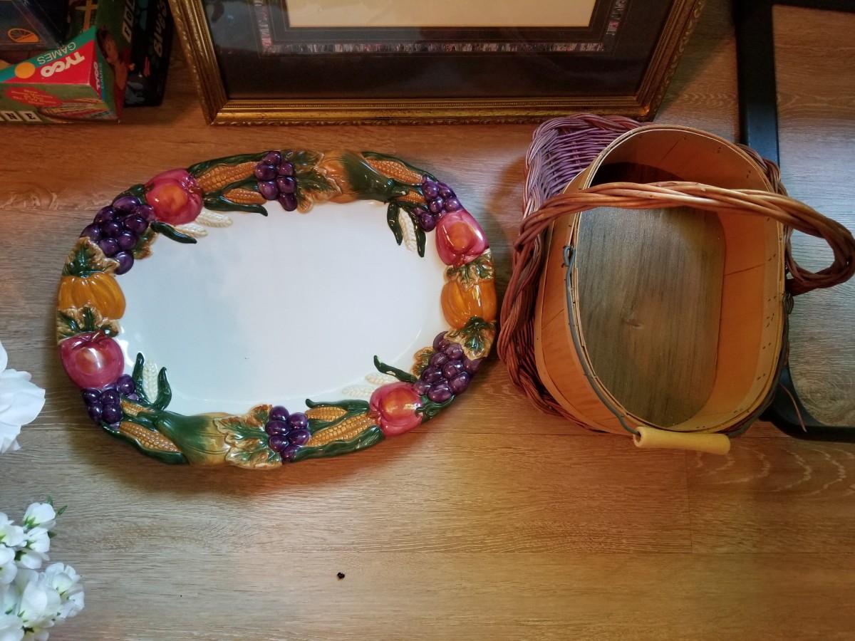 2 Large framed prints, serving dish, and baskets