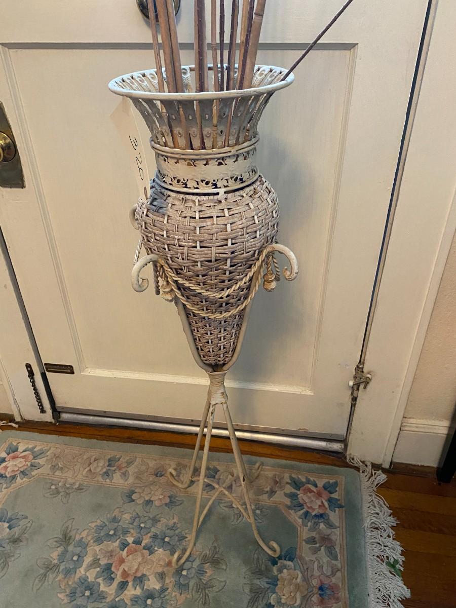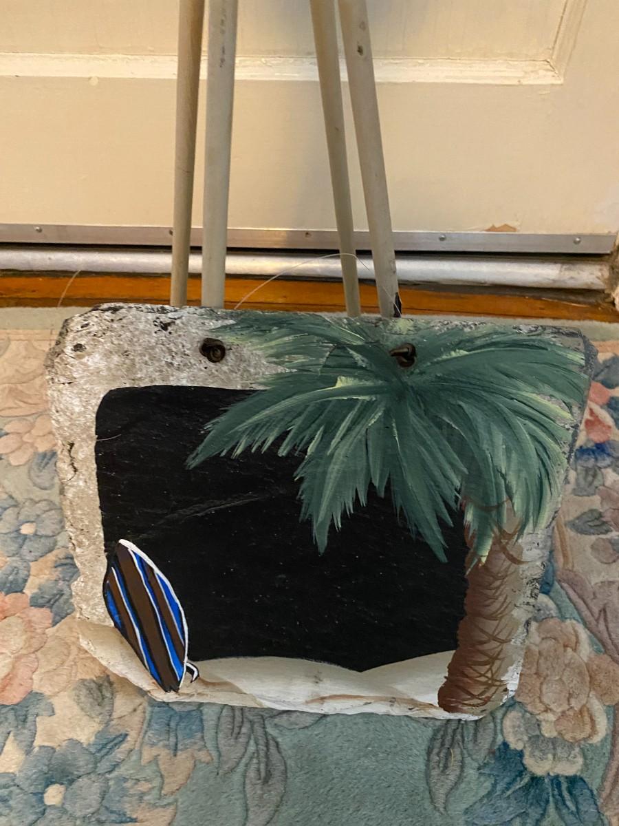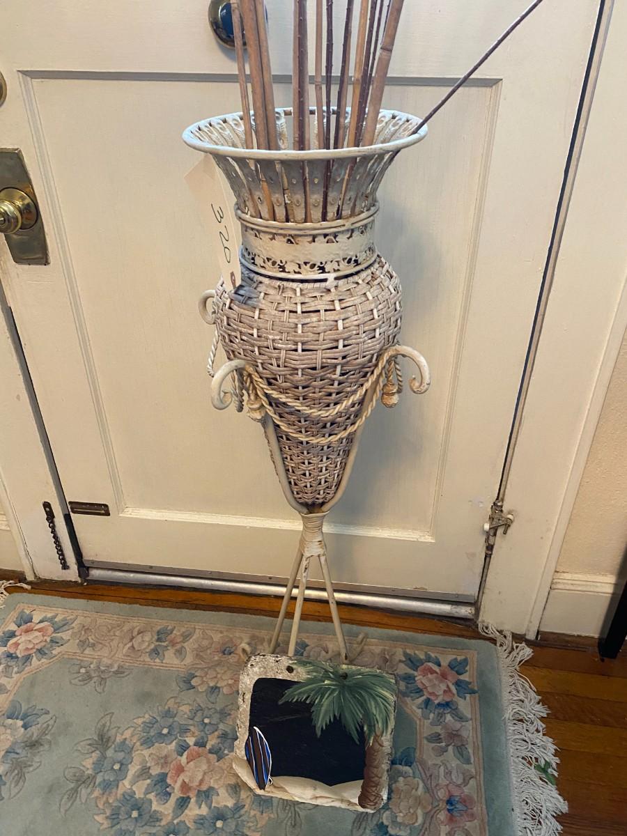 Metal Planter on Pedastal, Decorated Slate Wall Hanging As Pictured