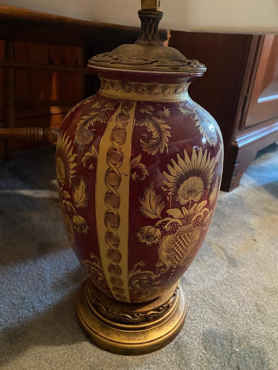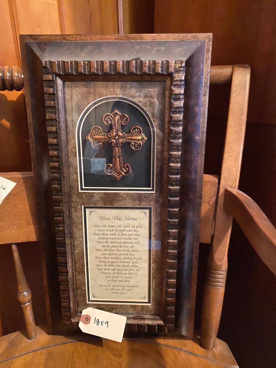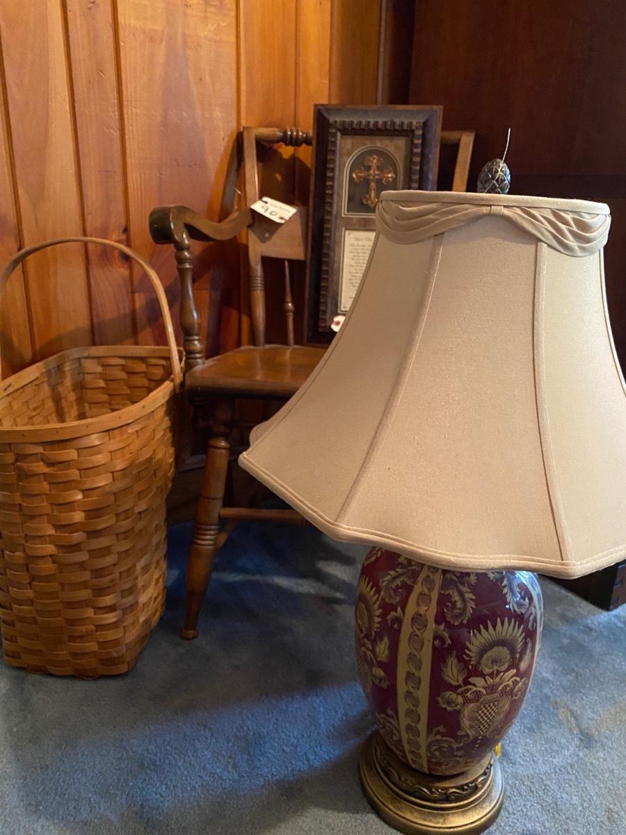 Stair Step Basket, Framed Cross, Vintage Wooden Arm Chair, Oriental Accent Lamp