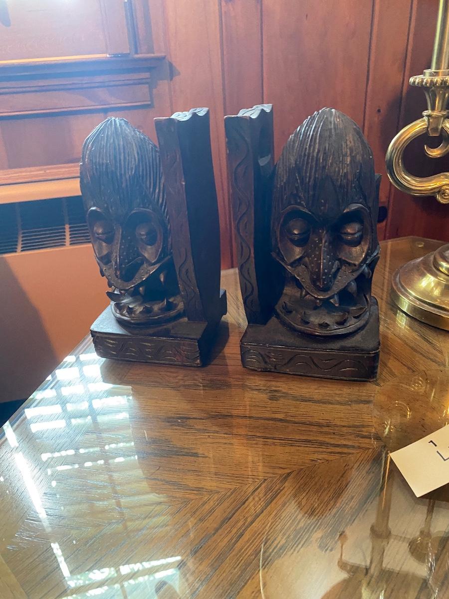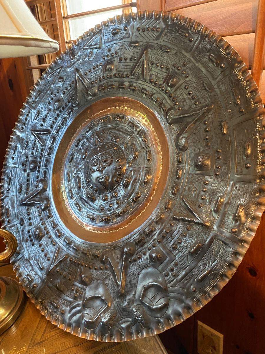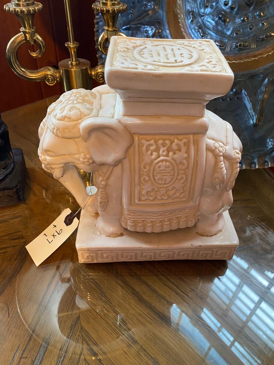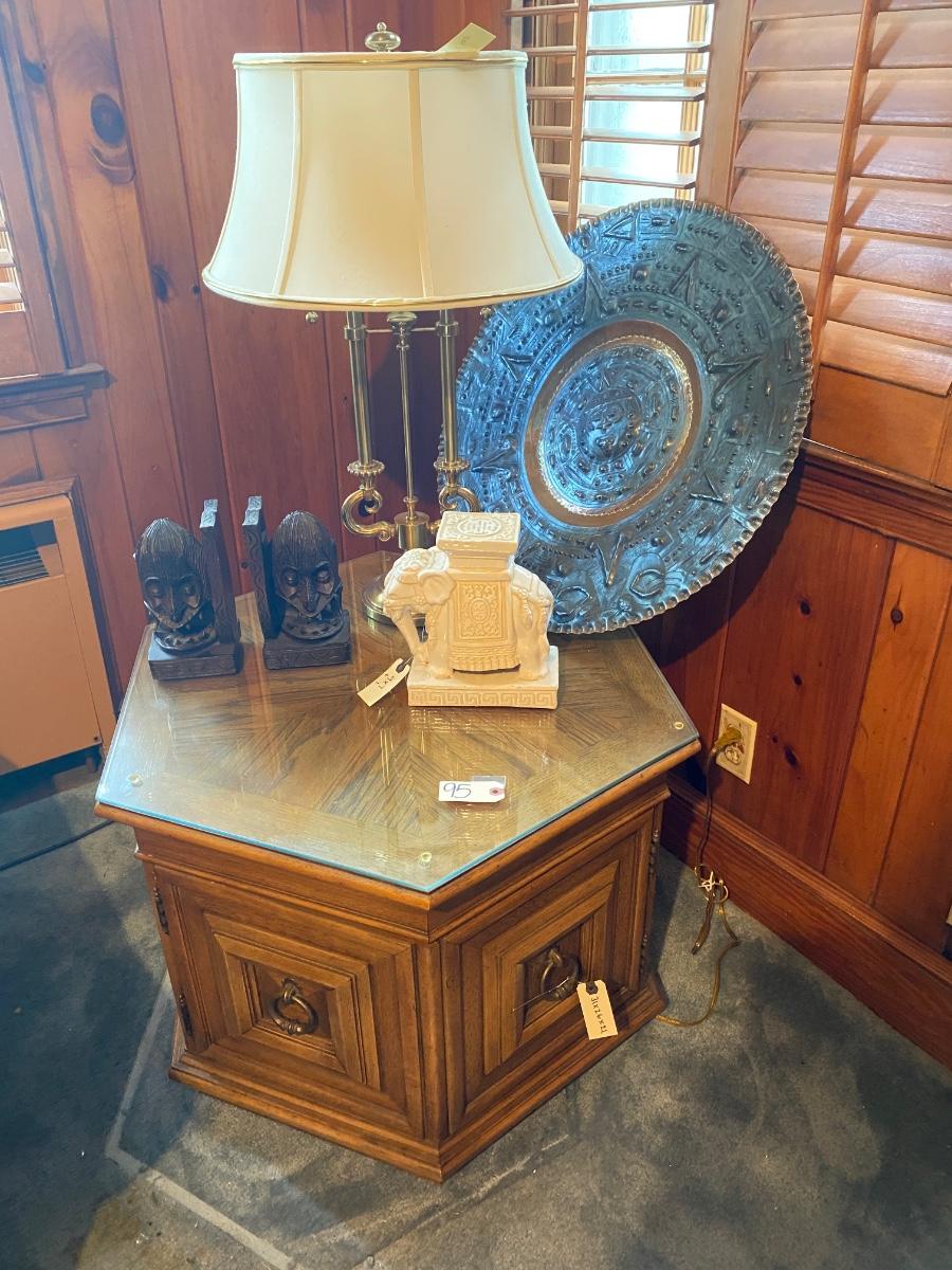 Home Décor Lot Includes Copper Clad Decorative Wall Plate, Pr of Book Ends, Octagon Accent Table, Elephant Statue, and Brass Stiffel Lamp