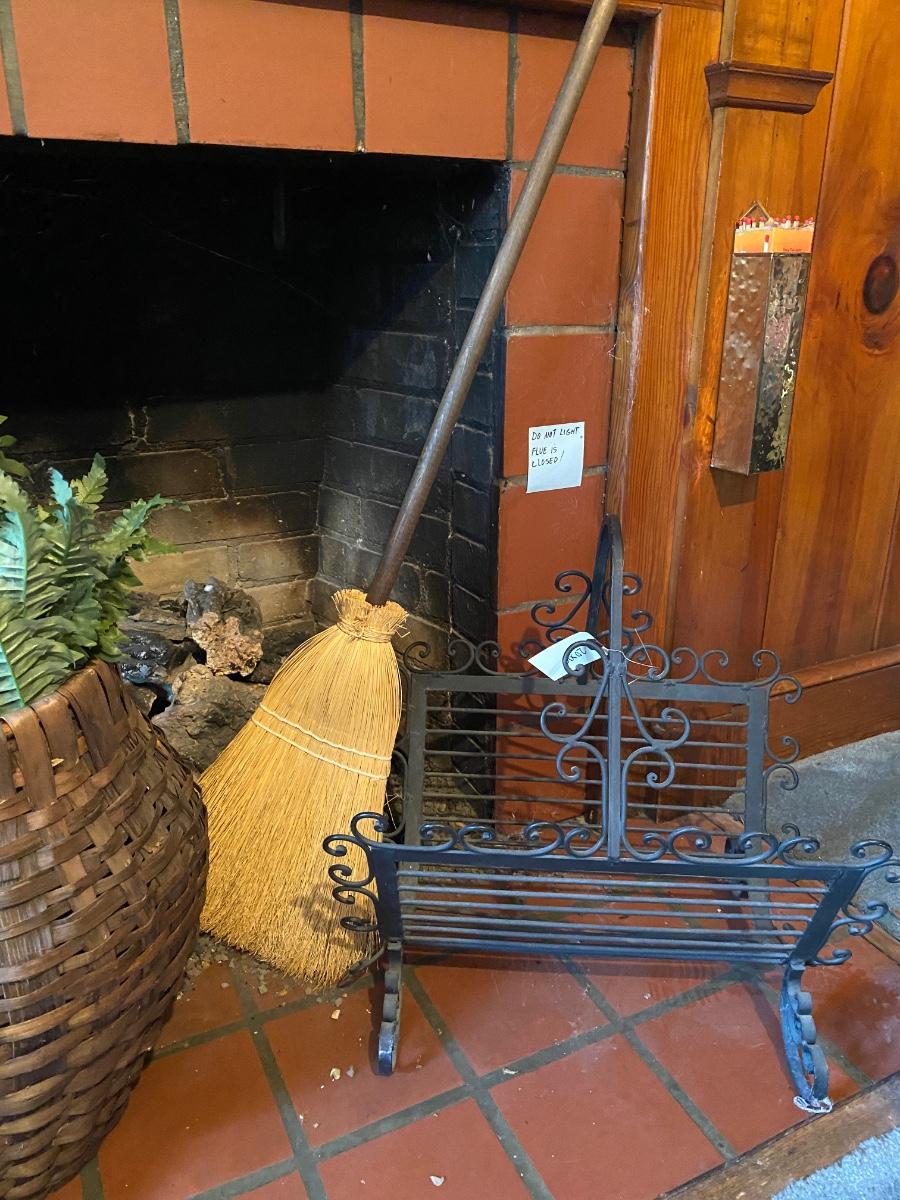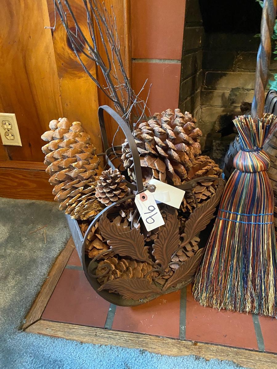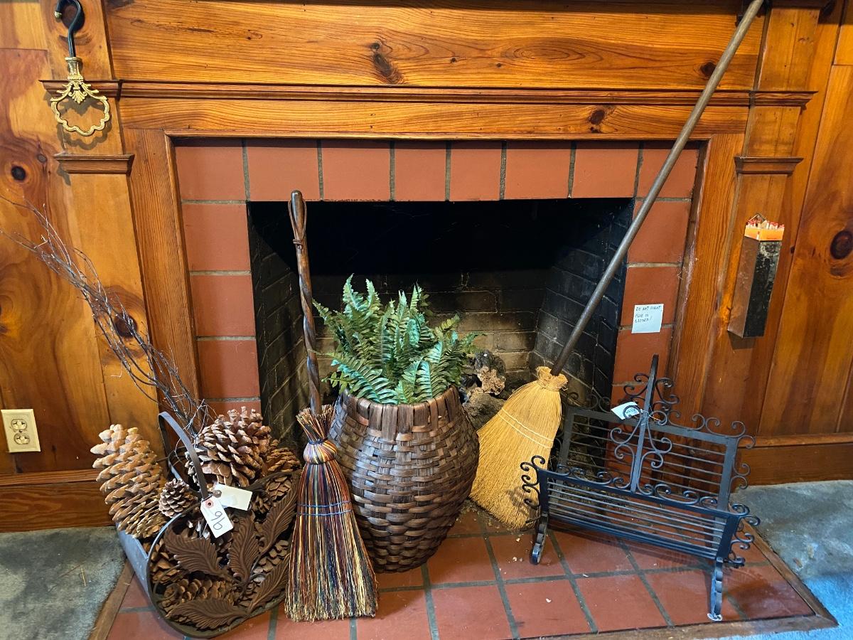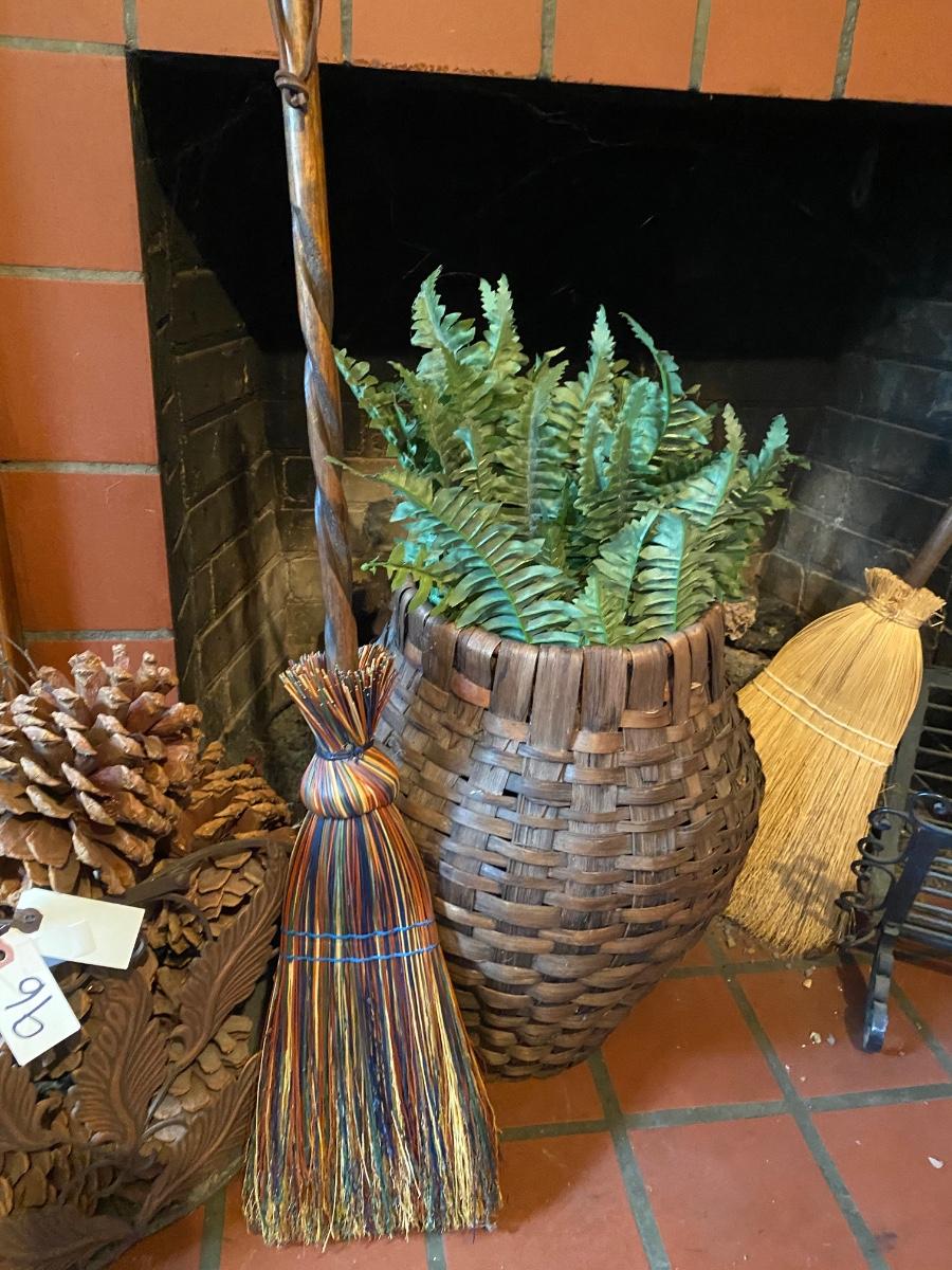 Misc Home Décor Lot Includes 2 Brooms, 2 Baskets, and Small Log Holder As Pictured