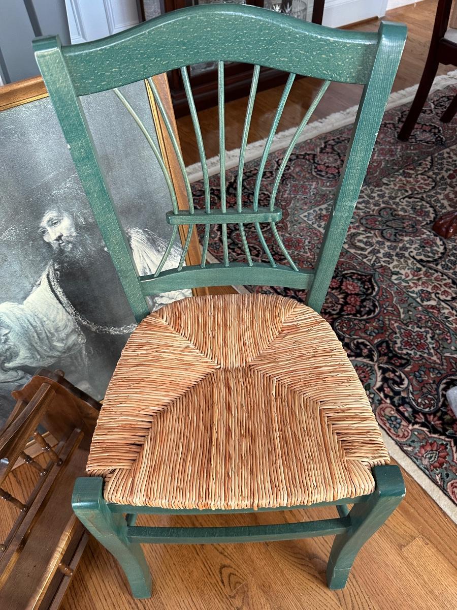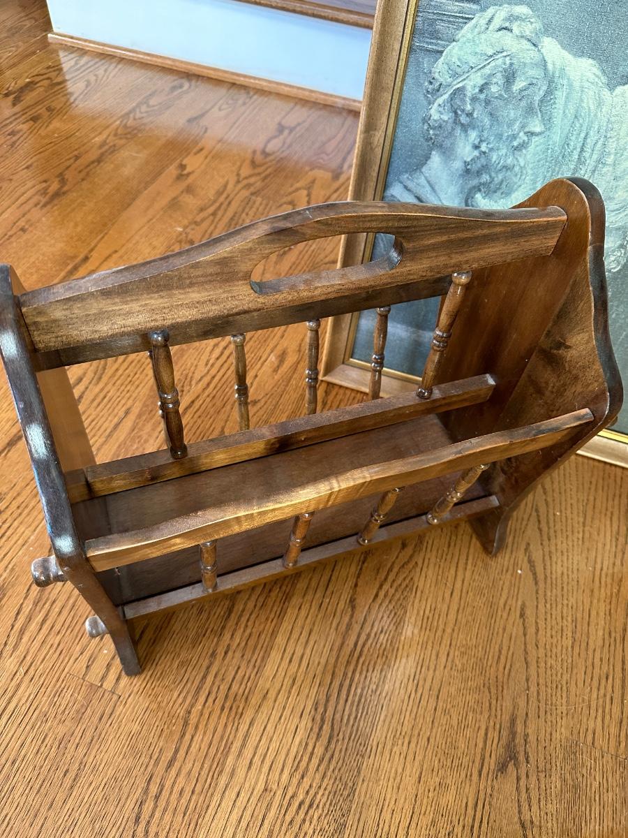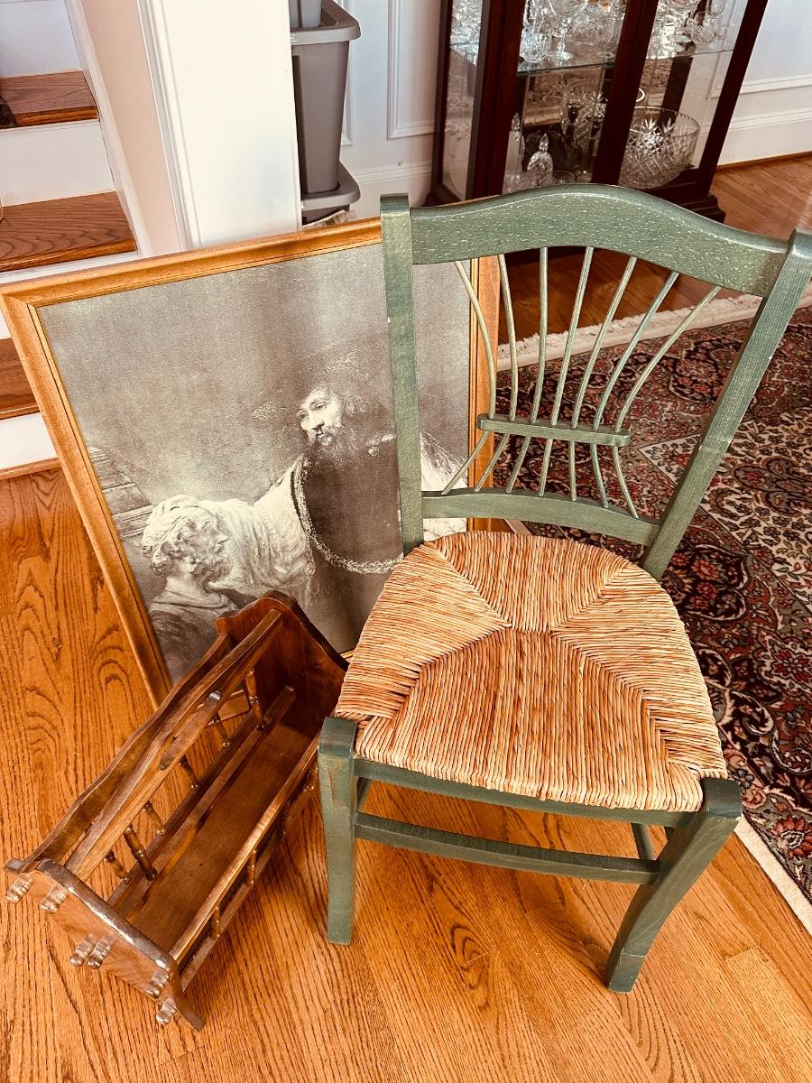 Green dining chair 16x16x34t Magazine rack 16x18x9 Gold framed print 30x24