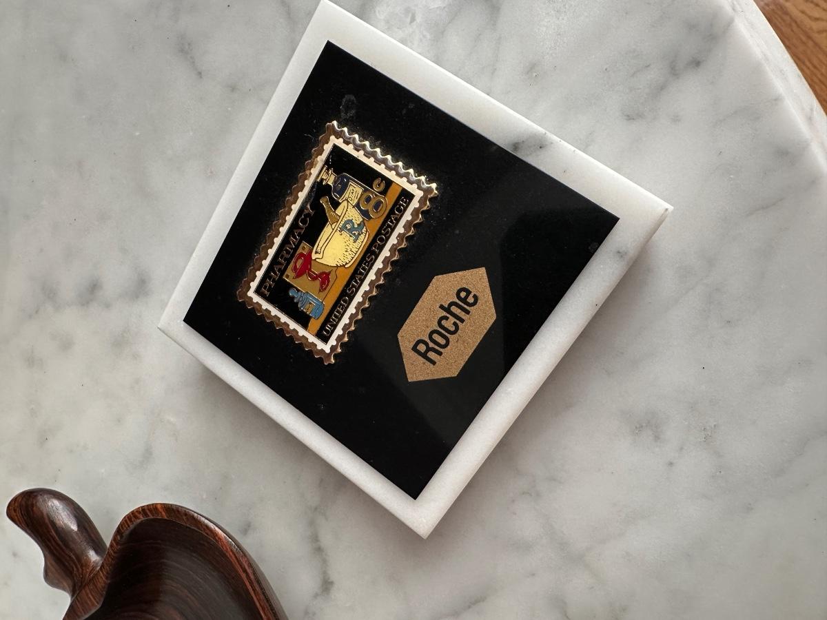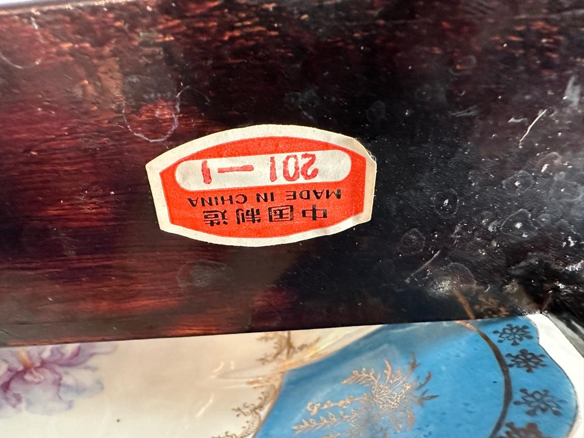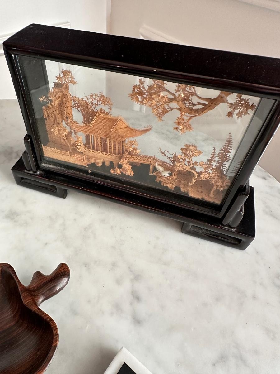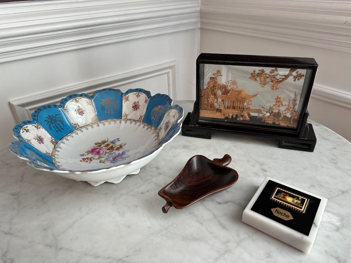 Misc lot includes antique bowl, Roche paperweight stamp, pear wood bowl, Chinese Diorama