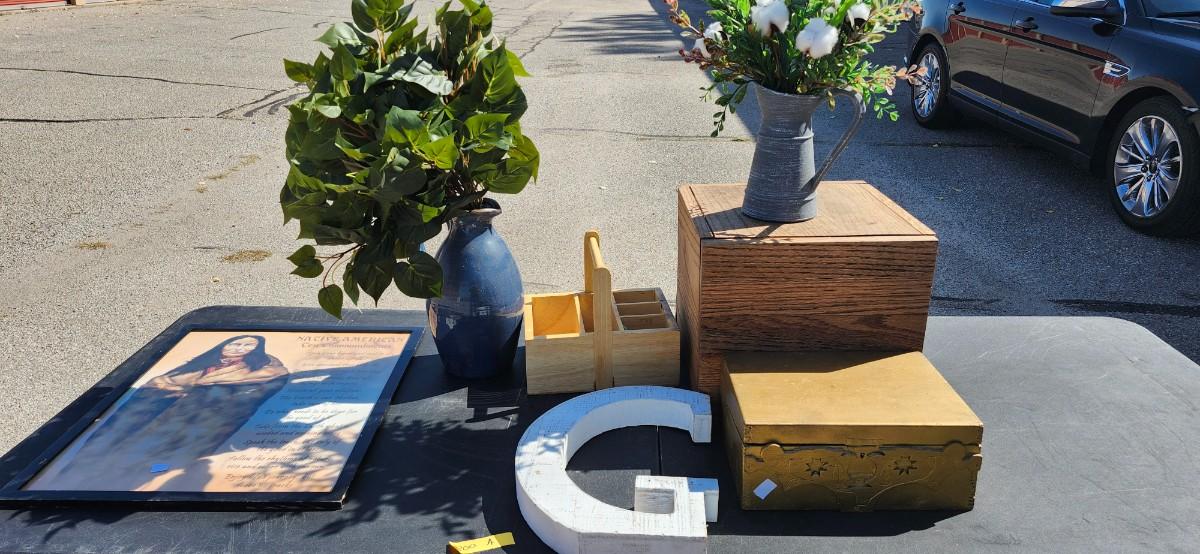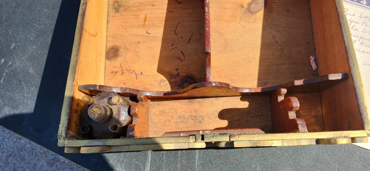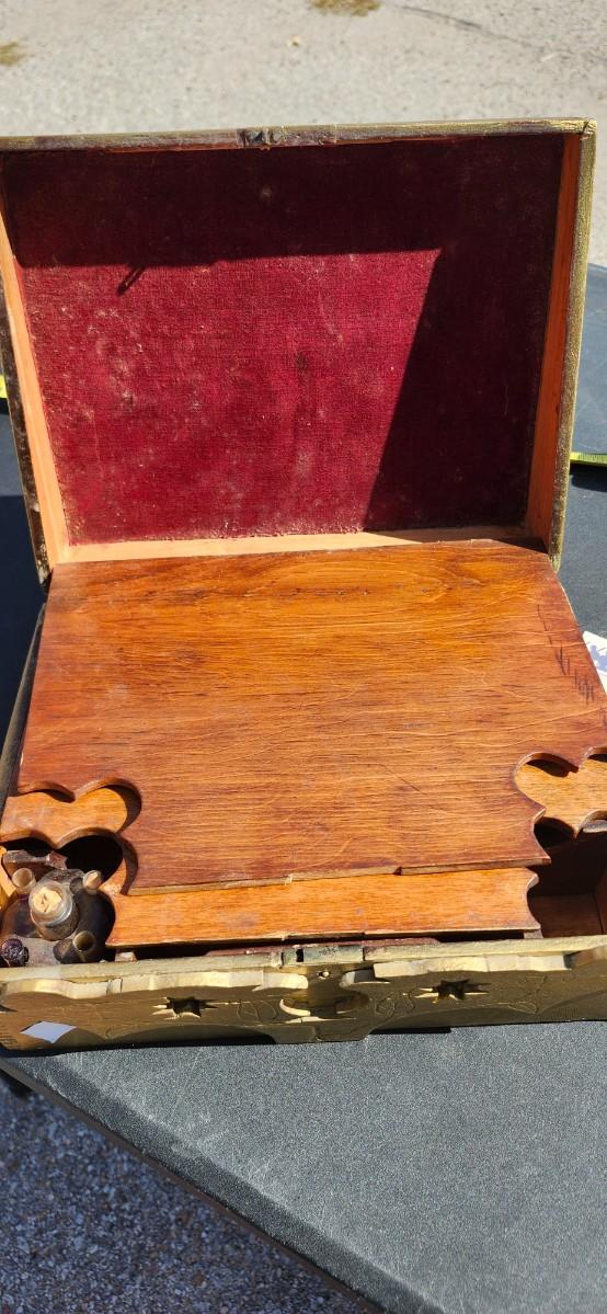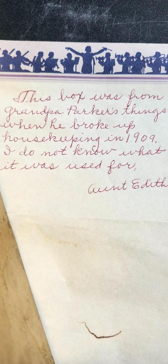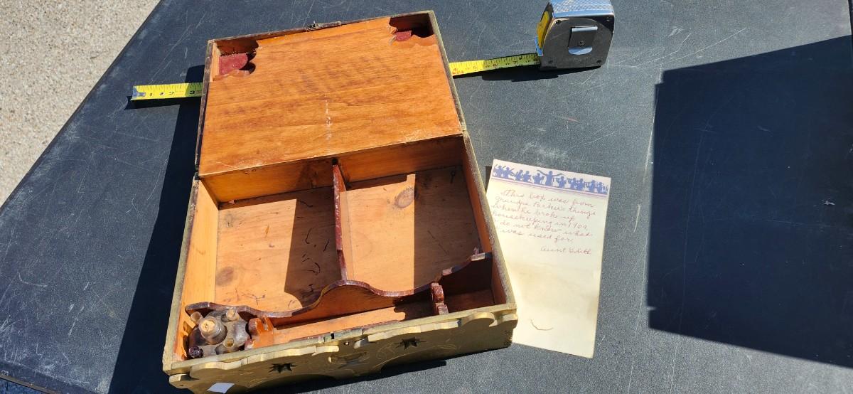 Home Deco lot, including vintage wooden box hand written note dated 1909