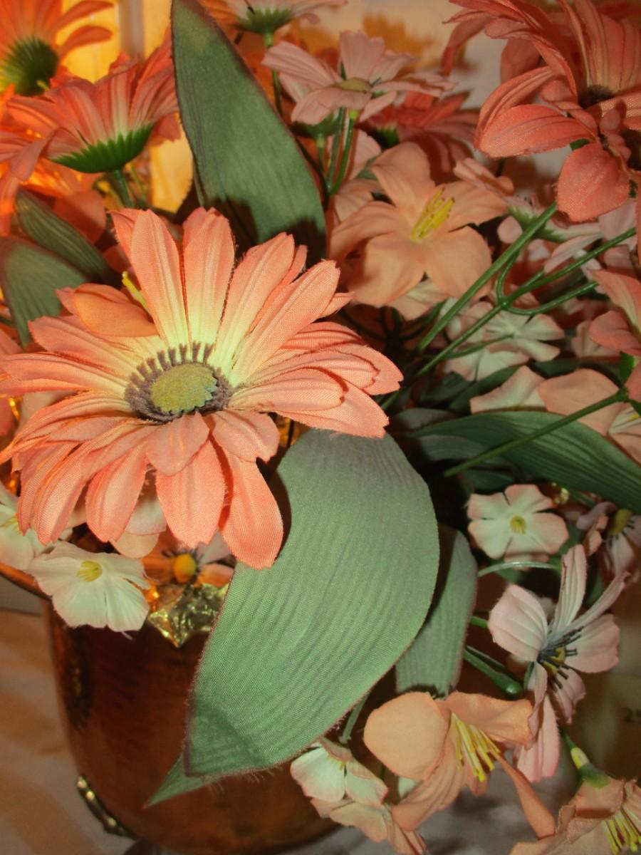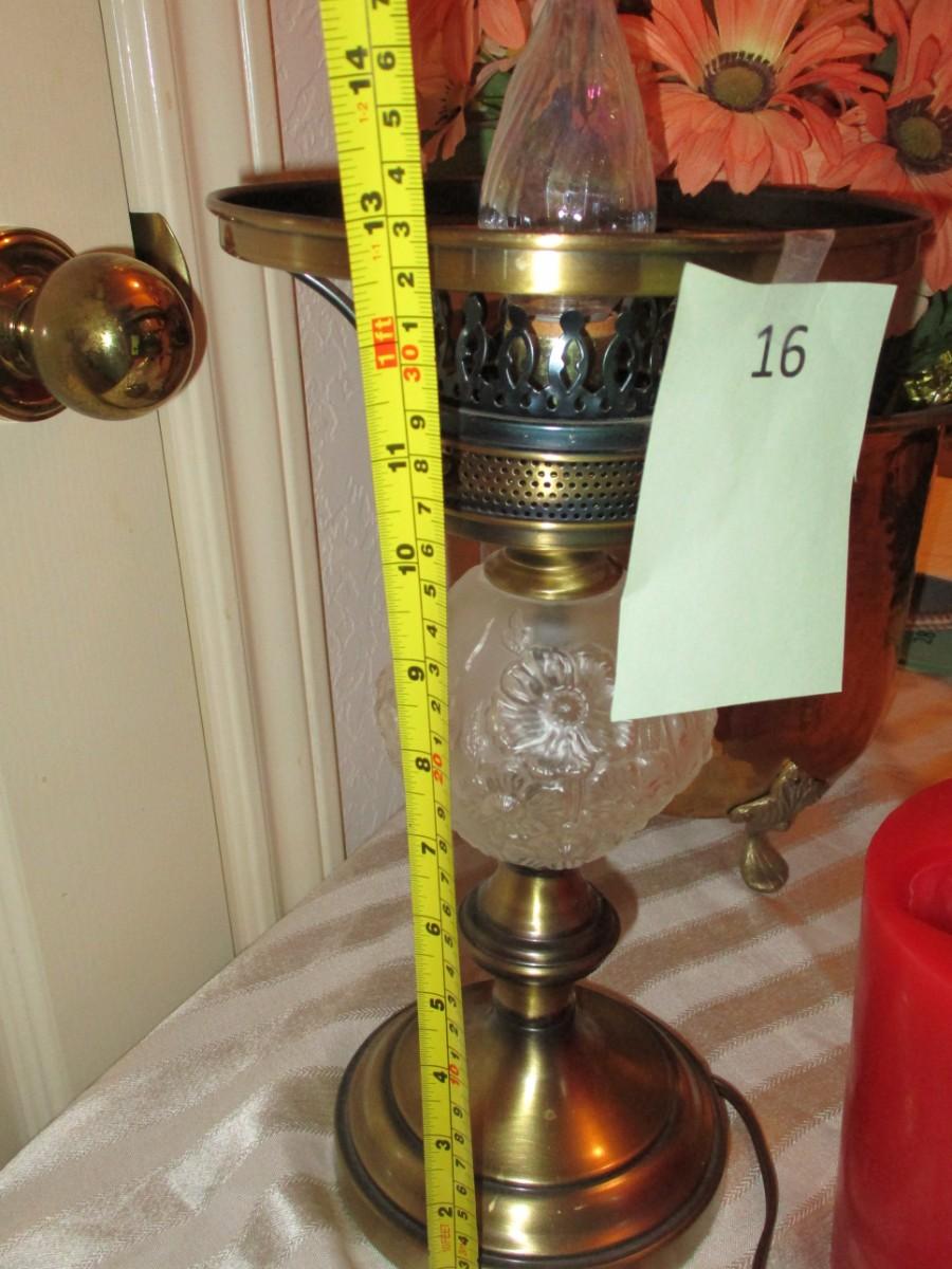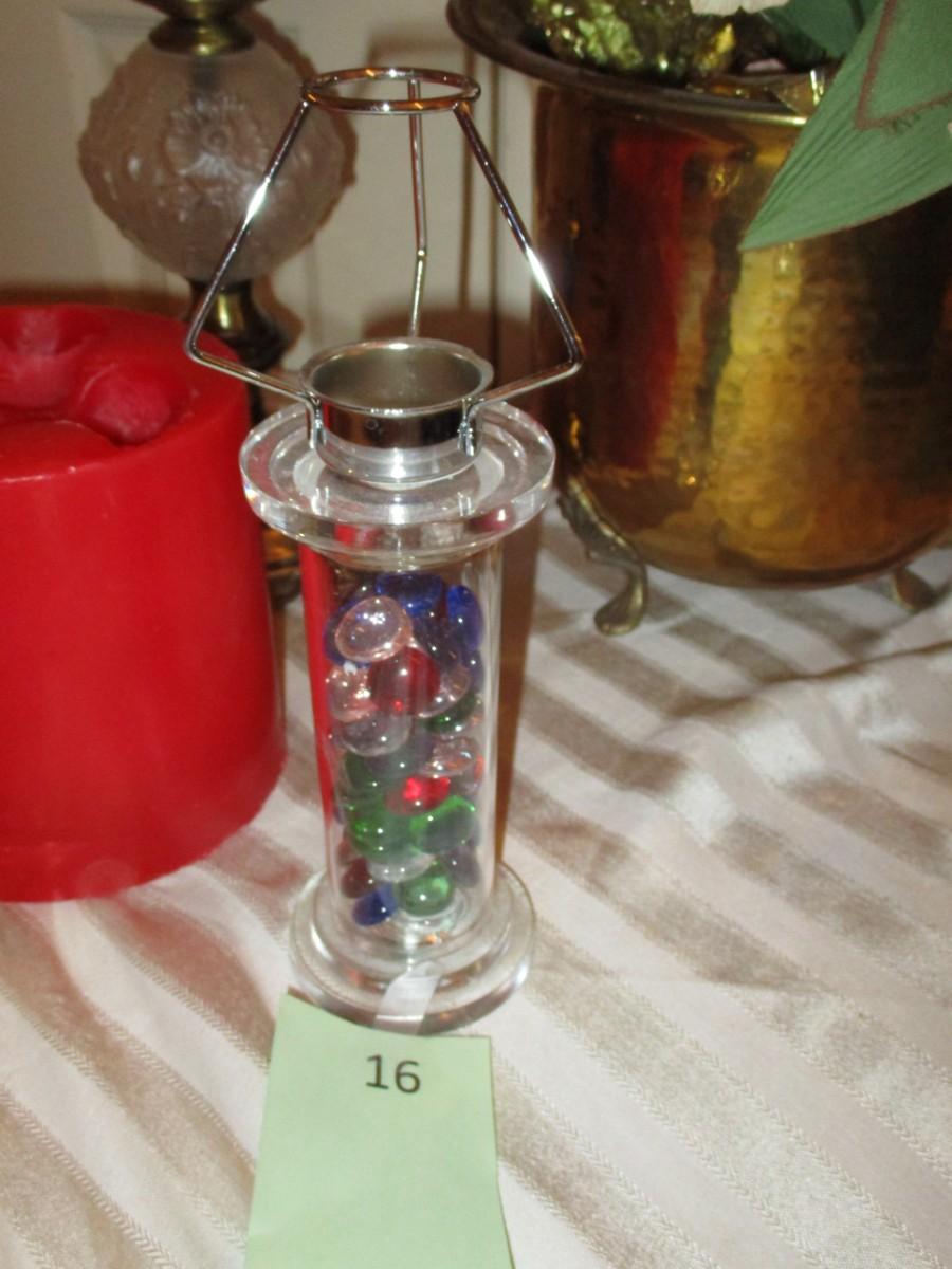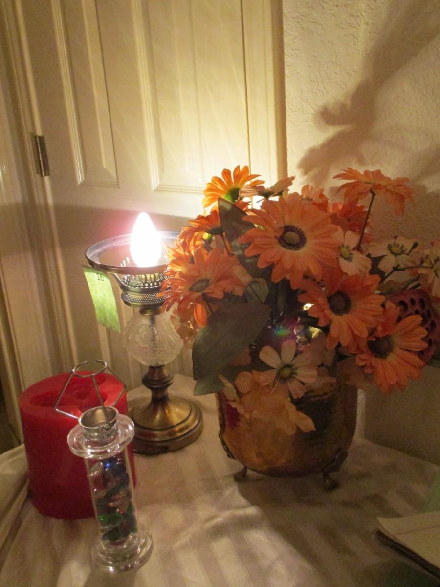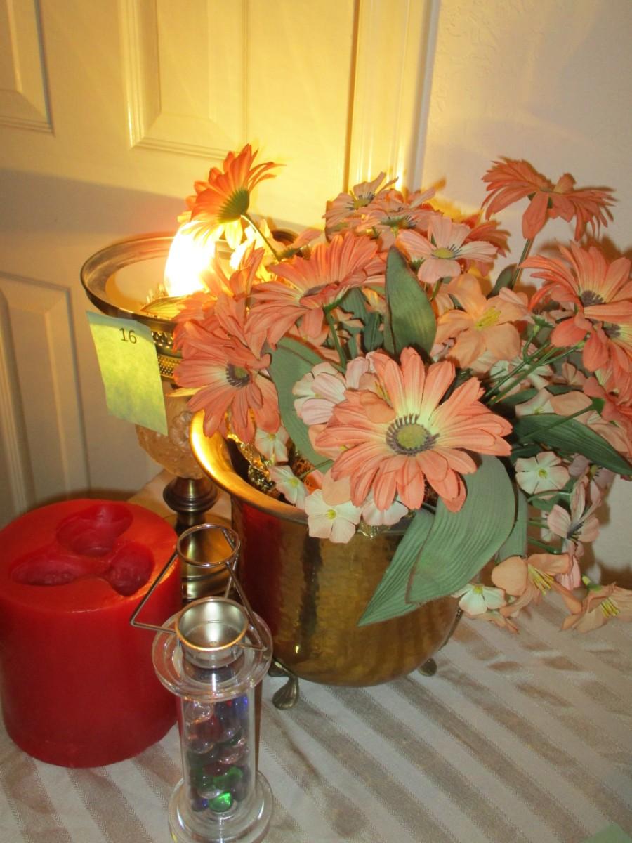 Faux planted flowers. Large candle. Table lamp w/brass base (no shade).