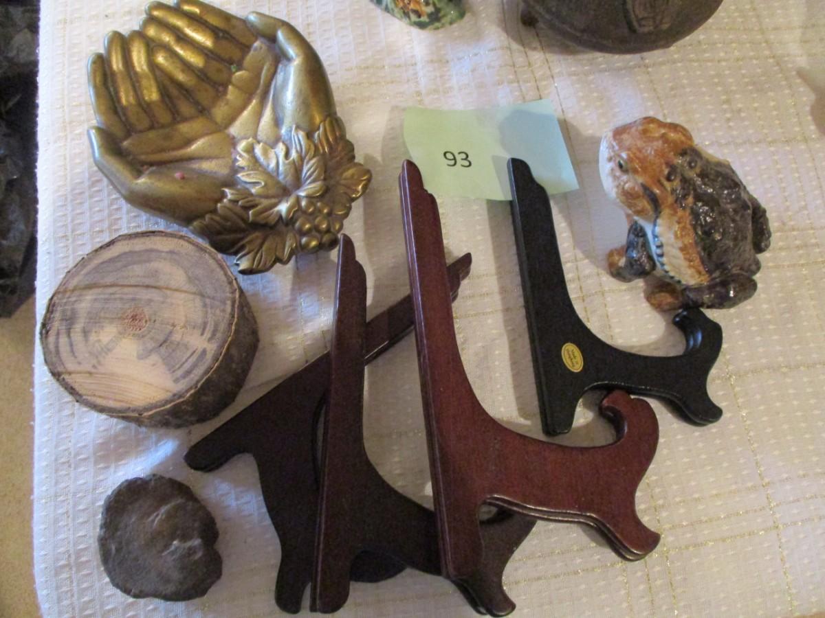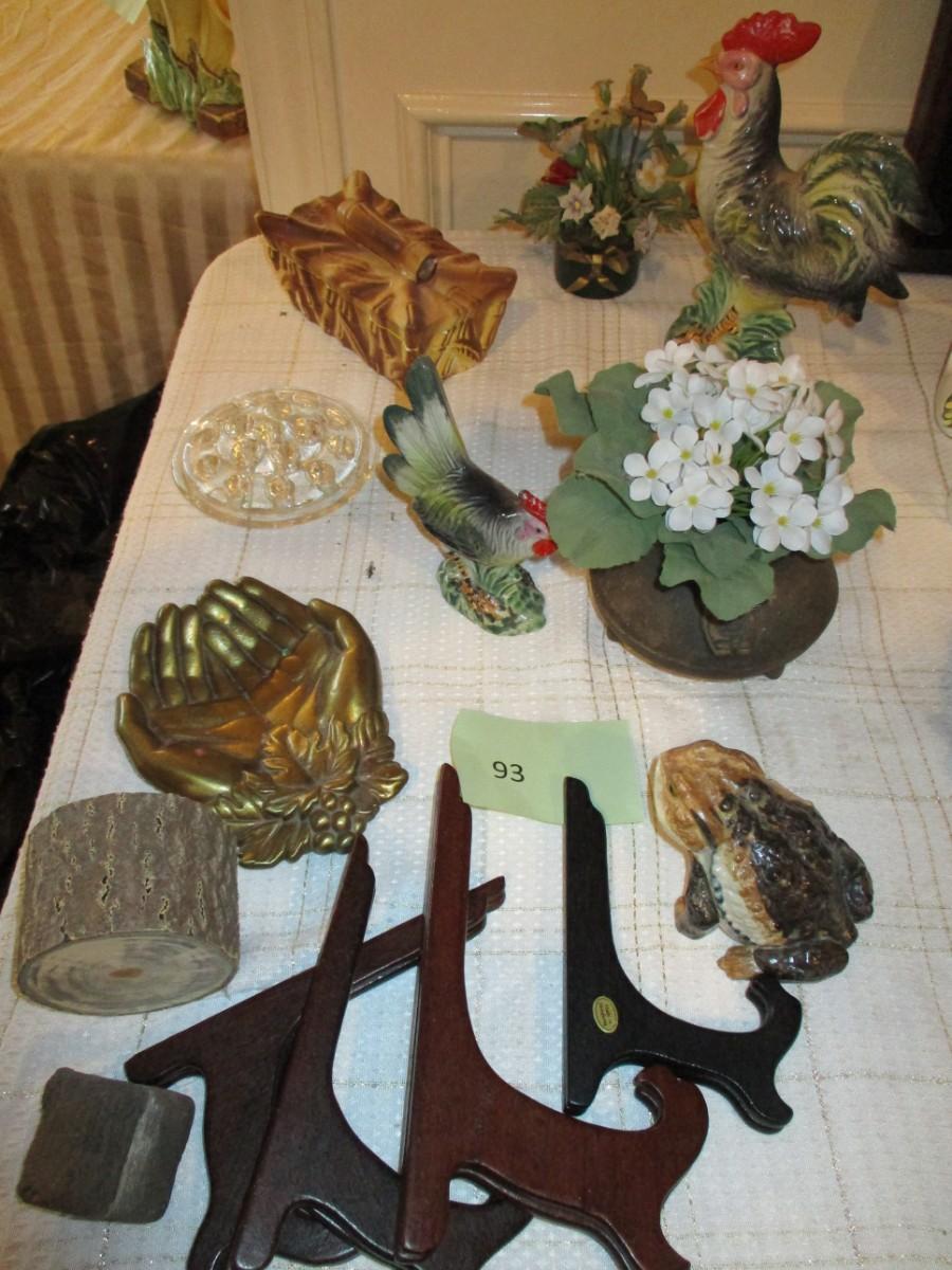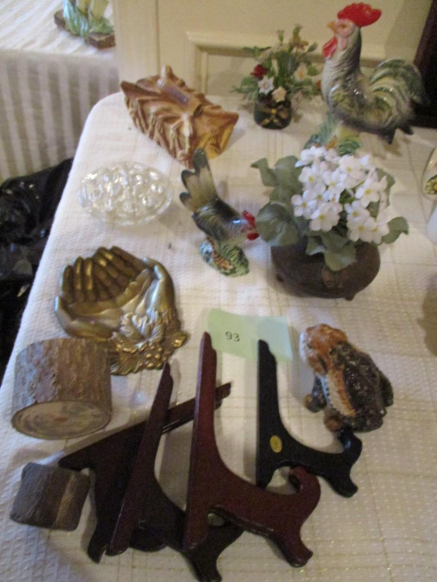Plate stands. brass prayer hands. Roosters. Wooden toad.