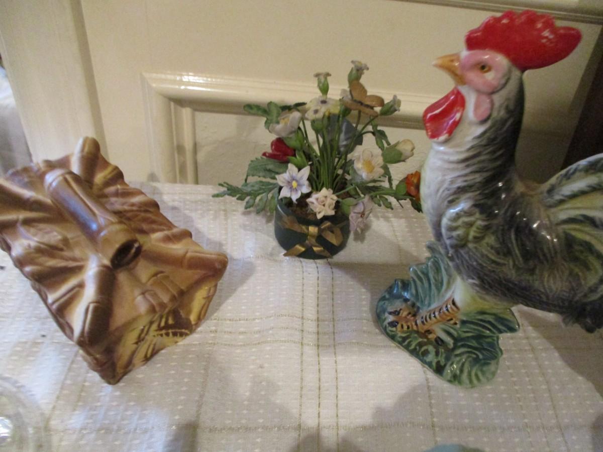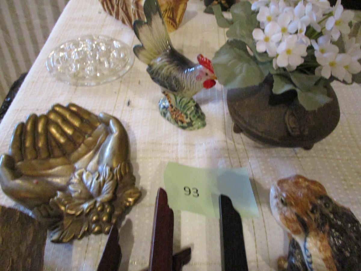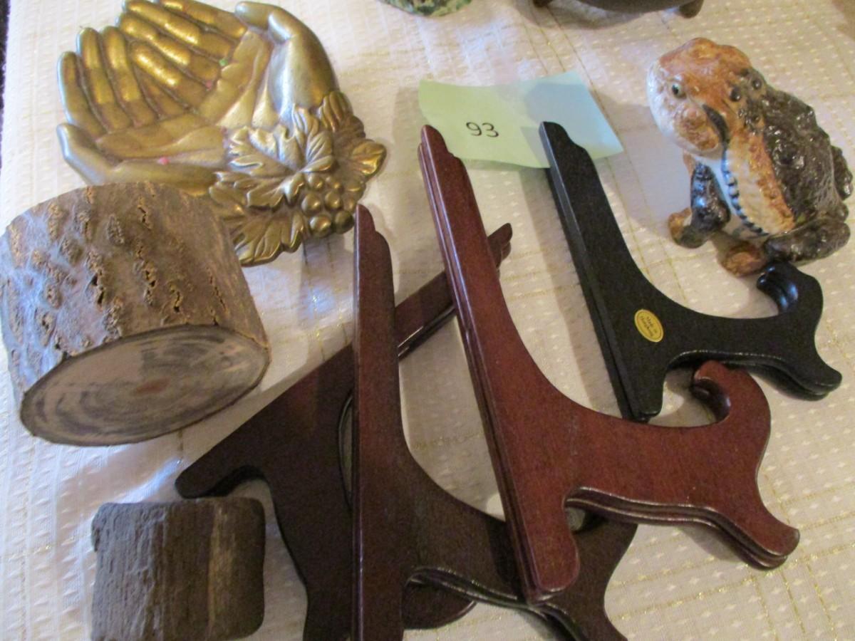 Plate stands. brass prayer hands. Roosters. Wooden toad.