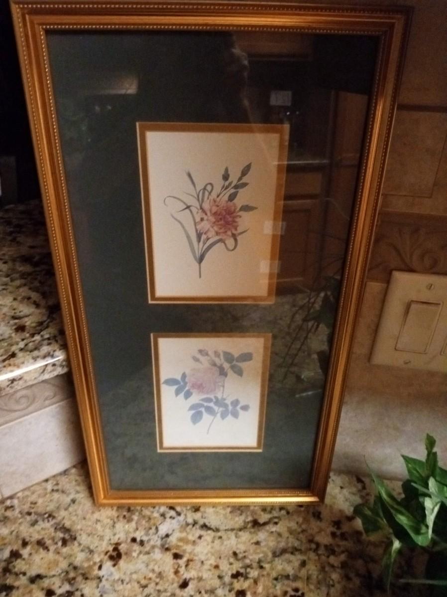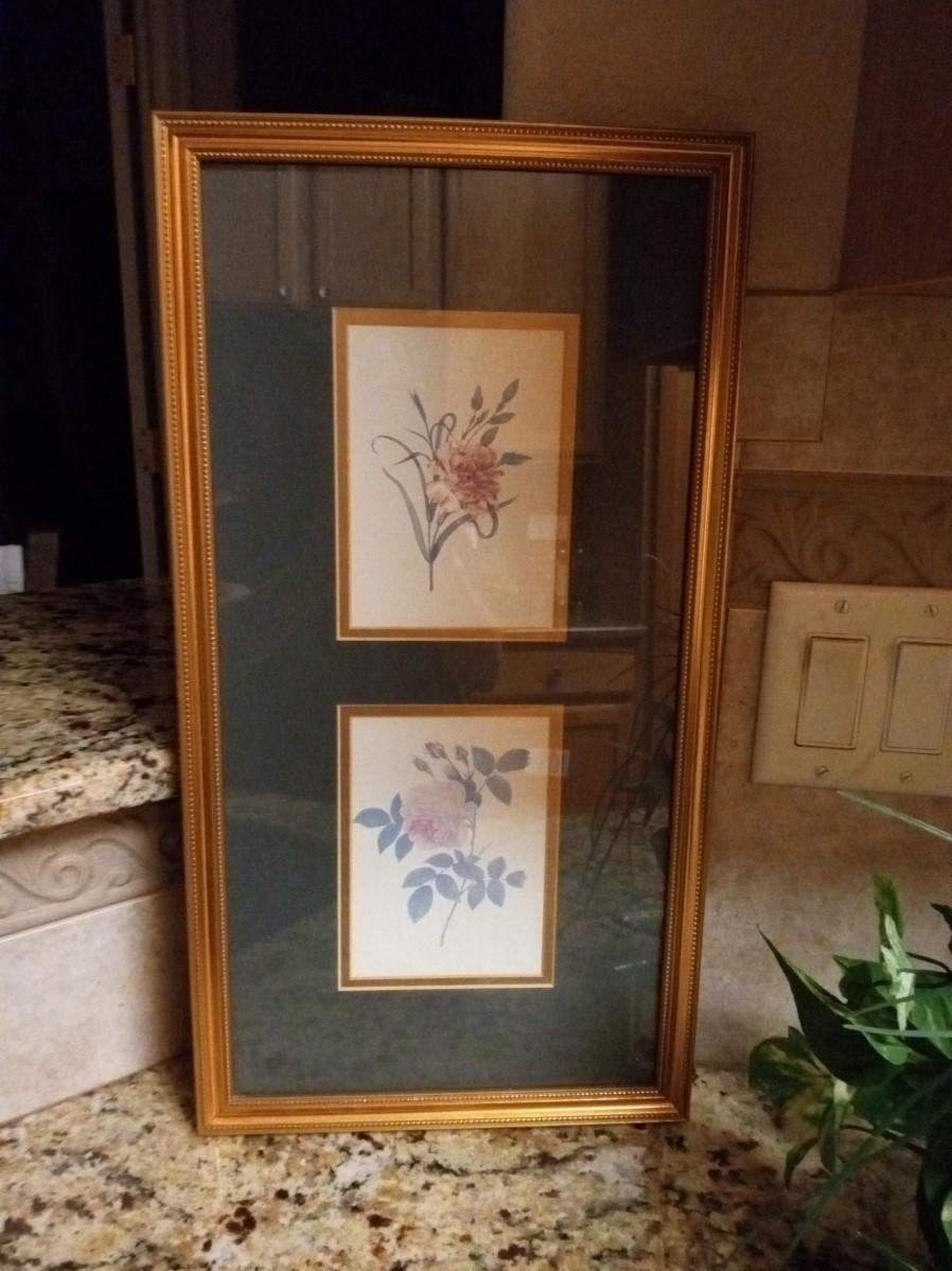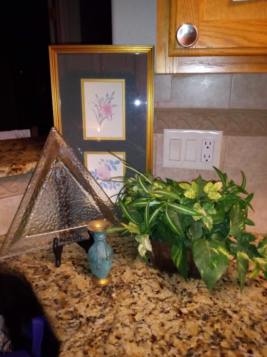 FAUX PLANT IN A TIN PLANTER, TRIANGLE SHAPED GLASS PLATTER, FRAMED PICTURES OF FLOWERS AND A BRASS VASE