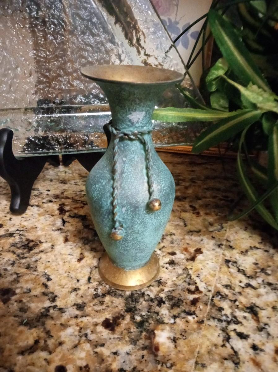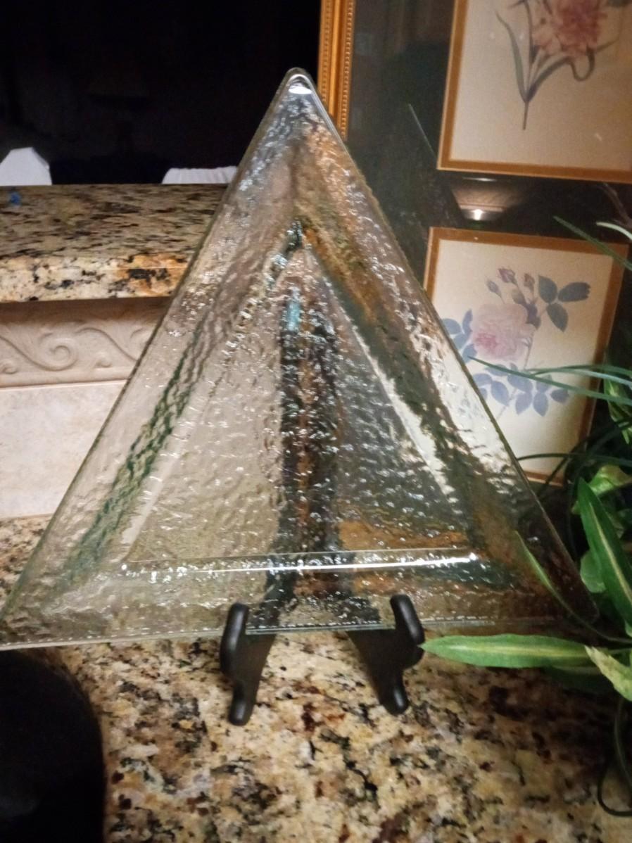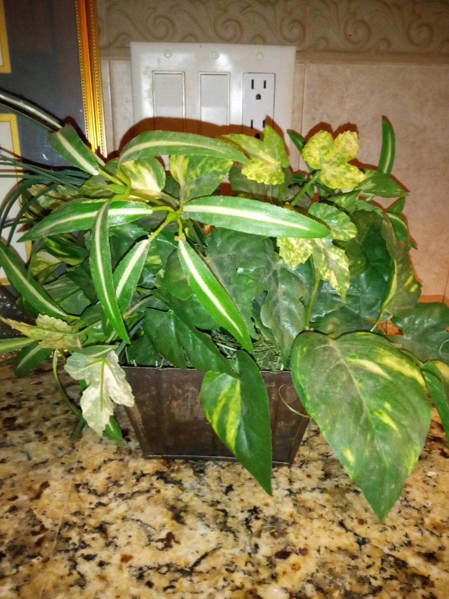 FAUX PLANT IN A TIN PLANTER, TRIANGLE SHAPED GLASS PLATTER, FRAMED PICTURES OF FLOWERS AND A BRASS VASE