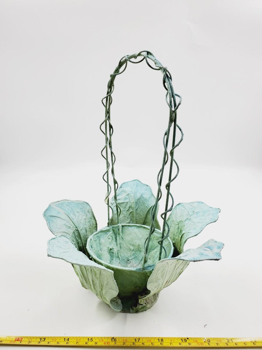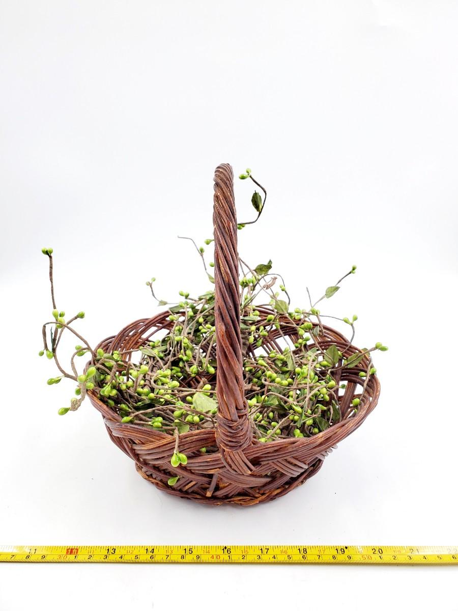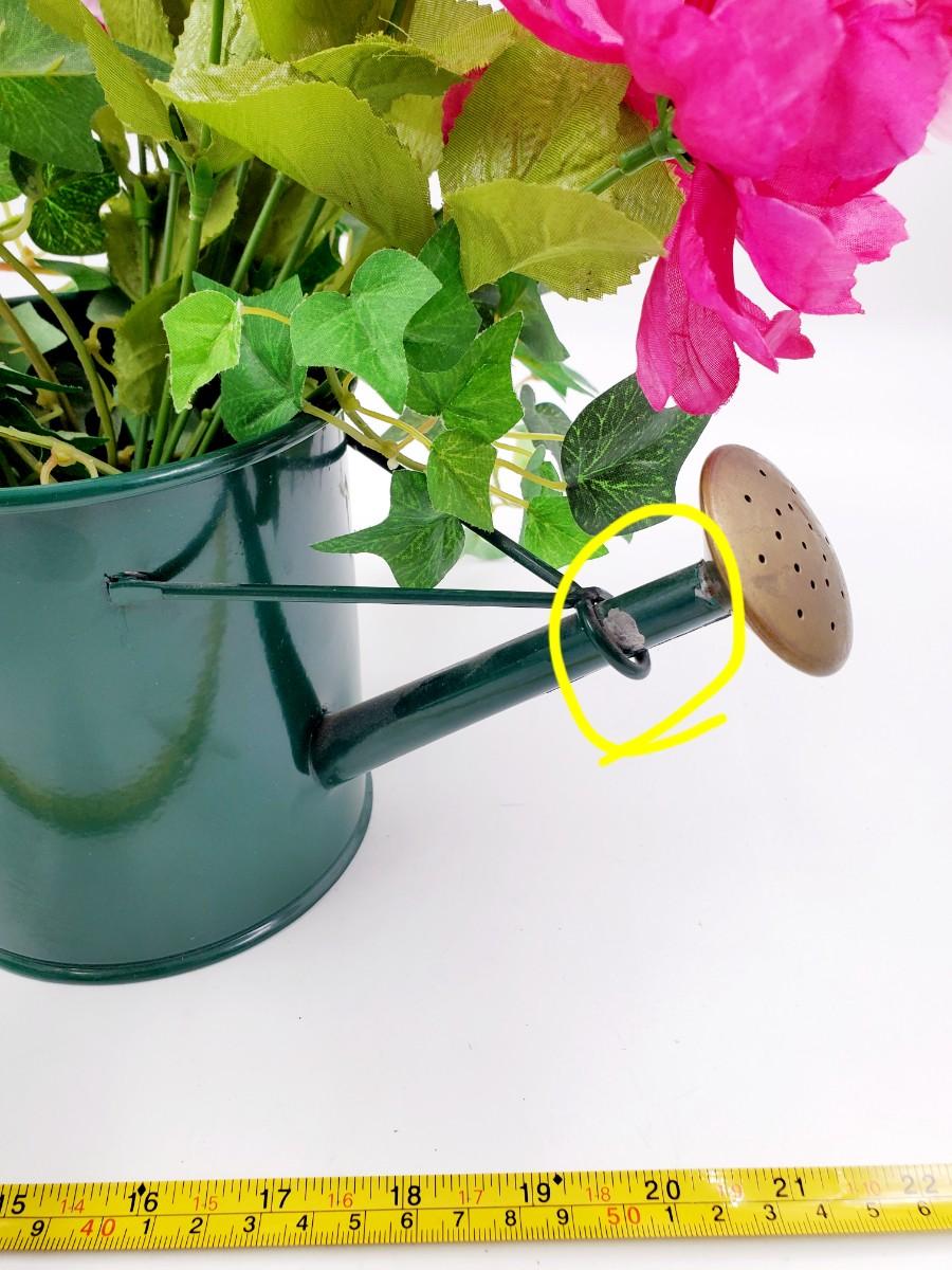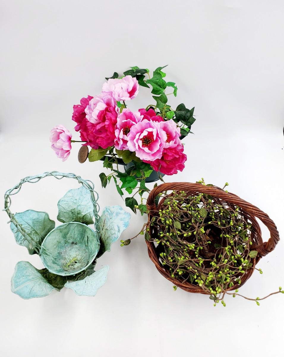 1 green pitcher type can with greenery and flowers, small flaw to the paint, see photo. 1 cabbage type basket and a brown basket with green pip Garland. Add a little garden flair to your home with these adorable decorative pieces!