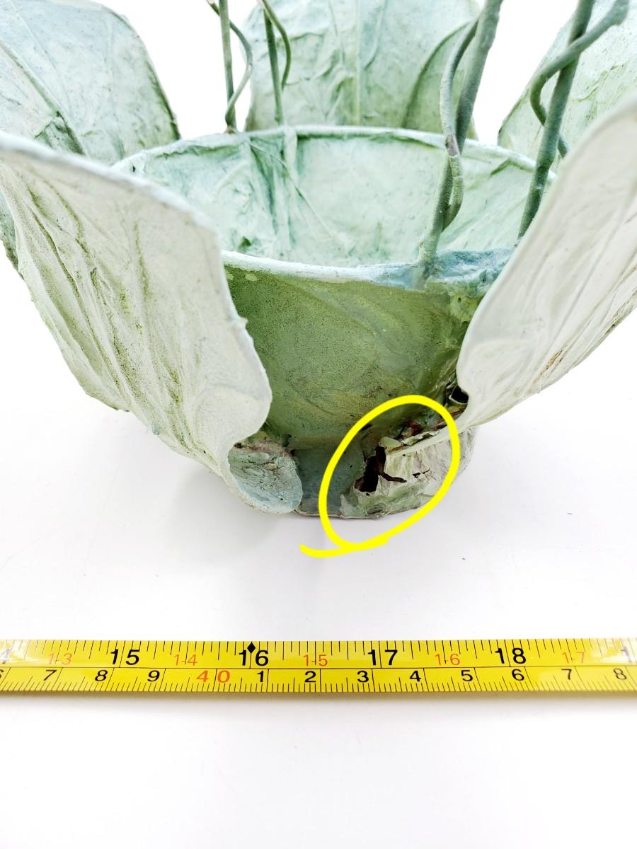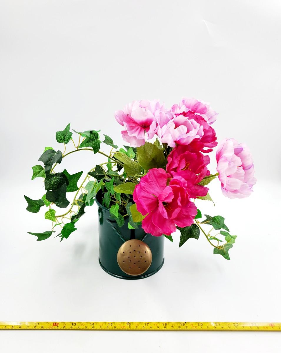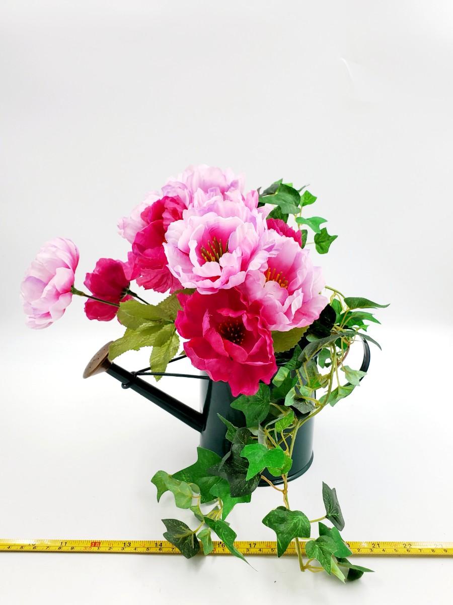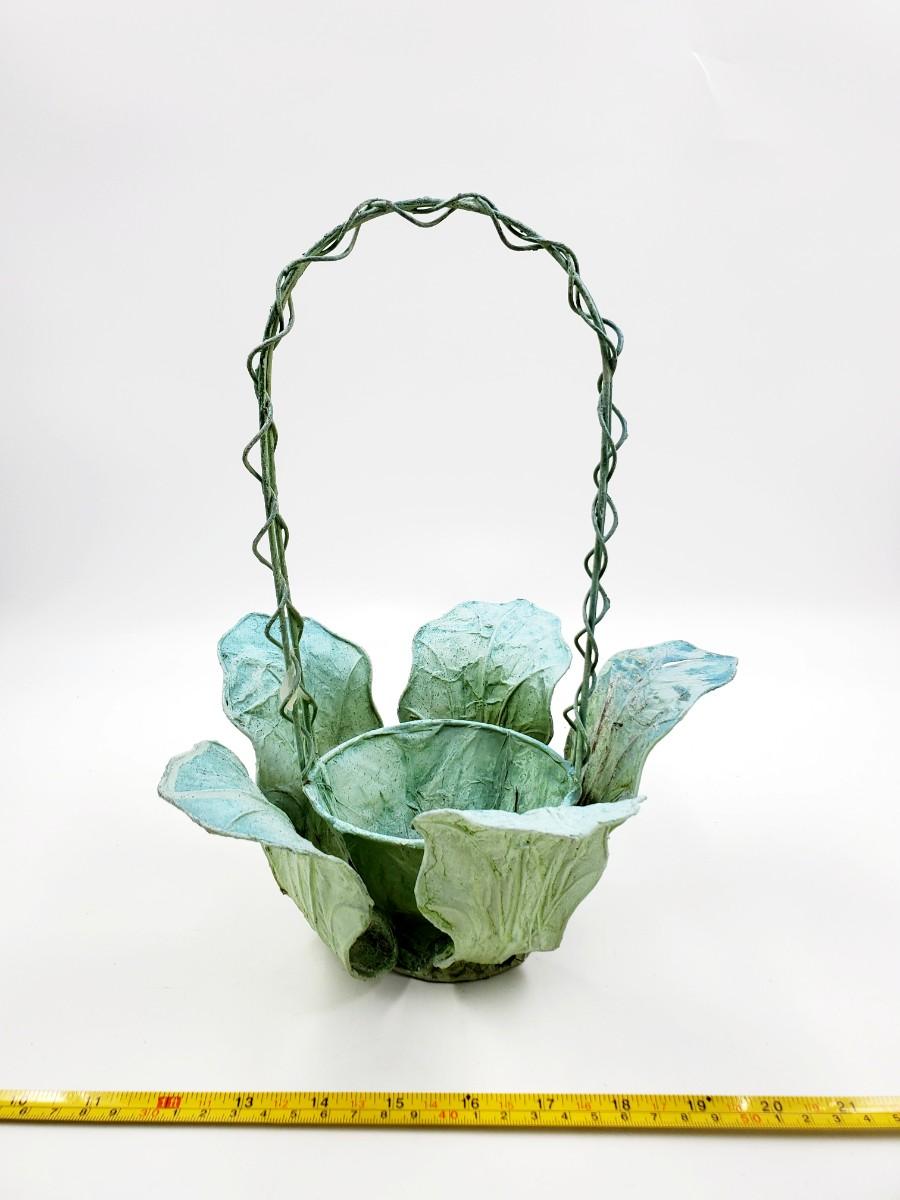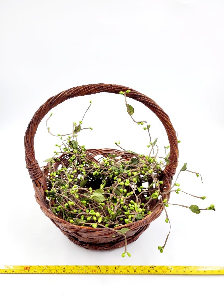 1 green pitcher type can with greenery and flowers, small flaw to the paint, see photo. 1 cabbage type basket and a brown basket with green pip Garland. Add a little garden flair to your home with these adorable decorative pieces!